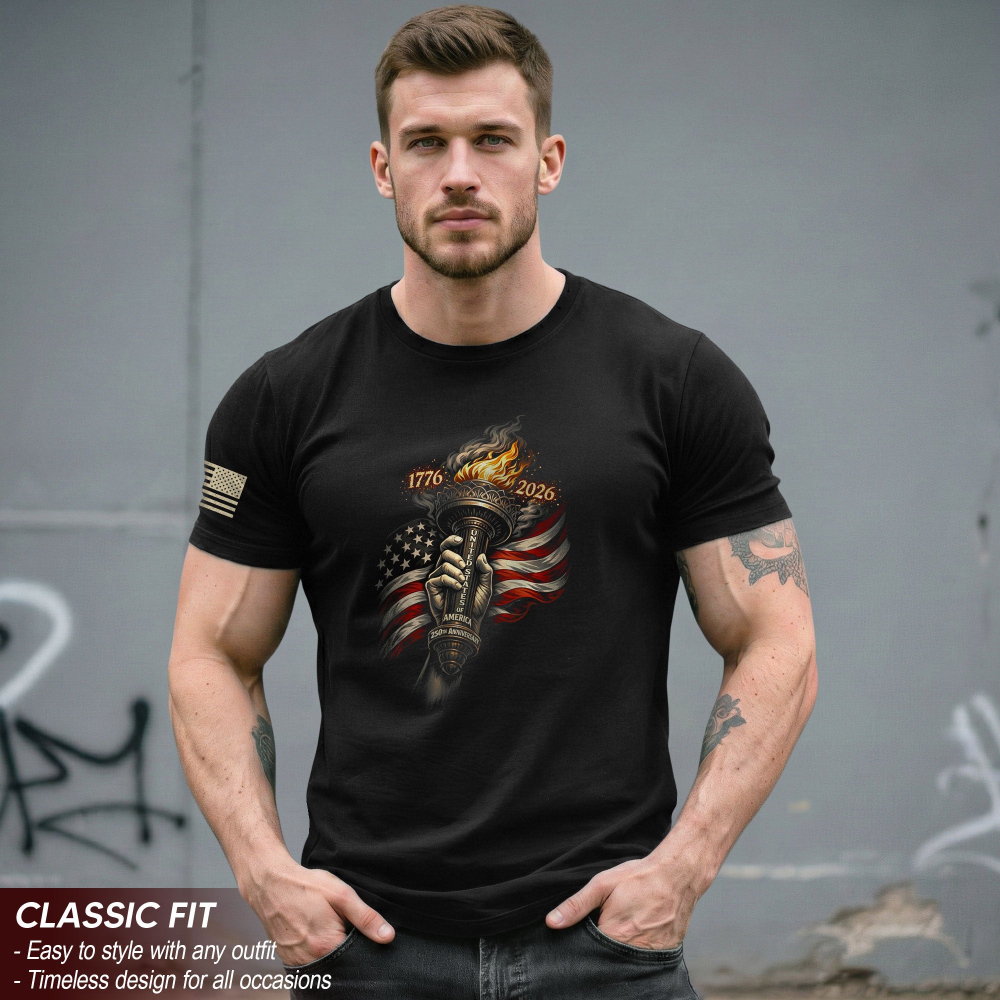 Celebrate America’s 250th anniversary from 1776 to 2026 with this patriotic T-shirt featuring the iconic Statue of Liberty torch and waving USA flag. Crafted from premium, soft cotton for all-day comfort, this timeless tee honors a quarter-millennium of American hope, courage, and national pride. Perfect for Independence Day celebrations, historical events, veterans, history buffs, or everyday wear to show your patriotic spirit. Bold graphic design ensures vibrant colors that won’t fade after multiple washes. Available in multiple sizes for men, women, and unisex fit. Ideal for barbecues, parades, rallies, or casual outings. Machine washable and durable for long-lasting wear. Embrace the semiquincentennial milestone with this freedom-inspired graphic tee.