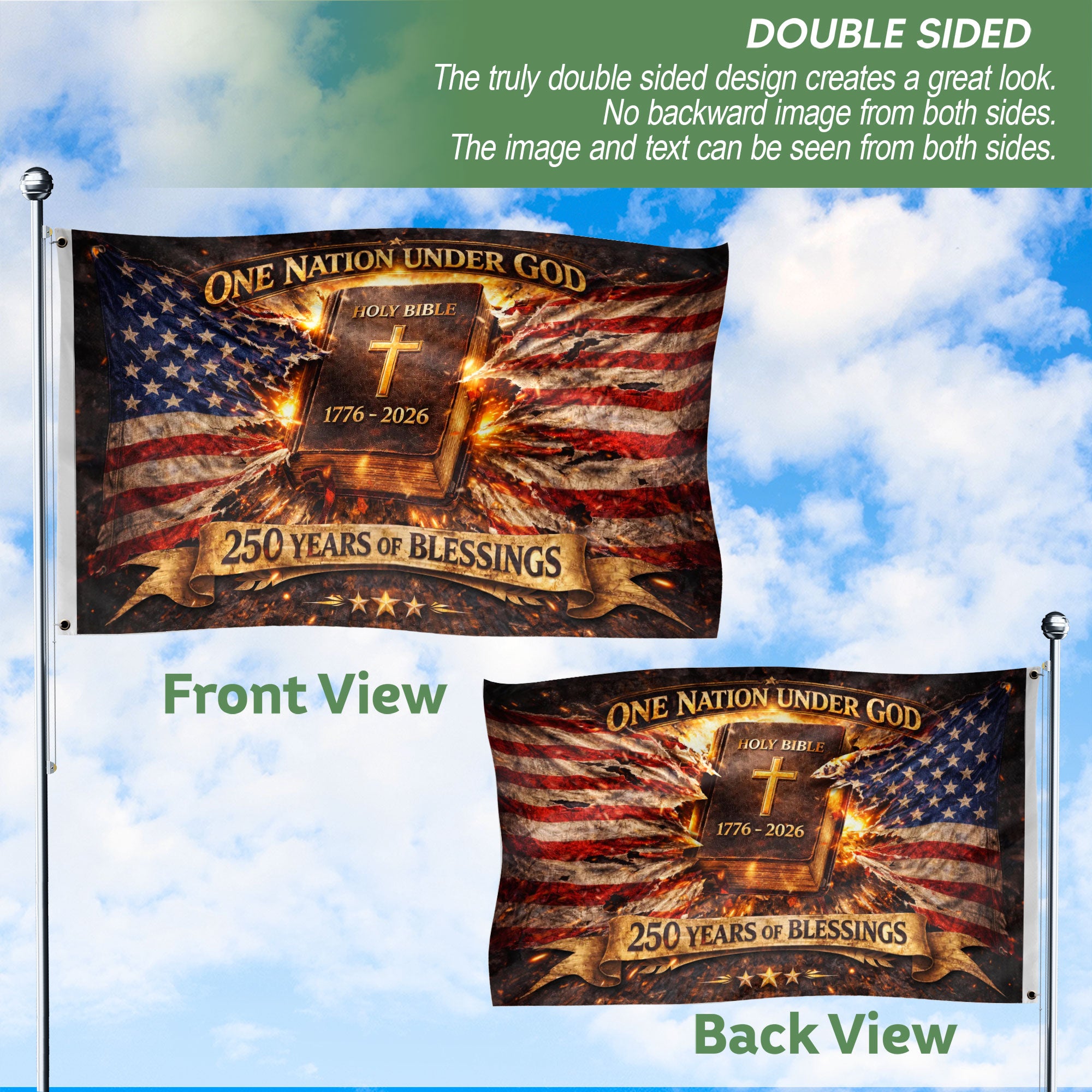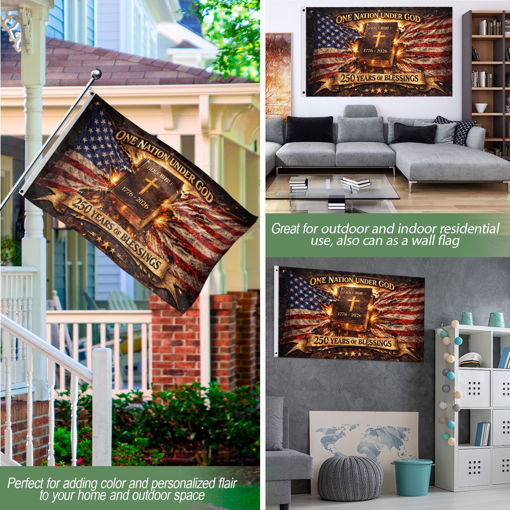 Celebrate America’s 250th anniversary from 1776 to 2026 with this meaningful One Nation Under God house flag. Featuring 250 Years of Blessings and Holy Bible America design, this double-sided flag honors the nation’s spiritual foundation, history, and unity. Crafted for durability, it displays clearly from both sides, making it perfect for porches, patios, or gardens. Ideal for patriots, Christians, and history enthusiasts to show pride in the USA’s enduring values and blessings. Easy to hang with standard house flag hardware.