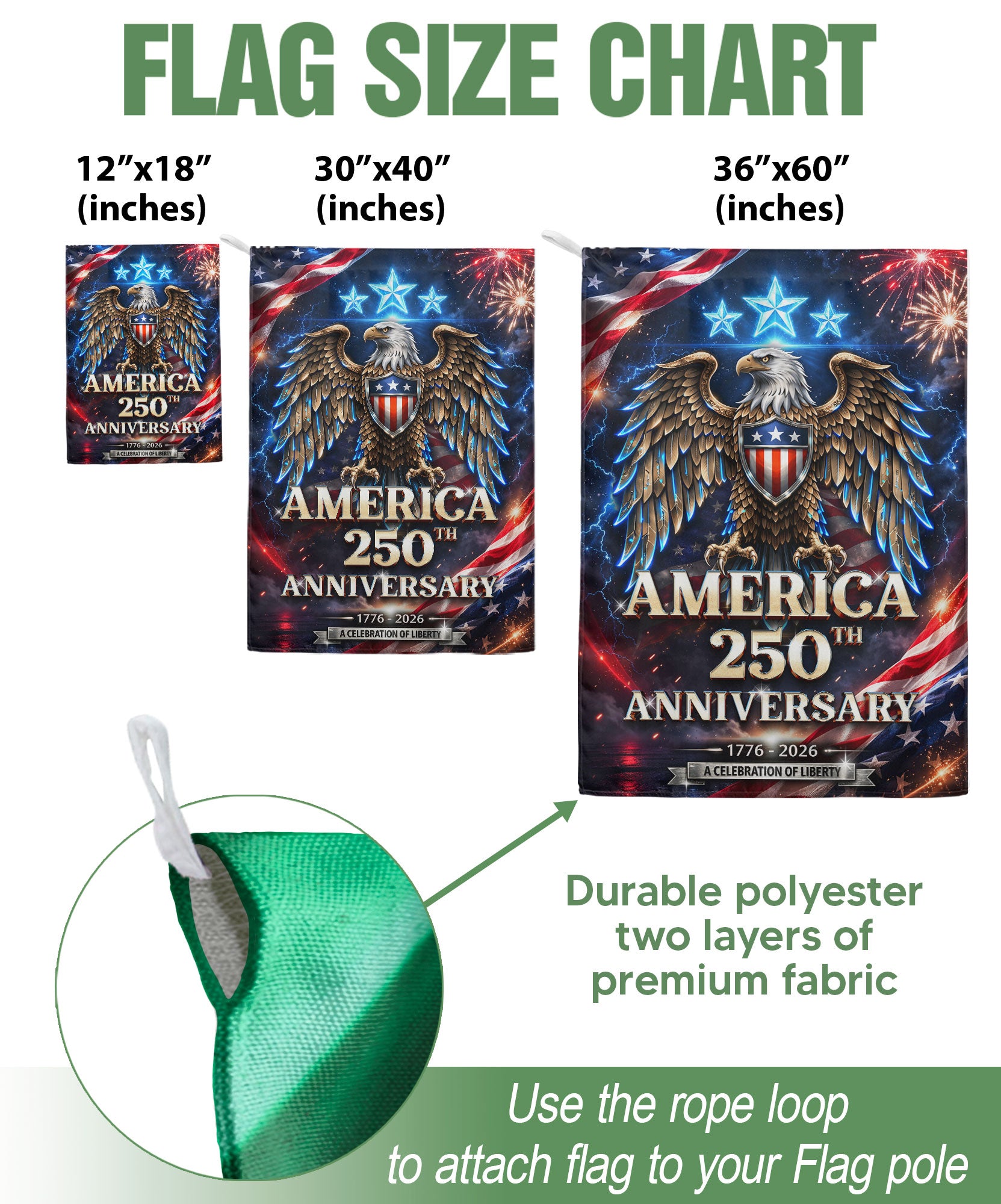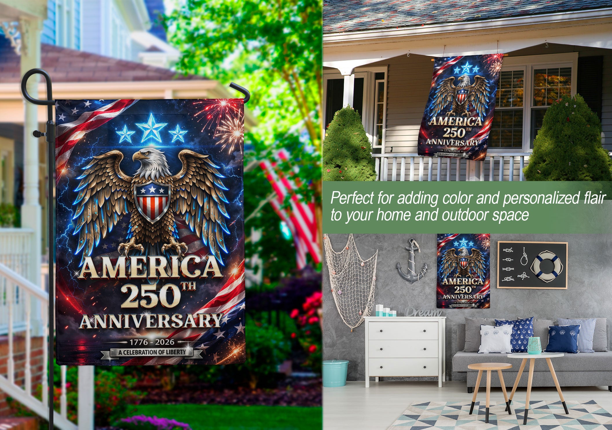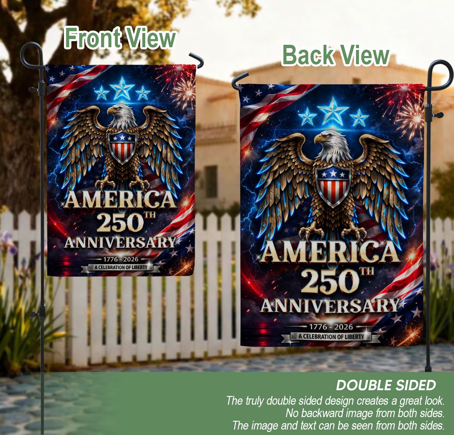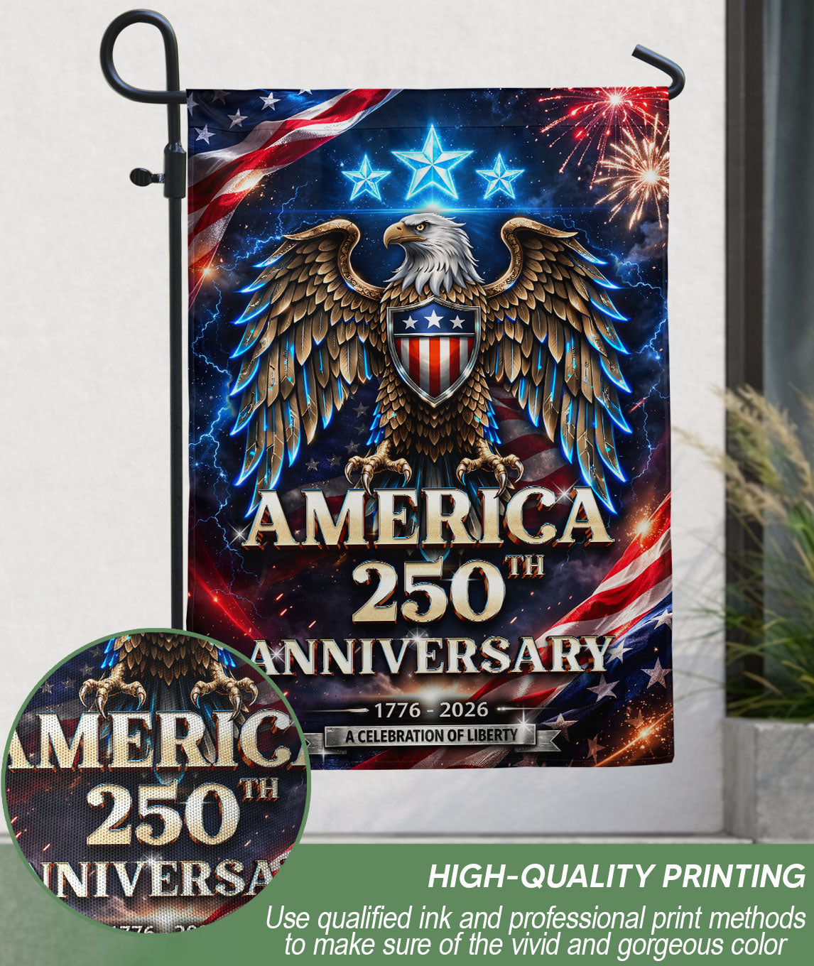 Celebrate America’s 250th anniversary with this striking double-sided garden flag featuring a majestic bald eagle soaring beneath vibrant fireworks bursts. Crafted for outdoor durability, this patriotic banner honors 250 years of strength, freedom, and national pride from 1776 to 2026. Perfect for gardens, porches, patios, or yards, it withstands weather elements while making a bold statement. High-quality polyester material ensures vivid colors and clear printing on both sides. Ideal for Independence Day, Memorial Day, Fourth of July, or everyday display of American spirit. Easy to hang with a standard garden flag pole (not included). Show your patriotism with this dynamic 250th anniversary design.