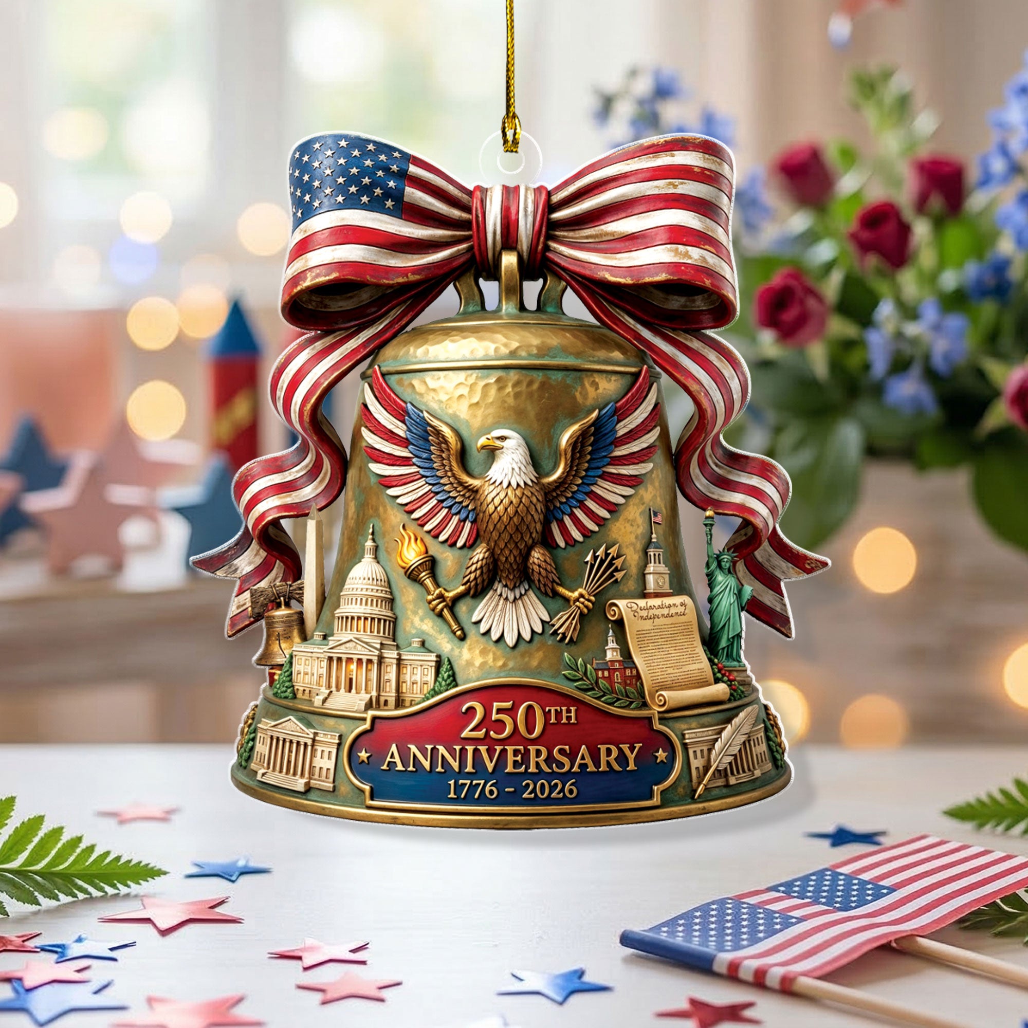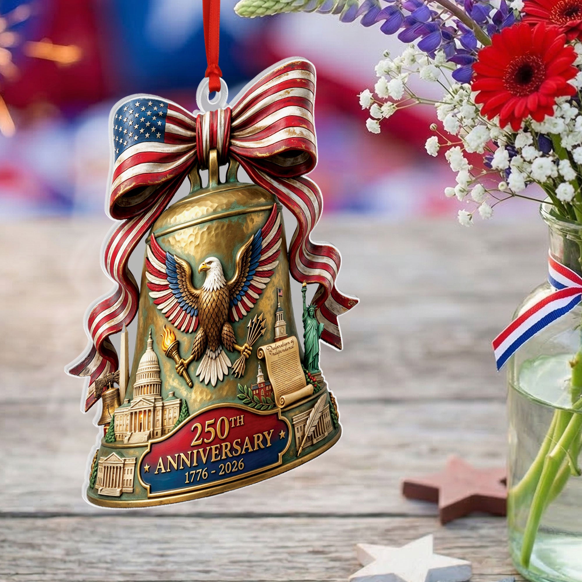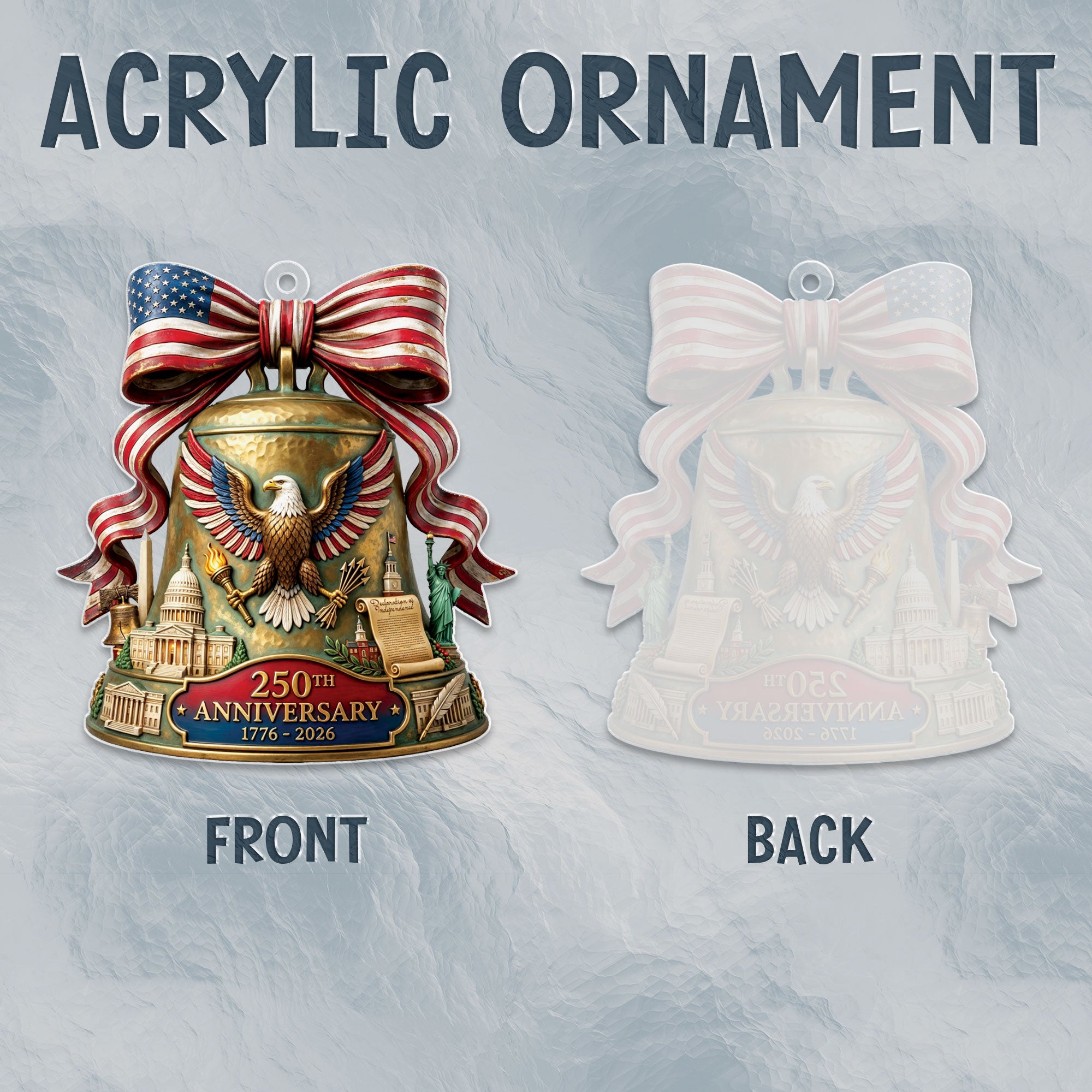 Celebrate the 250th anniversary of the United States in 2026 with this beautifully crafted acrylic ornament. Featuring iconic American symbols including the majestic bald eagle, the historic U.S. Capitol building, and the legendary Liberty Bell, this ornament captures the spirit of American independence and patriotism. Made from durable, high-quality clear acrylic for a stunning translucent effect that catches the light beautifully. Ideal for hanging on your Christmas tree, displaying in a window, or as part of a patriotic home decor collection. Perfect as a thoughtful gift for history enthusiasts, veterans, or anyone proud of American heritage. Lightweight and easy to hang with included string loop. Commemorate this once-in-a-lifetime milestone with a timeless keepsake.