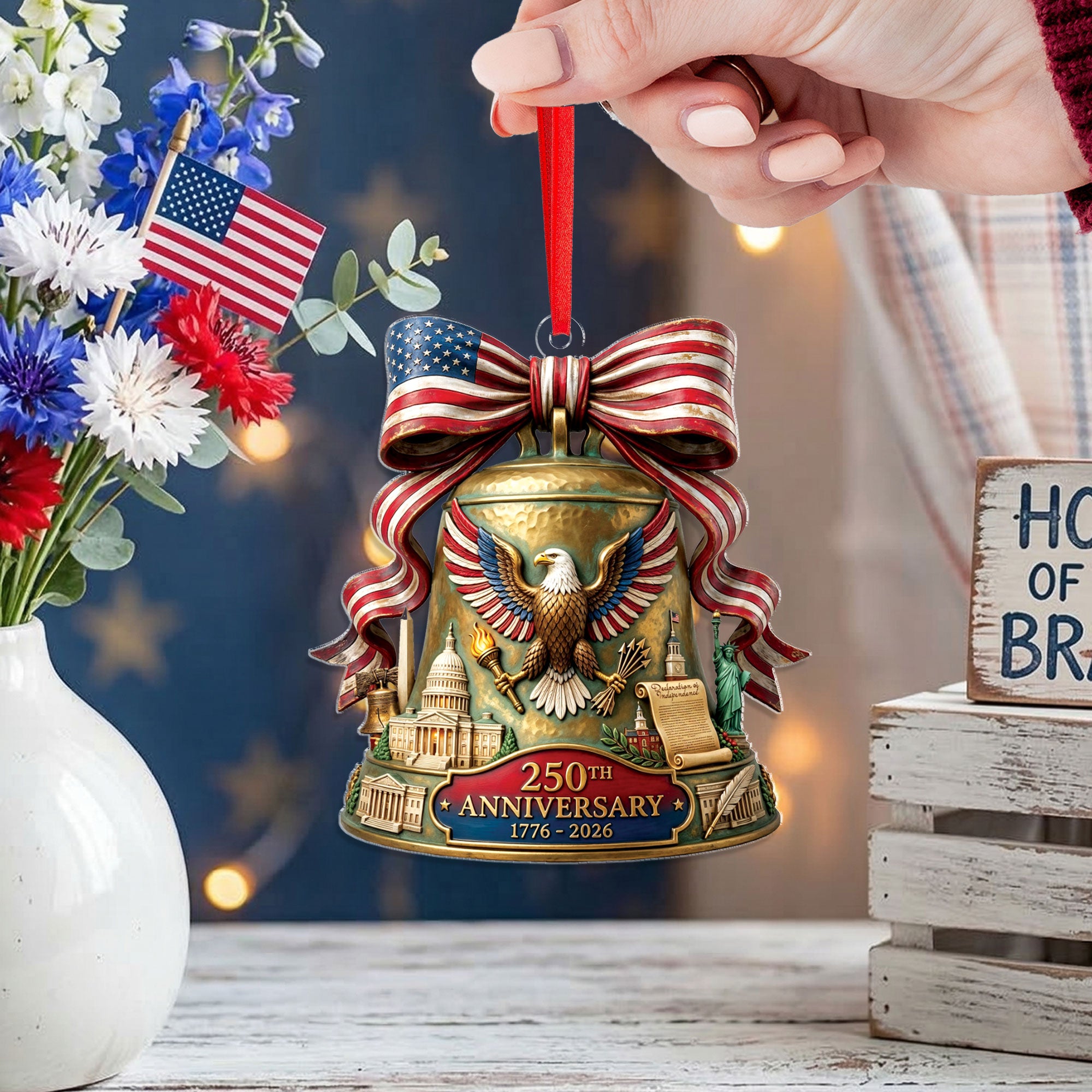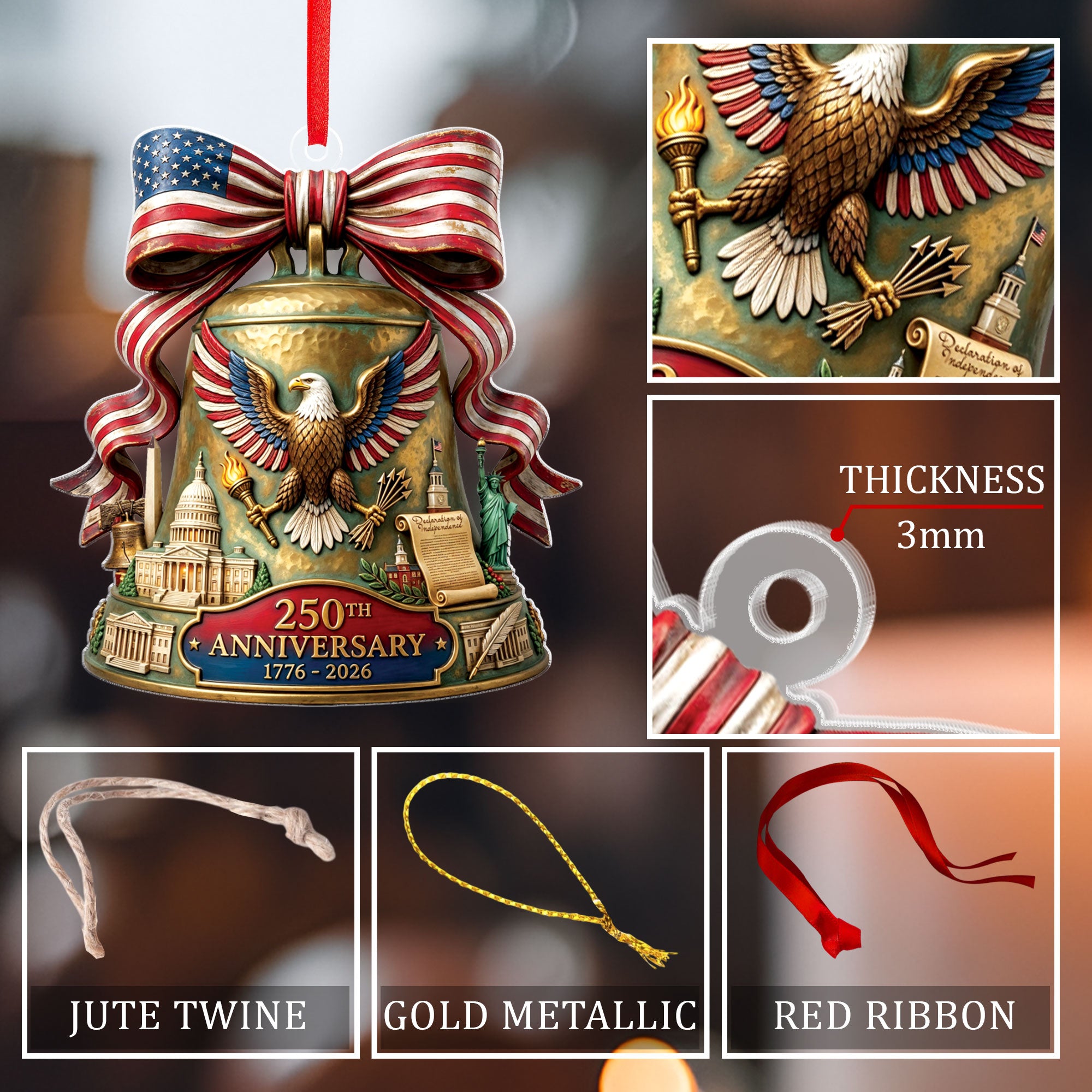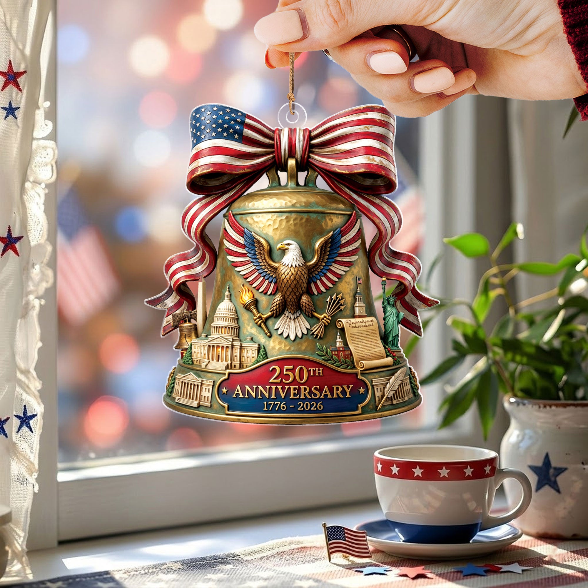 Celebrate the 250th anniversary of the United States in 2026 with this beautifully crafted acrylic ornament. Featuring iconic American symbols including the majestic bald eagle, the historic U.S. Capitol building, and the legendary Liberty Bell, this ornament captures the spirit of American independence and patriotism. Made from durable, high-quality clear acrylic for a stunning translucent effect that catches the light beautifully. Ideal for hanging on your Christmas tree, displaying in a window, or as part of a patriotic home decor collection. Perfect as a thoughtful gift for history enthusiasts, veterans, or anyone proud of American heritage. Lightweight and easy to hang with included string loop. Commemorate this once-in-a-lifetime milestone with a timeless keepsake.