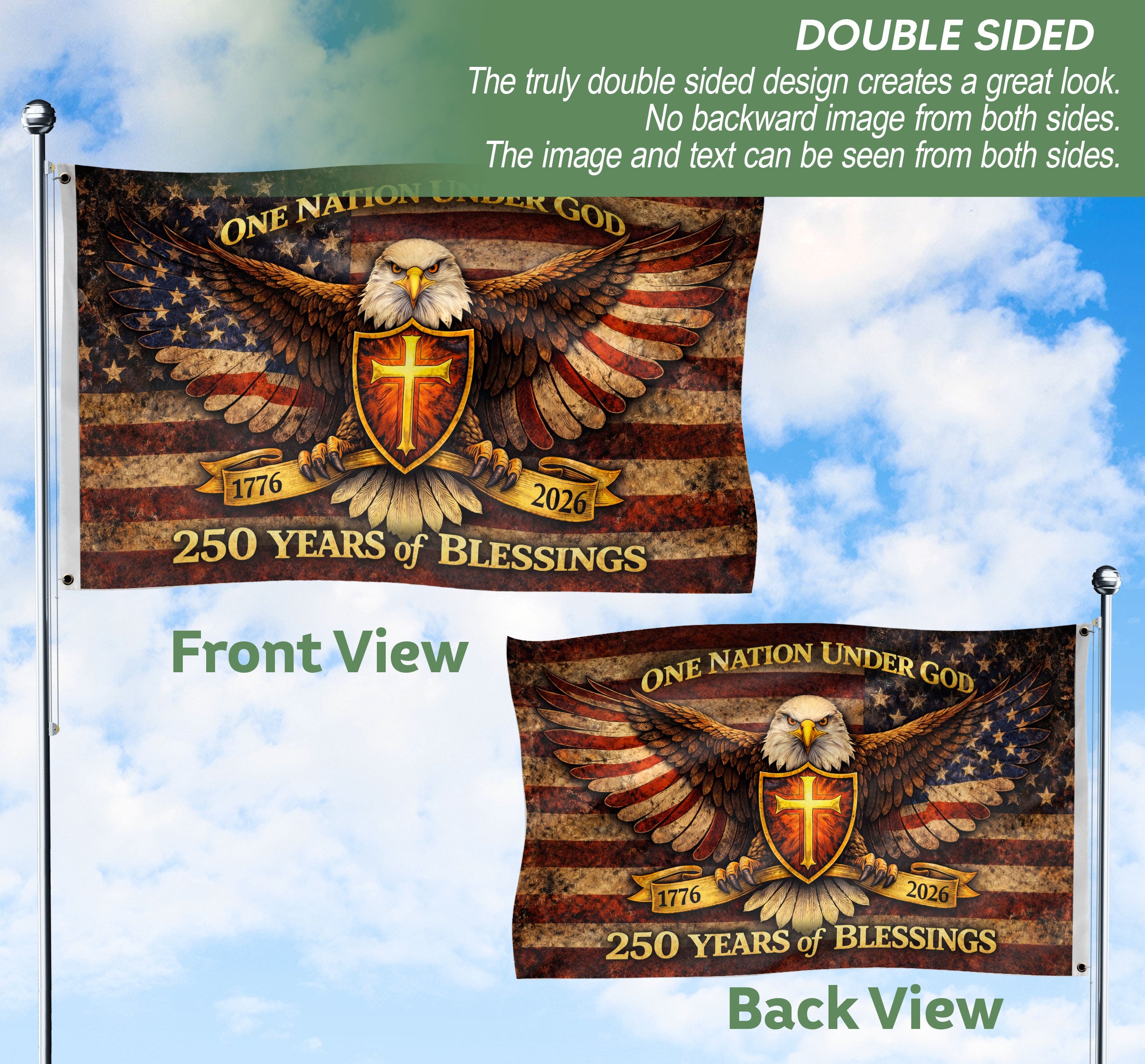 Celebrate 250 years of American independence with this striking double-sided eagle flag banner. Featuring the iconic eagle design, ‘One Nation Under God’ inscription, and the historic span from 1776 to 2026, this flag honors the nation’s enduring heritage, unity, and faith. Crafted for durability, it’s perfect for displaying at patriotic events, home decorations, Fourth of July celebrations, veterans’ gatherings, or historical commemorations. The double-sided printing ensures bold visibility from both sides, making it ideal for parades, outdoor poles, or indoor wall hangings. Show your pride in America’s journey with this high-quality commemorative banner.