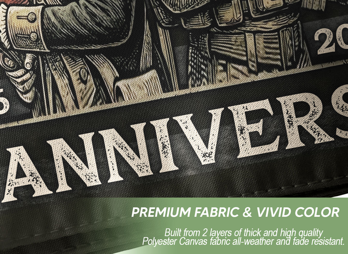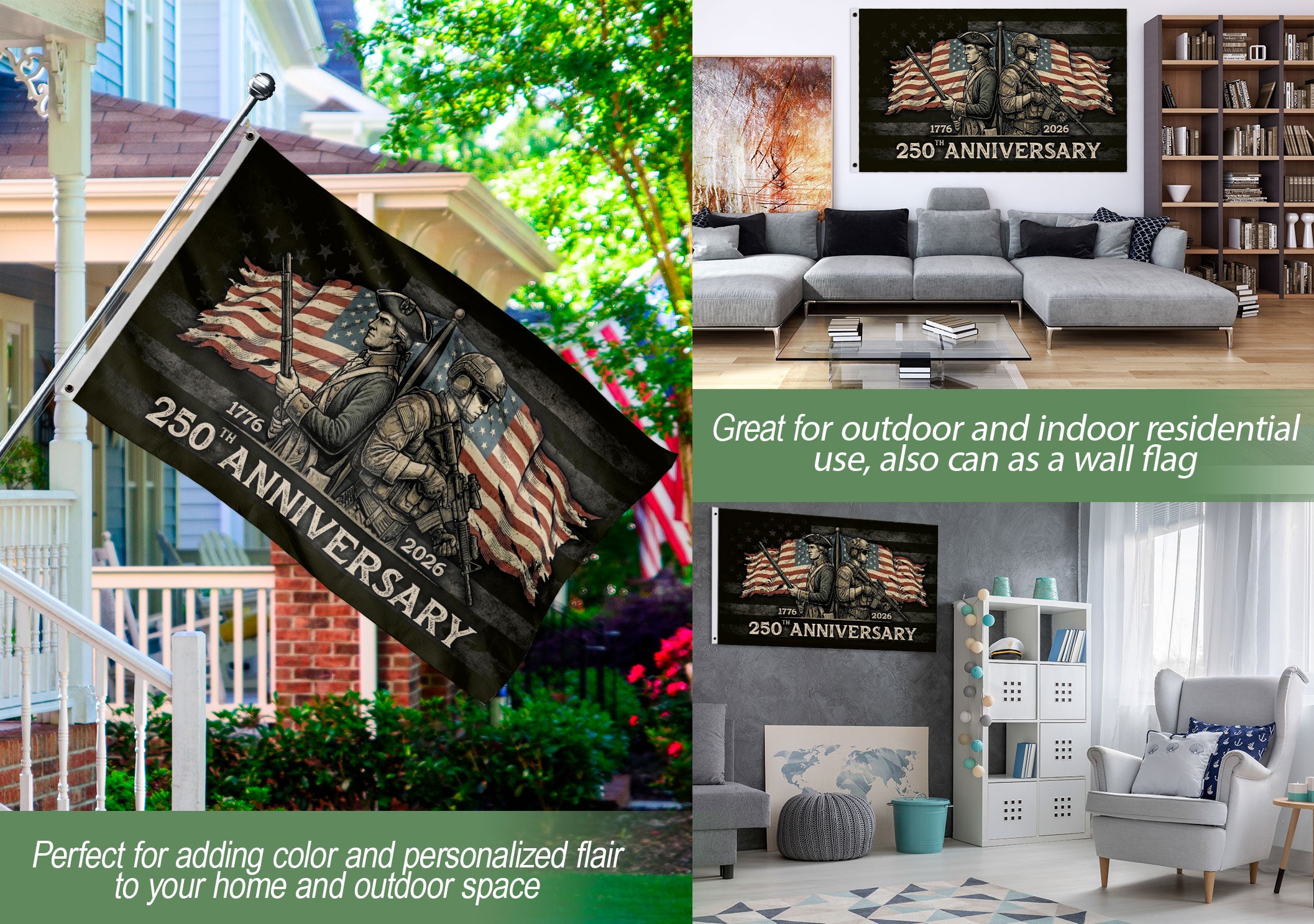 Celebrate the 250th anniversary of American independence with this 250 Years America Anniversary Flag spanning 1776-2026. This double-sided patriotic banner honors the revolutionary spirit of 1776 and the modern soldiers who defend liberty today. The striking design blends historical heritage with contemporary symbols of strength and unity, making it a powerful tribute to America’s journey. Perfect for display at home, parades, outdoor events, veterans’ gatherings, or Independence Day celebrations. Crafted from high-quality, durable fabric, it features vibrant colors and sharp details visible on both sides. Weather-resistant material prevents fading, ensuring long-lasting pride even in outdoor conditions. Ideal for patriots, history enthusiasts, veterans, and families. Easily hang from poles, walls, porches, or fences to showcase national pride and commemorate the semiquincentennial milestone.