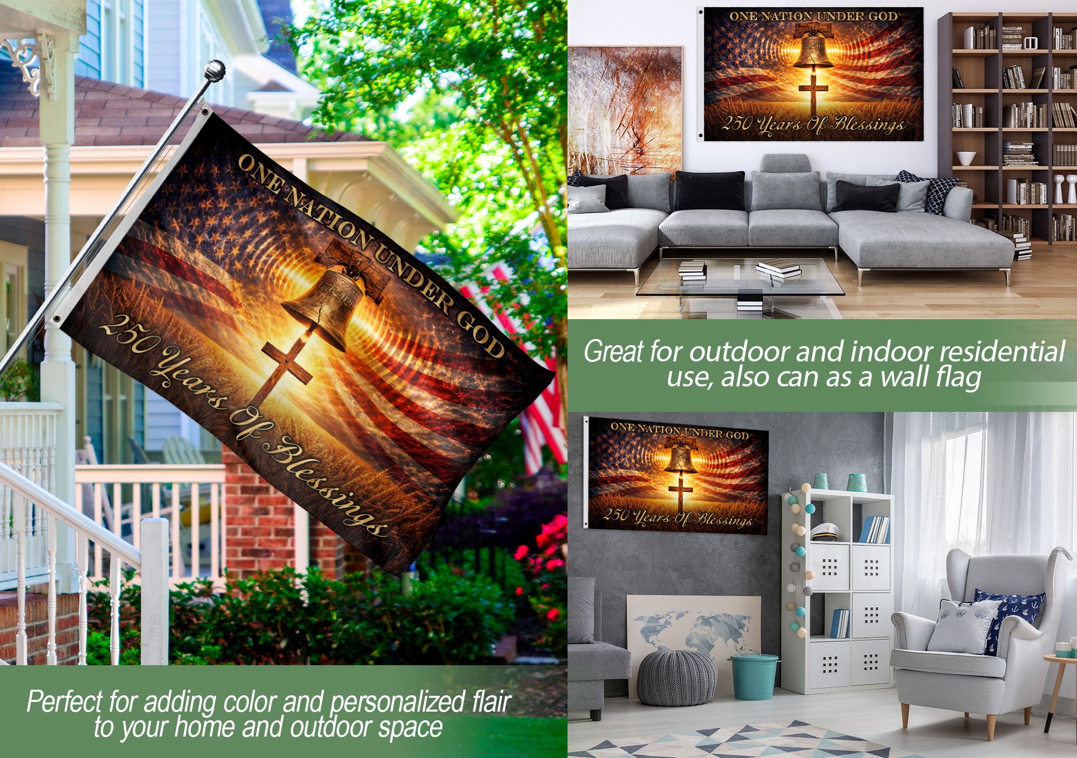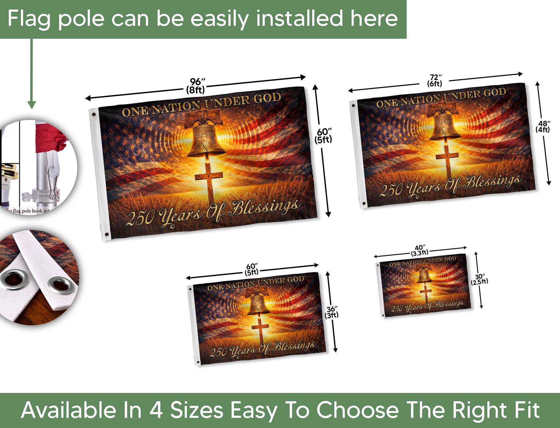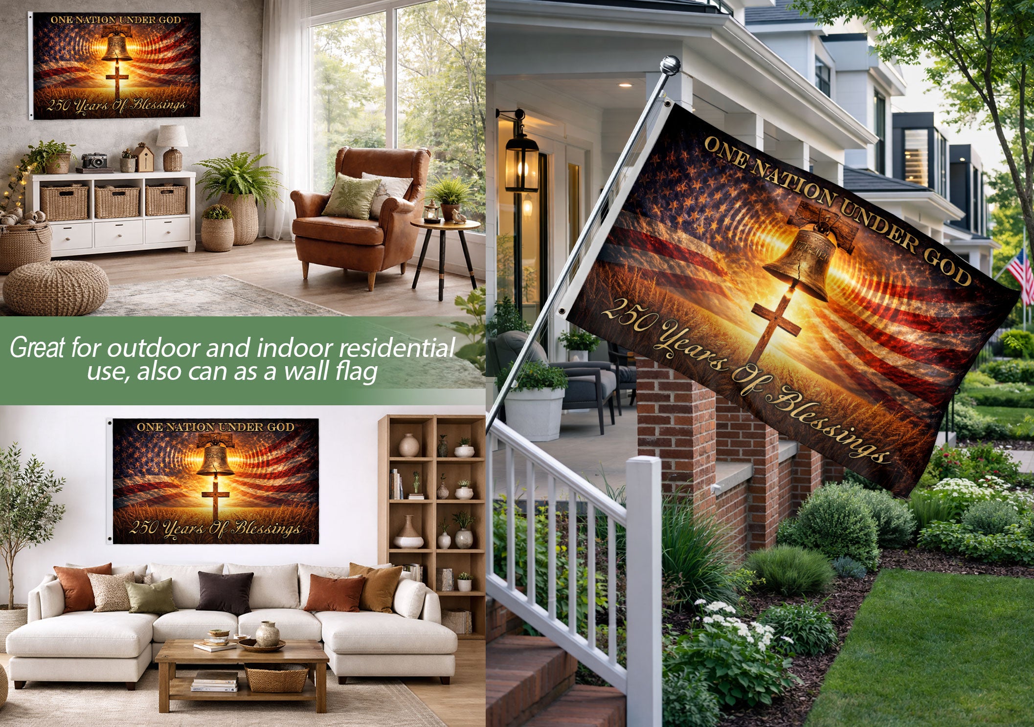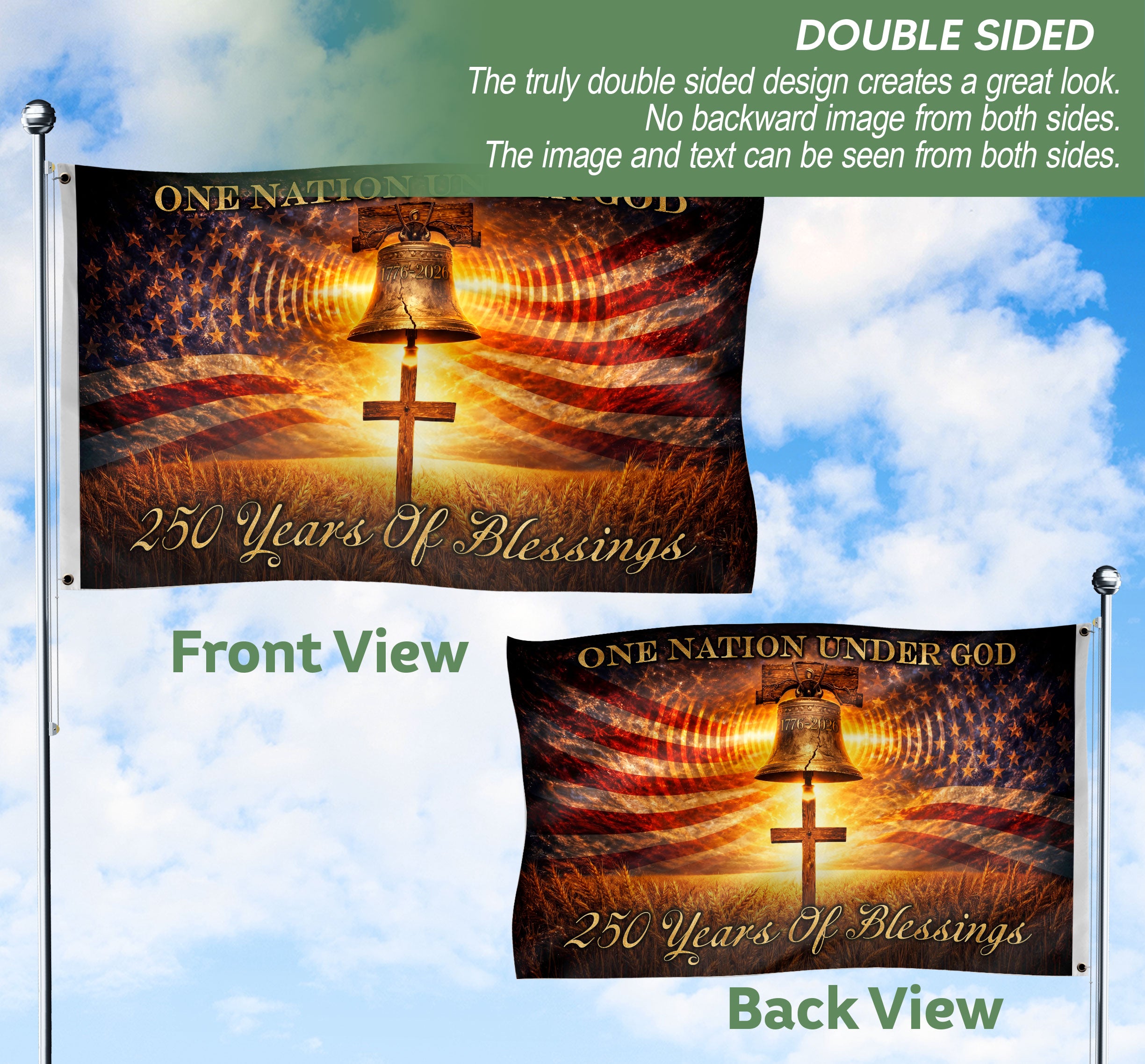 Celebrate 250 years of American heritage and faith with this double-sided patriotic flag spanning 1776 to 2026. The design prominently features the iconic Liberty Bell and Cross alongside the timeless message ‘One Nation Under God.’ This durable banner honors the blessings, gratitude, hope, and devotion passed through generations, making it a perfect tribute to national pride and spiritual values. Ideal for display at home, porches, events, or celebrations, especially for the United States’ 250th anniversary. Crafted with high-quality, weather-resistant materials to withstand outdoor conditions while maintaining vibrant colors and clear printing on both sides. Show your patriotism and faith with this meaningful banner that connects America’s founding to its future.