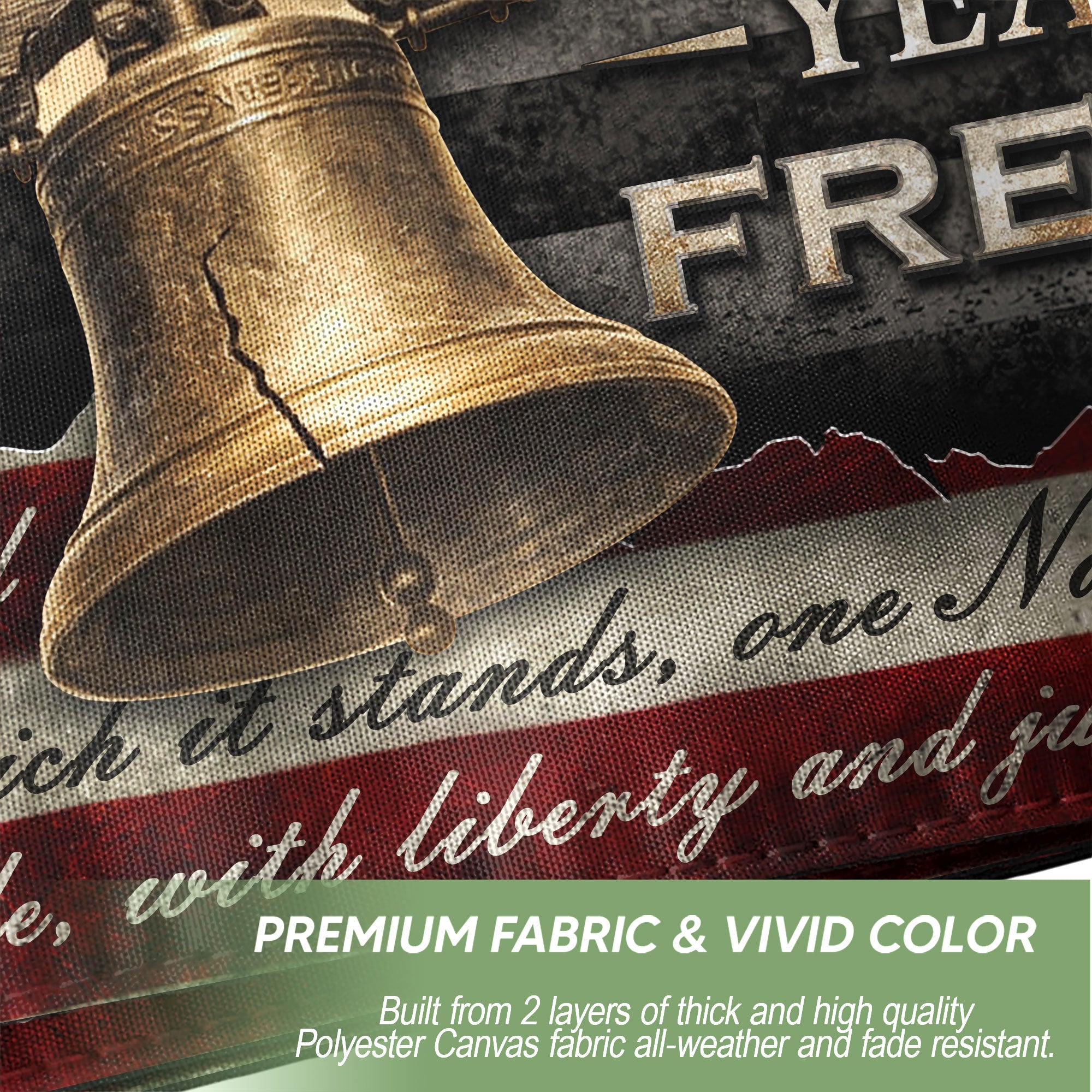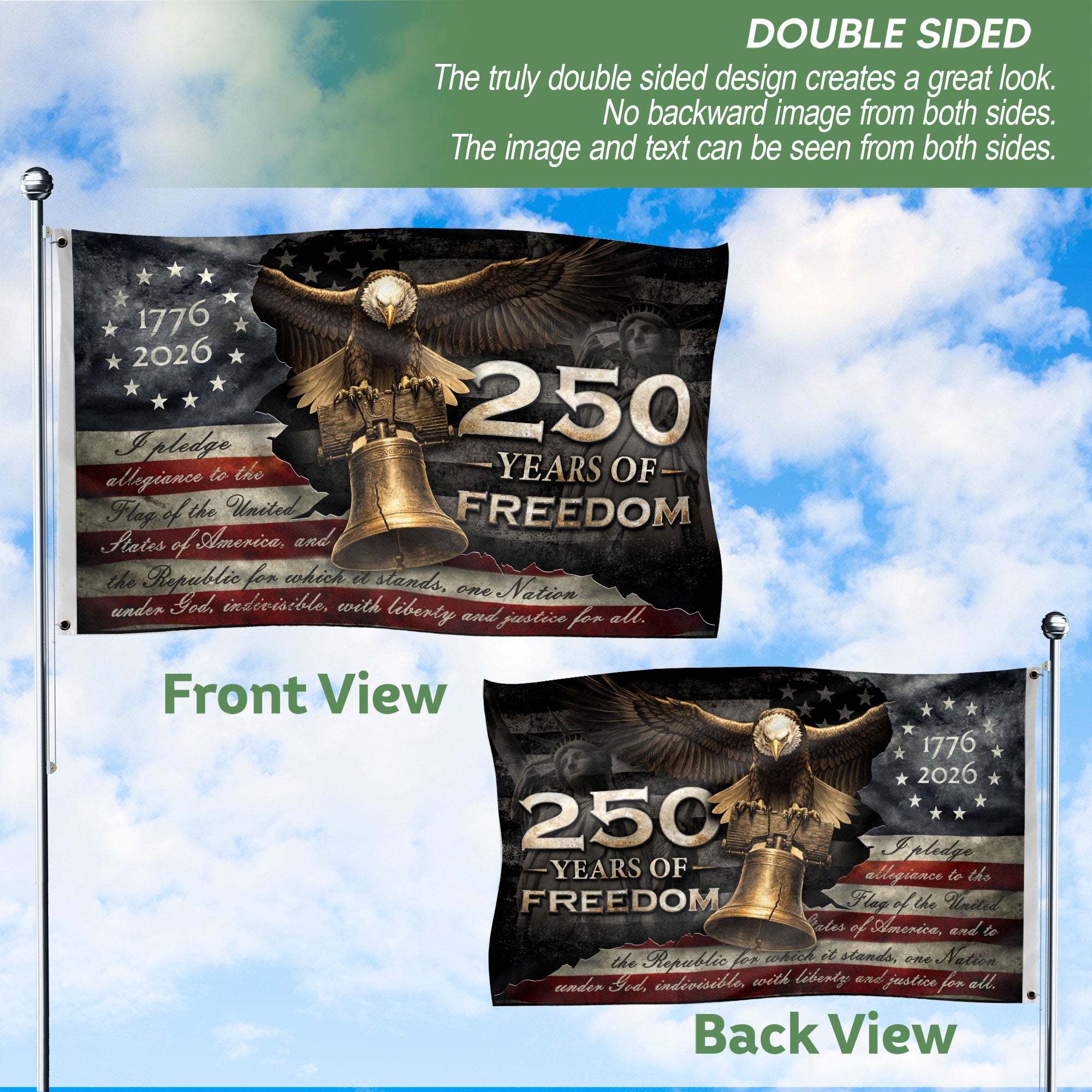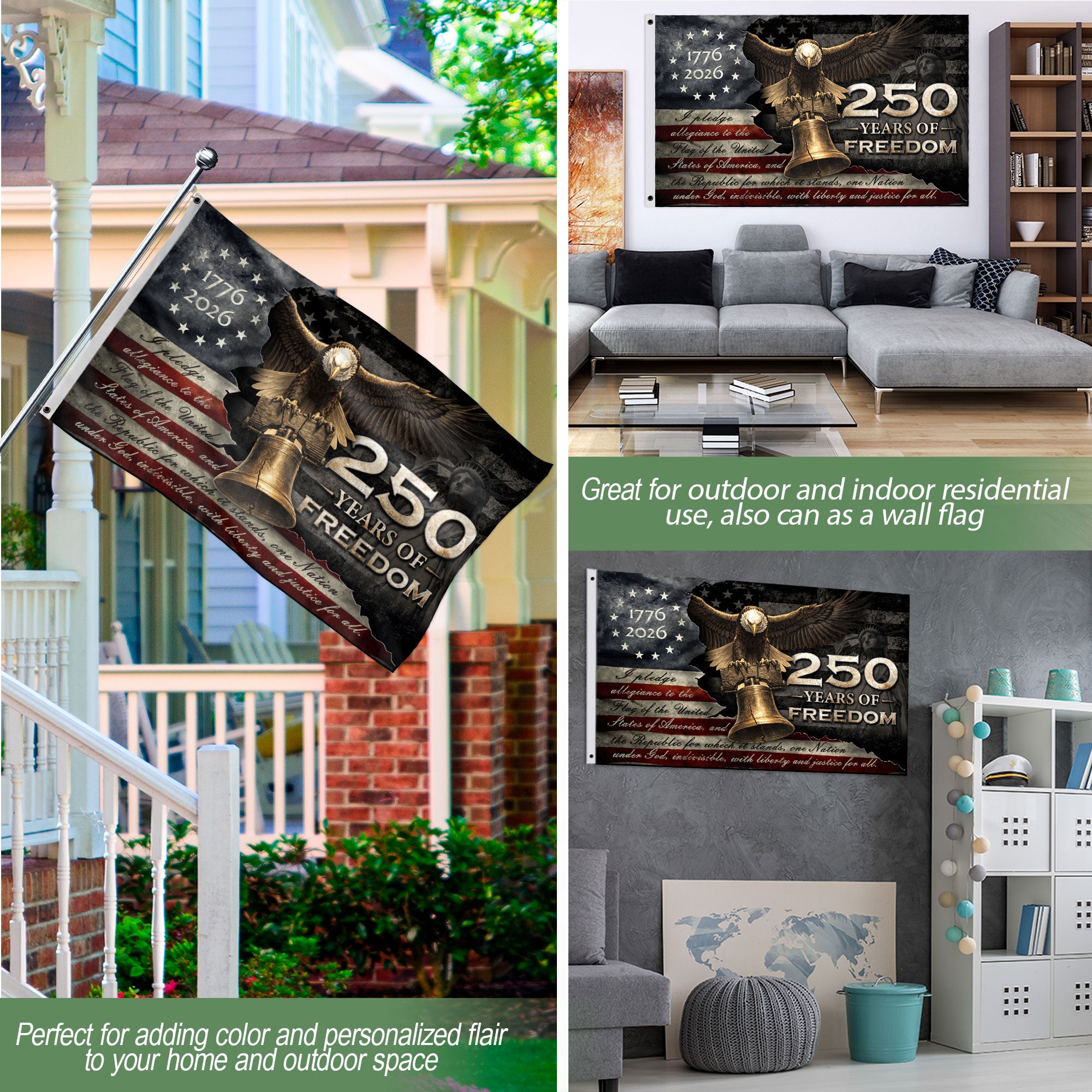 Celebrate 250 years of American independence with this double-sided house flag commemorating 1776-2026. Featuring the iconic Liberty Bell paired with a majestic eagle, it symbolizes the historic birth of freedom and the enduring strength of the nation. Crafted for outdoor display, this bold patriotic décor withstands the elements while proudly showcasing national pride. Perfect for homes, gardens, porches, or patriotic events. Double-sided design ensures vibrant graphics from both sides. Ideal for Fourth of July, Memorial Day, or everyday American spirit.