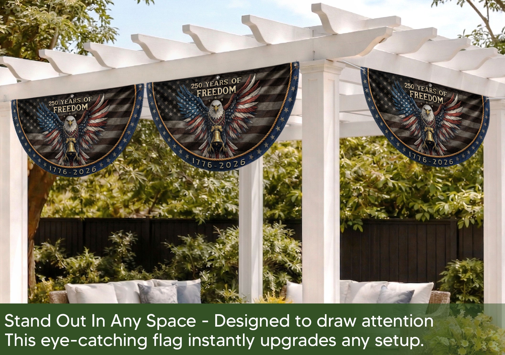 Celebrate America’s 250th anniversary of independence from 1776 to 2026 with this striking fence flag. Featuring a bold patriotic eagle, iconic Liberty Bell, and vintage American design elements, this banner captures the spirit of freedom and national pride. Crafted from durable, weather-resistant polyester fabric, it withstands outdoor conditions including wind, rain, and sun exposure. Perfect for displaying on fences, porches, decks, mailboxes, or as yard décor during Independence Day celebrations, historical commemorations, or everyday patriotic displays. Easy to hang with reinforced grommets and sleeves. Measures standard fence flag size for versatile placement. Proudly made to honor the semiquincentennial milestone.