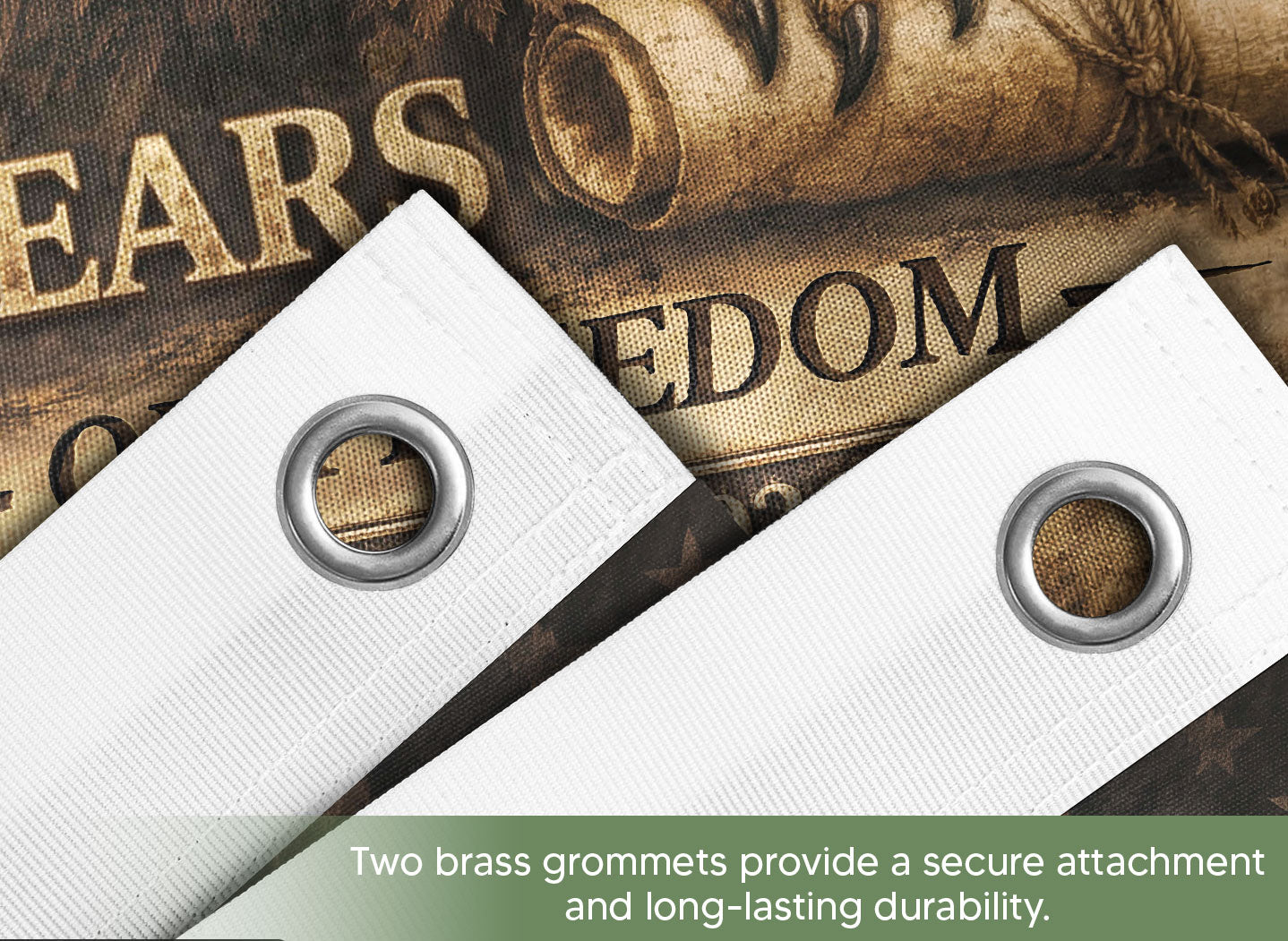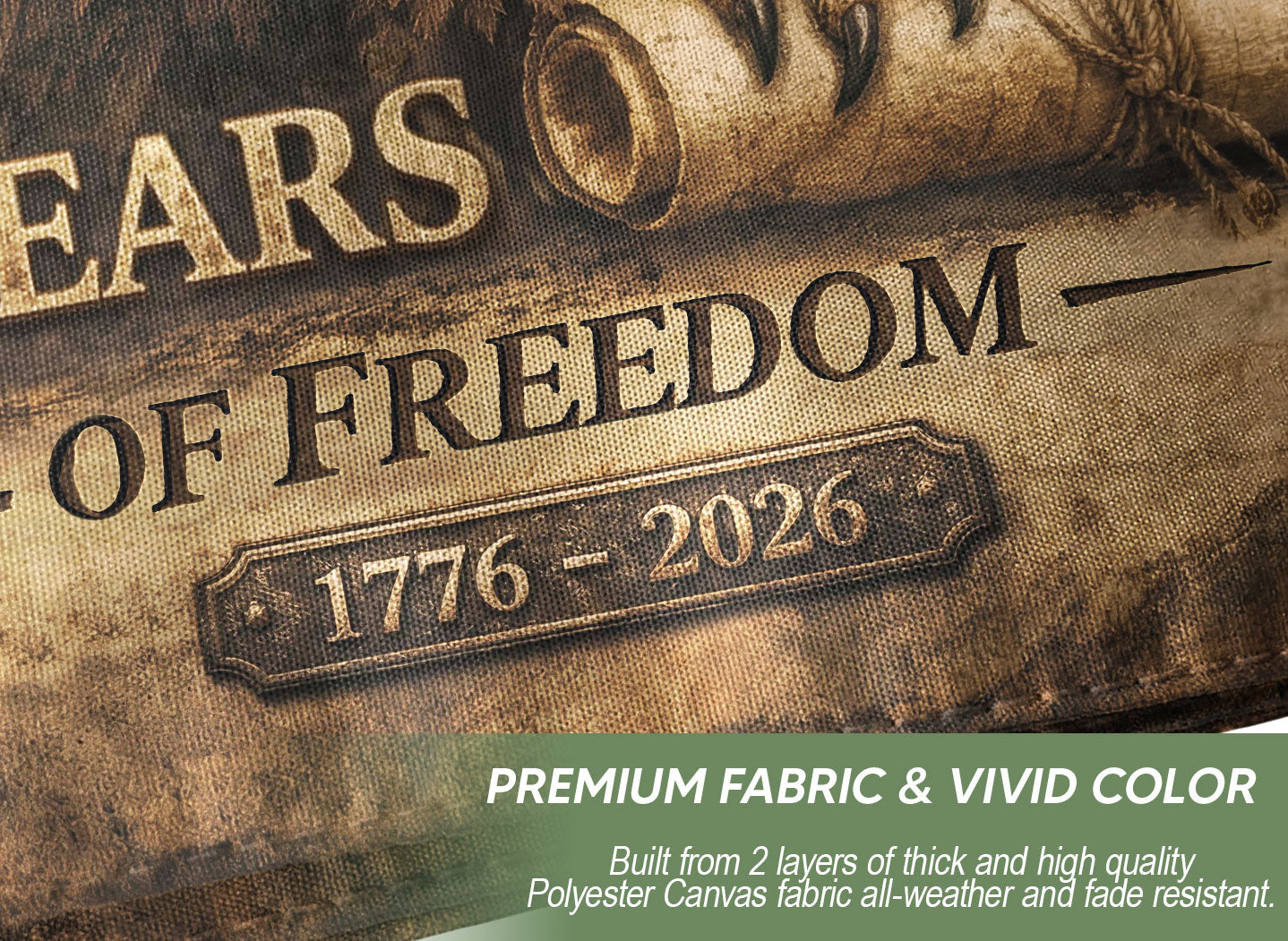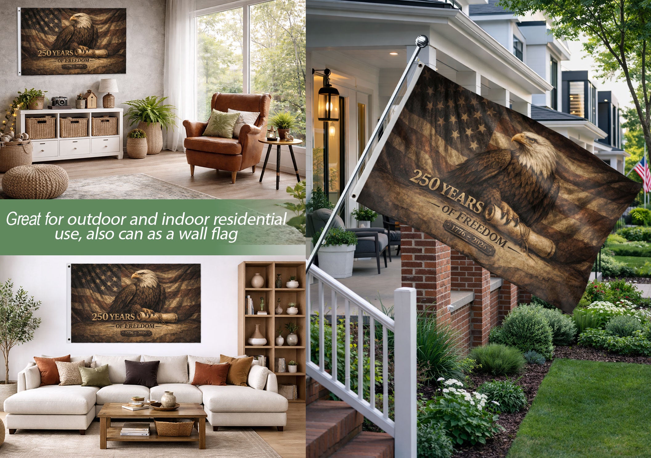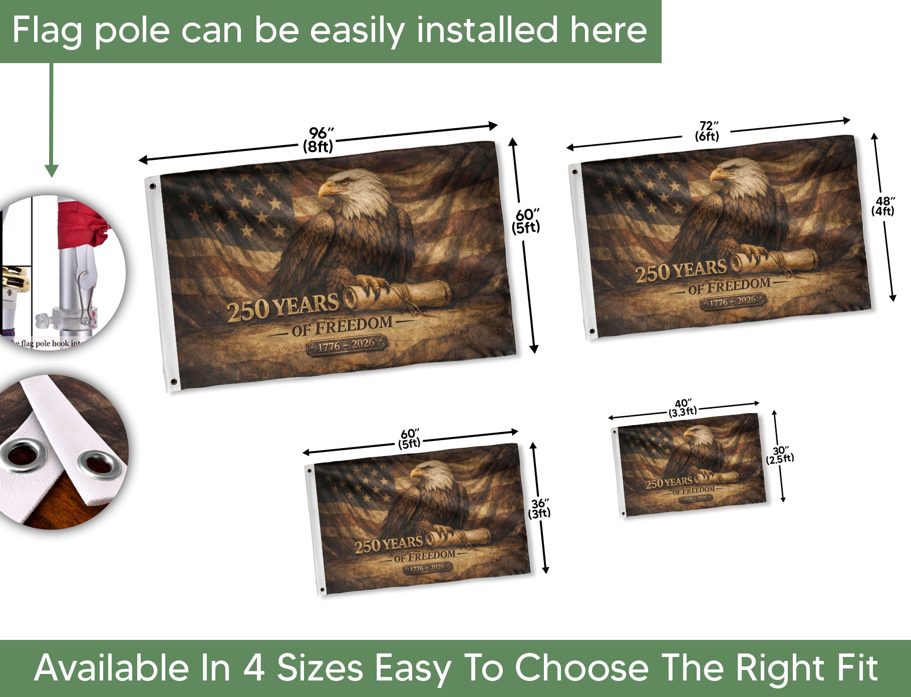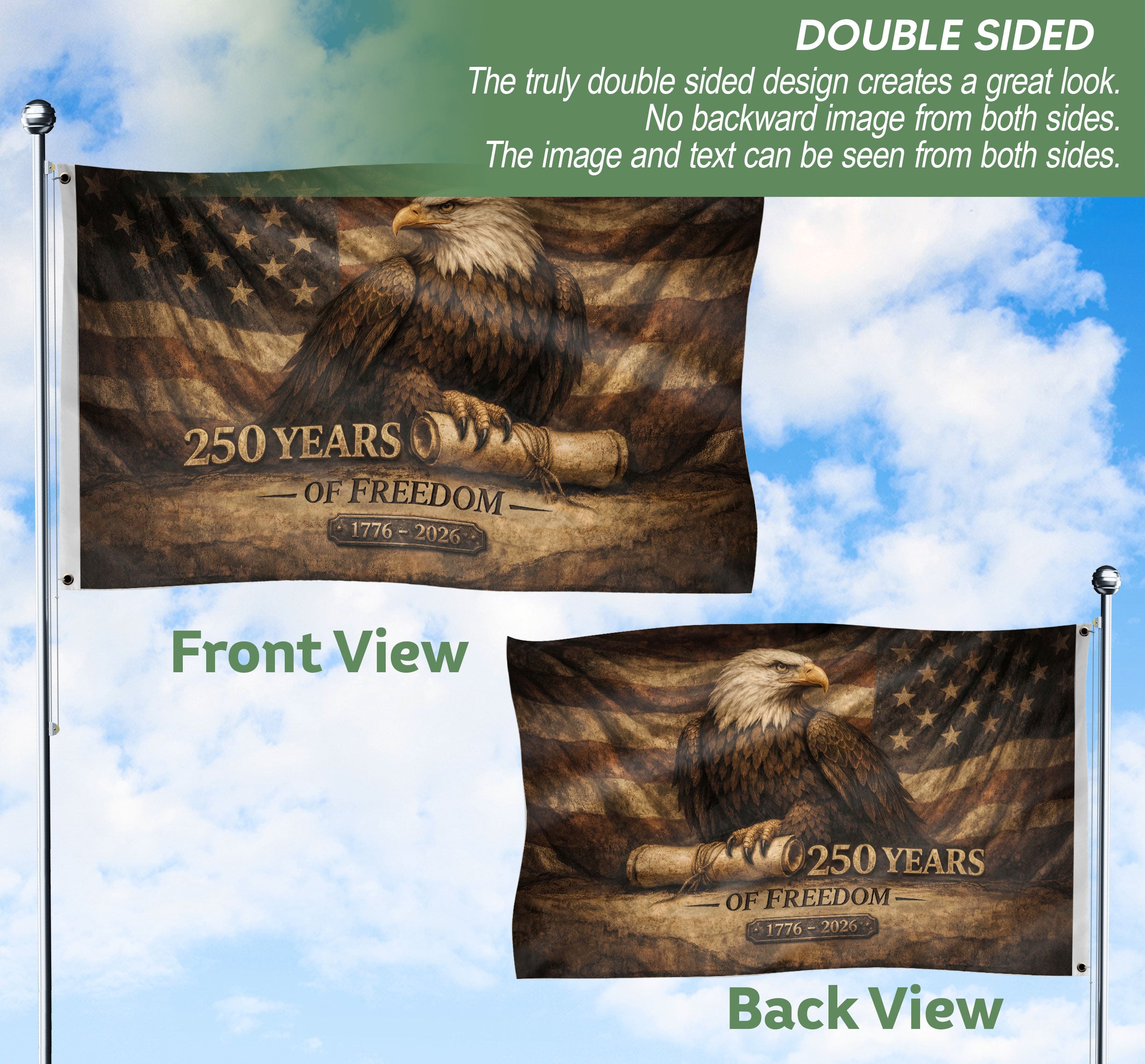 Celebrate 250 years of American freedom with this 250 Years of Freedom Flag spanning 1776-2026. Featuring a striking vintage eagle design intertwined with Constitution-inspired imagery, this patriotic banner honors the enduring principles of liberty and democracy that founded the nation. Perfect for displaying at home, events, parades, or historical commemorations, it serves as a powerful tribute to the American spirit. Crafted with high-quality, durable fabric to withstand outdoor use, the banner includes reinforced edges and grommets for easy hanging on poles, walls, or fences. Ideal for patriots, history enthusiasts, and those marking the semiquincentennial anniversary. Bring a touch of vintage Americana to your space with this meaningful 250th USA flag banner.