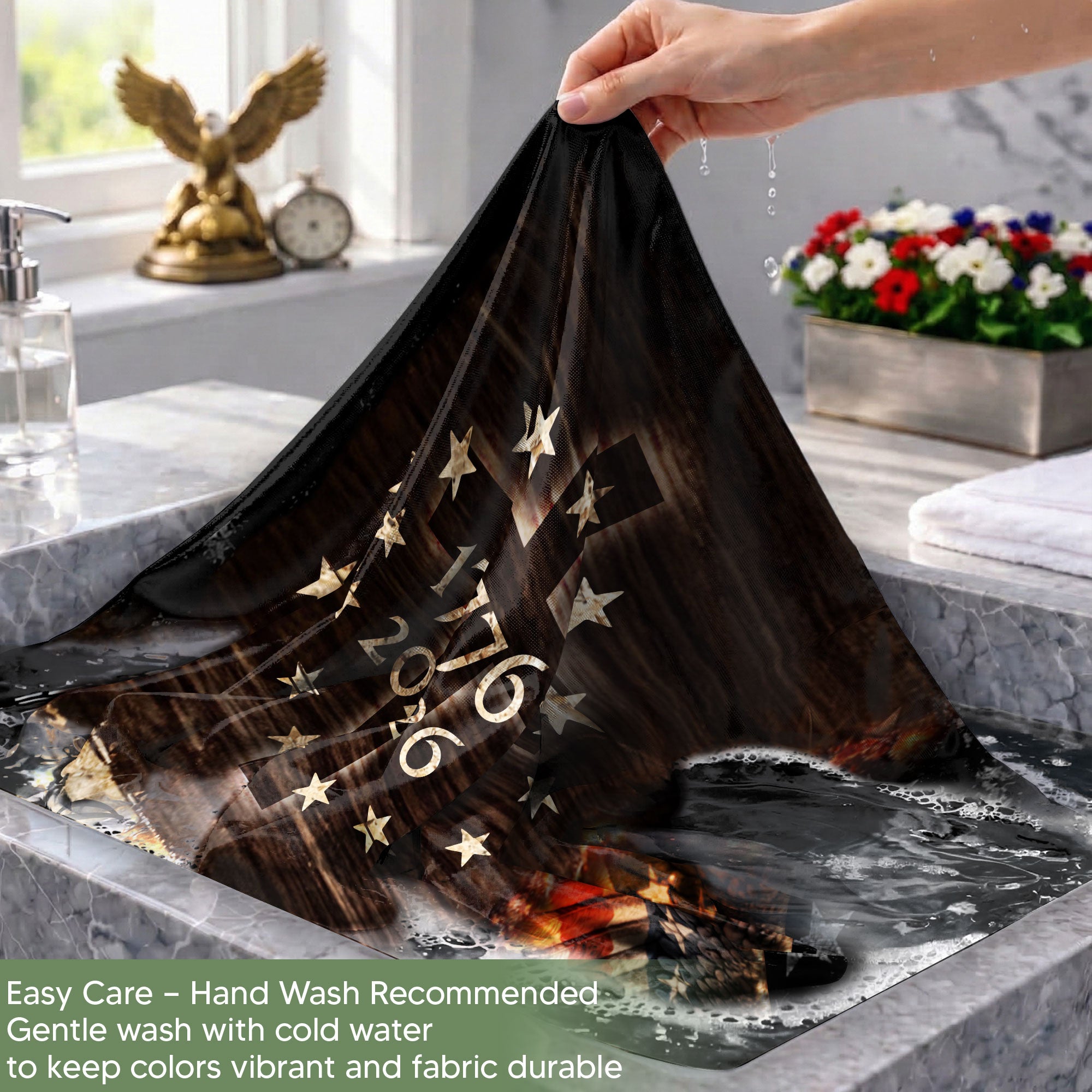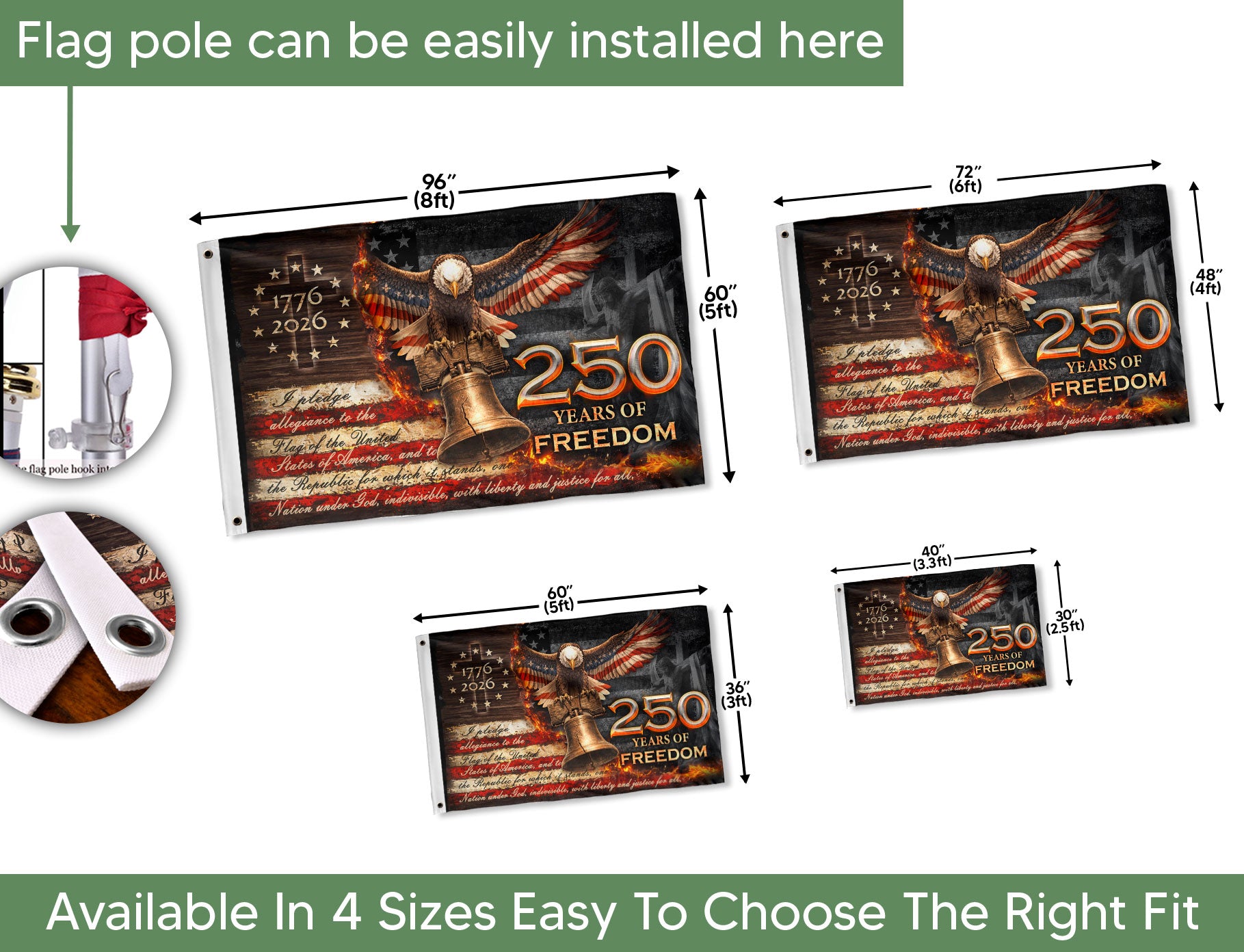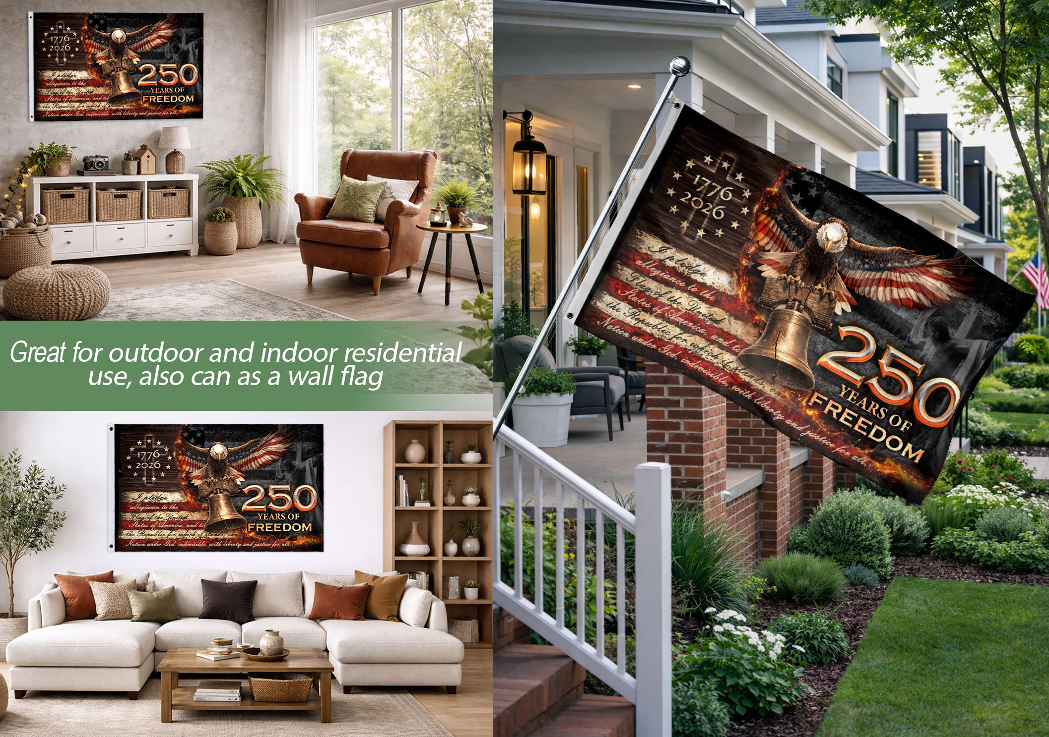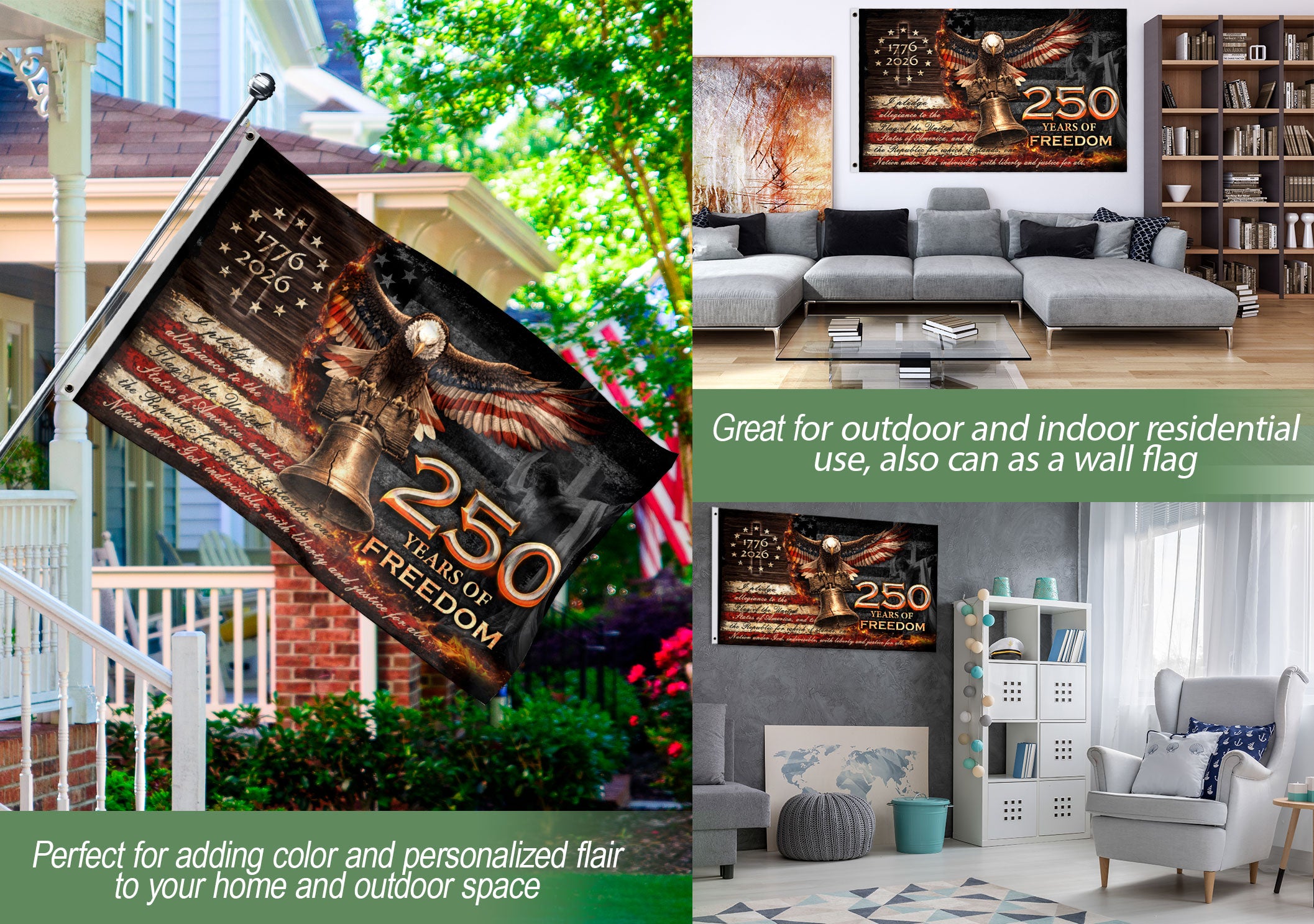 Commemorate 250 years of American independence with this striking house flag featuring a majestic bald eagle perched atop the Liberty Bell. The design showcases outspread wings symbolizing strength, against a stars and stripes backdrop. Prominently displays the Pledge of Allegiance and milestone dates 1776-2026. Ideal for garden decor, porches, or patriotic displays. Durable fabric withstands outdoor conditions, perfect as a gift for history enthusiasts, veterans, or Fourth of July celebrations. Easy to hang with standard house flag poles.