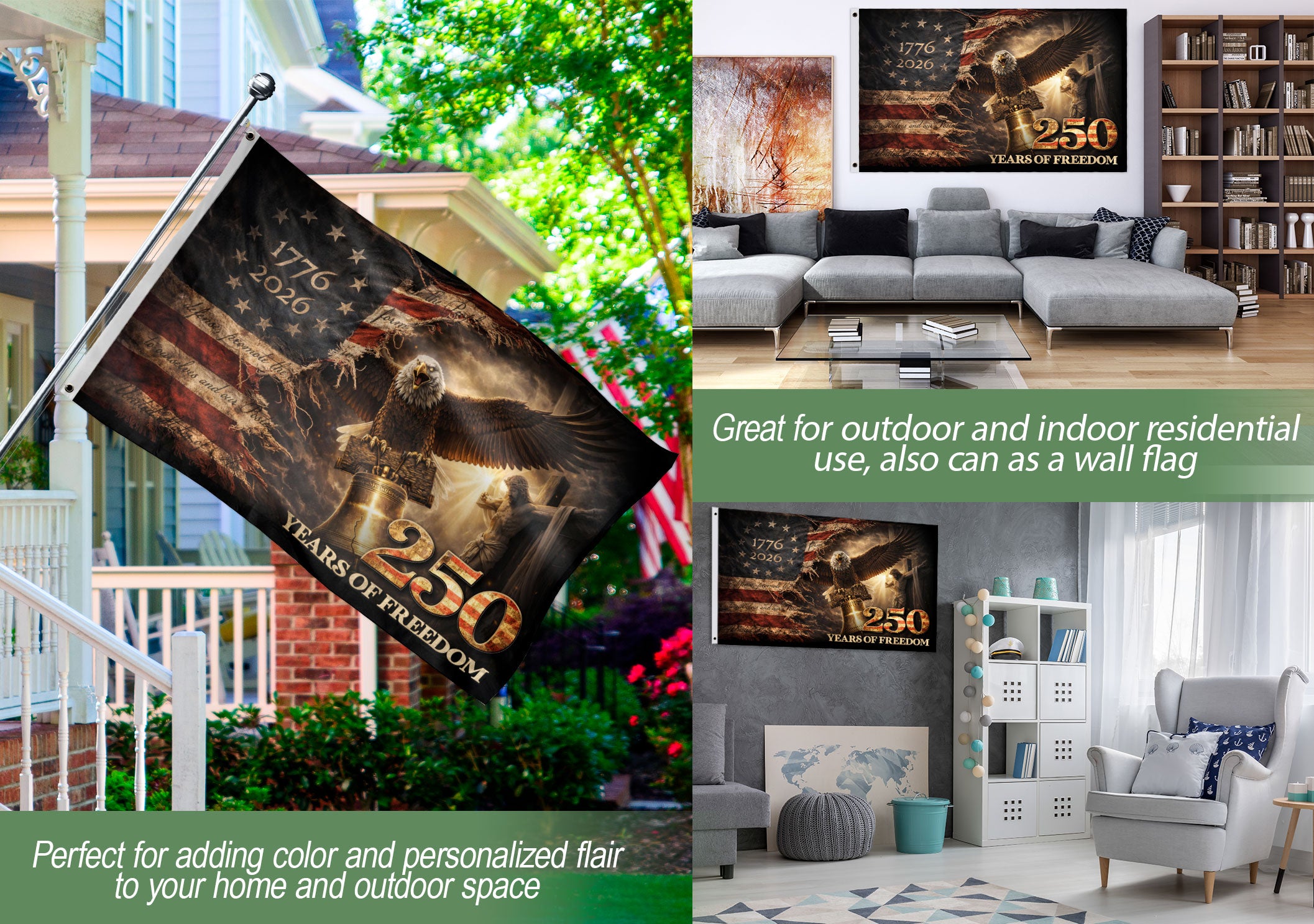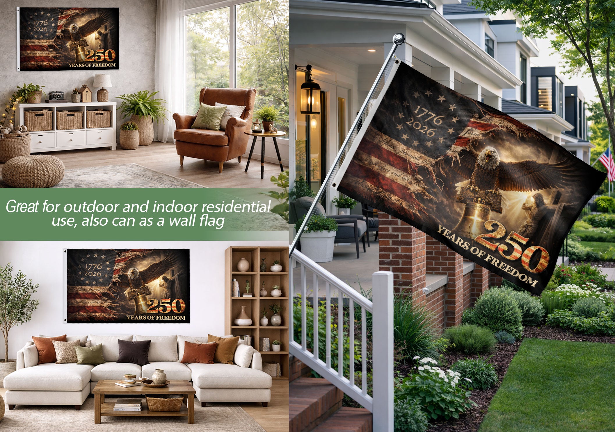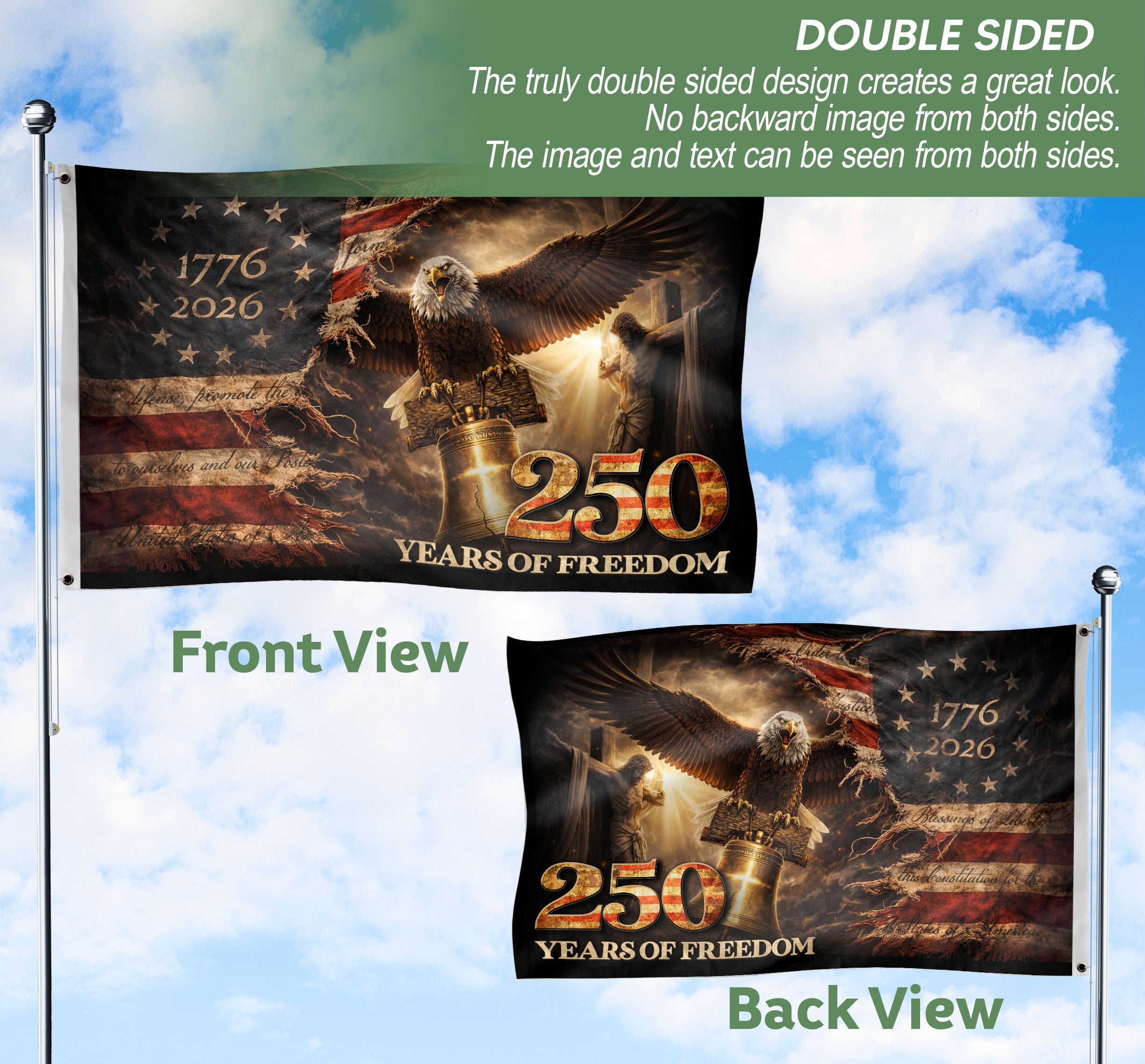 Celebrate 250 years of American freedom with this striking house flag featuring a majestic bald eagle perched on the Liberty Bell. Set against a weathered stars-and-stripes American flag backdrop and a poignant faith-inspired image, this patriotic decor honors the journey from 1776 to 2026. Perfect for displaying national pride on your porch, home, or garden. Crafted for durability and vibrant colors that withstand outdoor conditions, it’s an iconic symbol of heritage, liberty, and Christian values. Ideal for Independence Day, anniversaries, or everyday patriotism.