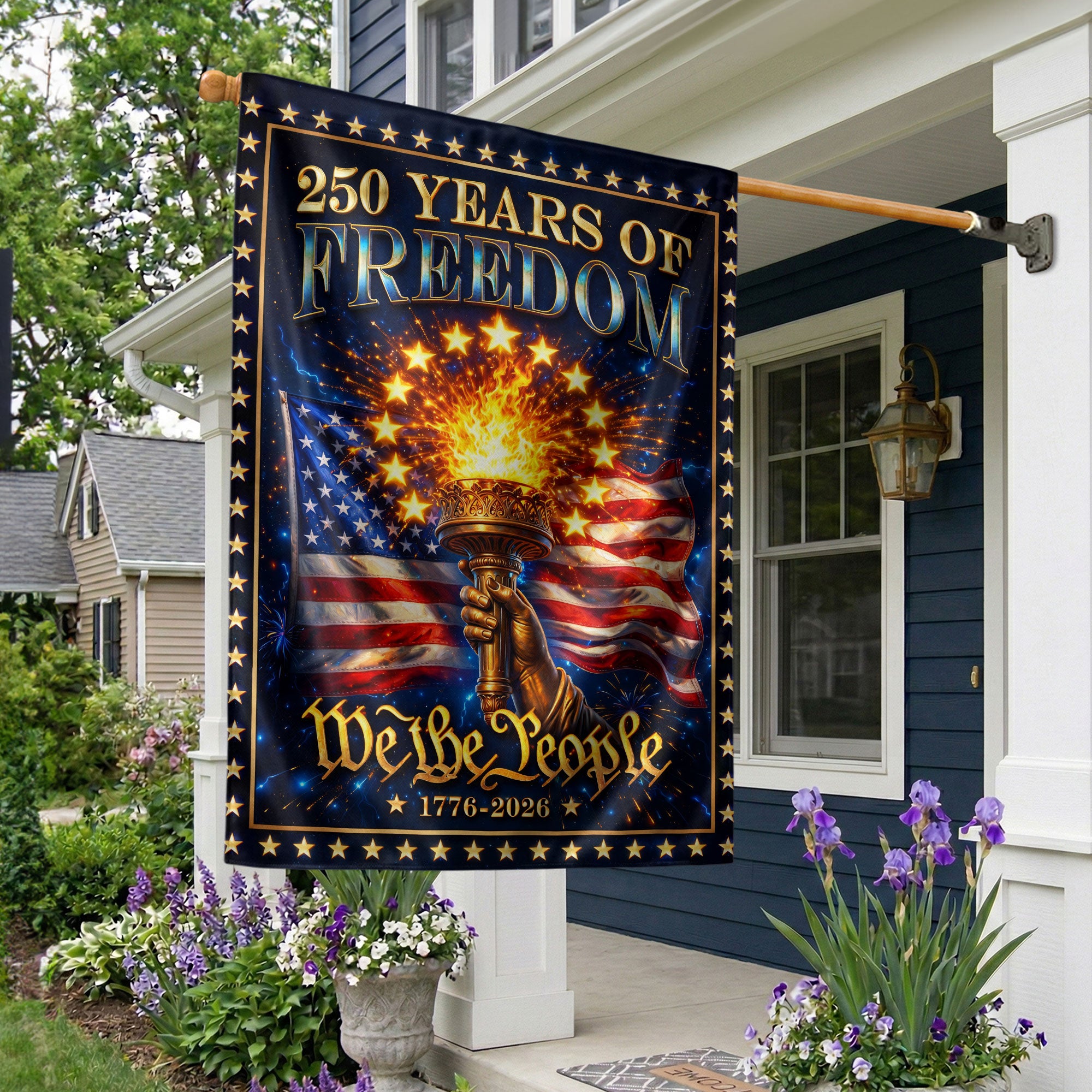 Celebrate America’s 250th anniversary with this striking 250 Years of Freedom house flag. Featuring a blazing torch, iconic American flag elements, and the powerful ‘We The People’ design, this patriotic banner symbolizes unity, independence, and national pride from 1776 to 2026. Perfect for displaying on your front porch, garage, or home exterior to honor historical milestones, holidays like the 4th of July, or everyday patriotism. Crafted from durable, weather-resistant polyester fabric with vibrant, fade-resistant colors that withstand sun, wind, and rain. Double-sided printing ensures bold visibility from both sides. Easy to hang with a standard house flag pole sleeve or grommets. Measures standard house flag size for optimal display. Ideal for history enthusiasts, veterans, and anyone proud of American heritage. Make a powerful statement about freedom and the enduring spirit of the USA.