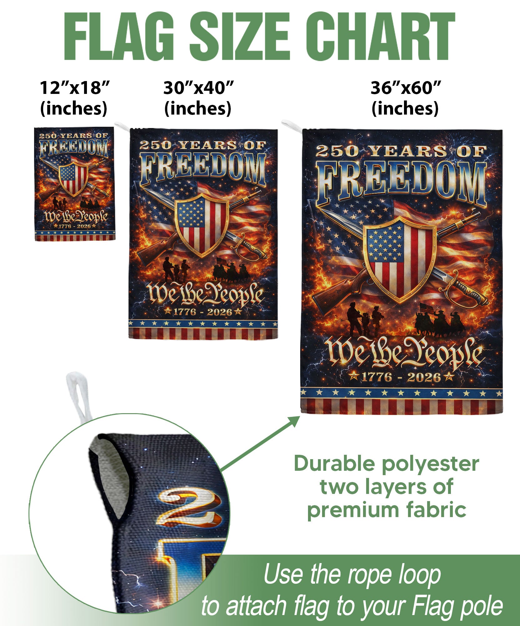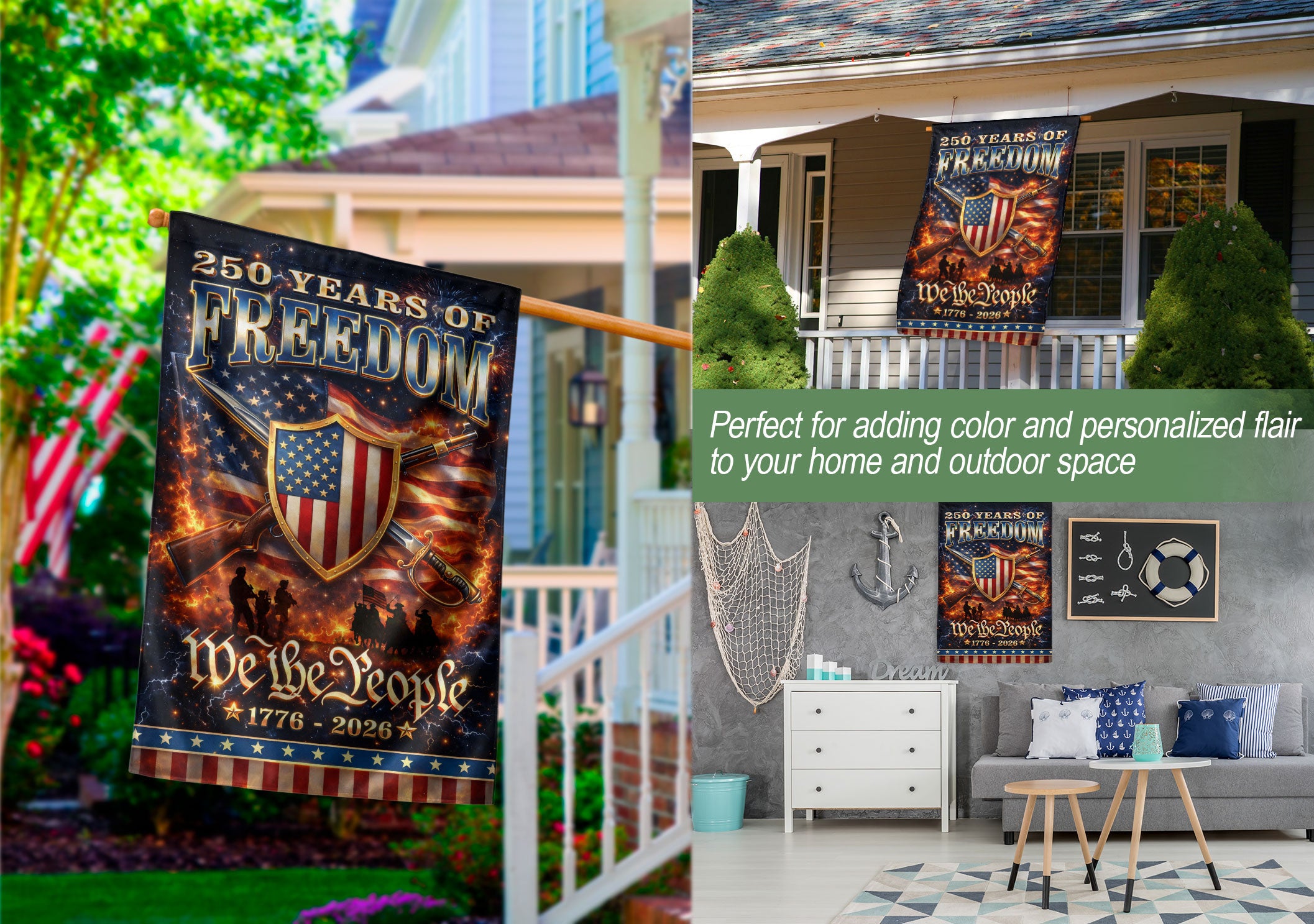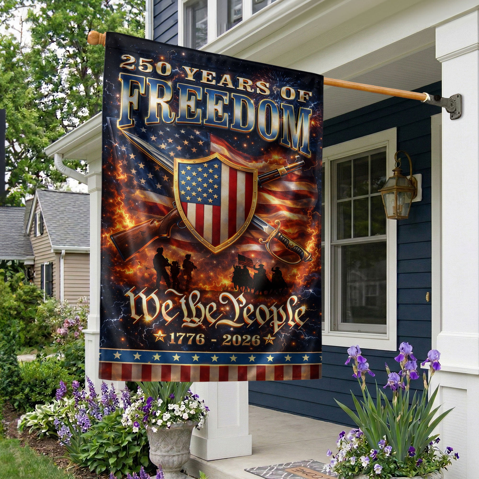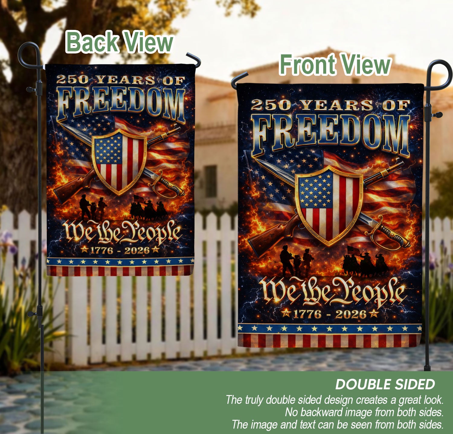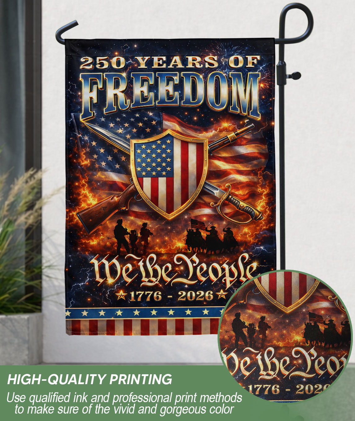 Celebrate 250 years of American independence with this durable garden flag featuring the iconic ‘We The People’ patriotic shield design. Marking the period from 1776 to 2026, this vibrant outdoor banner displays national pride, history, and unity in gardens, yards, pathways, or porches. Made from weather-resistant fabric, it withstands outdoor elements for year-round display or holiday celebrations like the 4th of July and the upcoming 250th anniversary. Eye-catching colors and bold graphics make it a standout addition to your patriotic decor, perfect for showing support for American heritage.