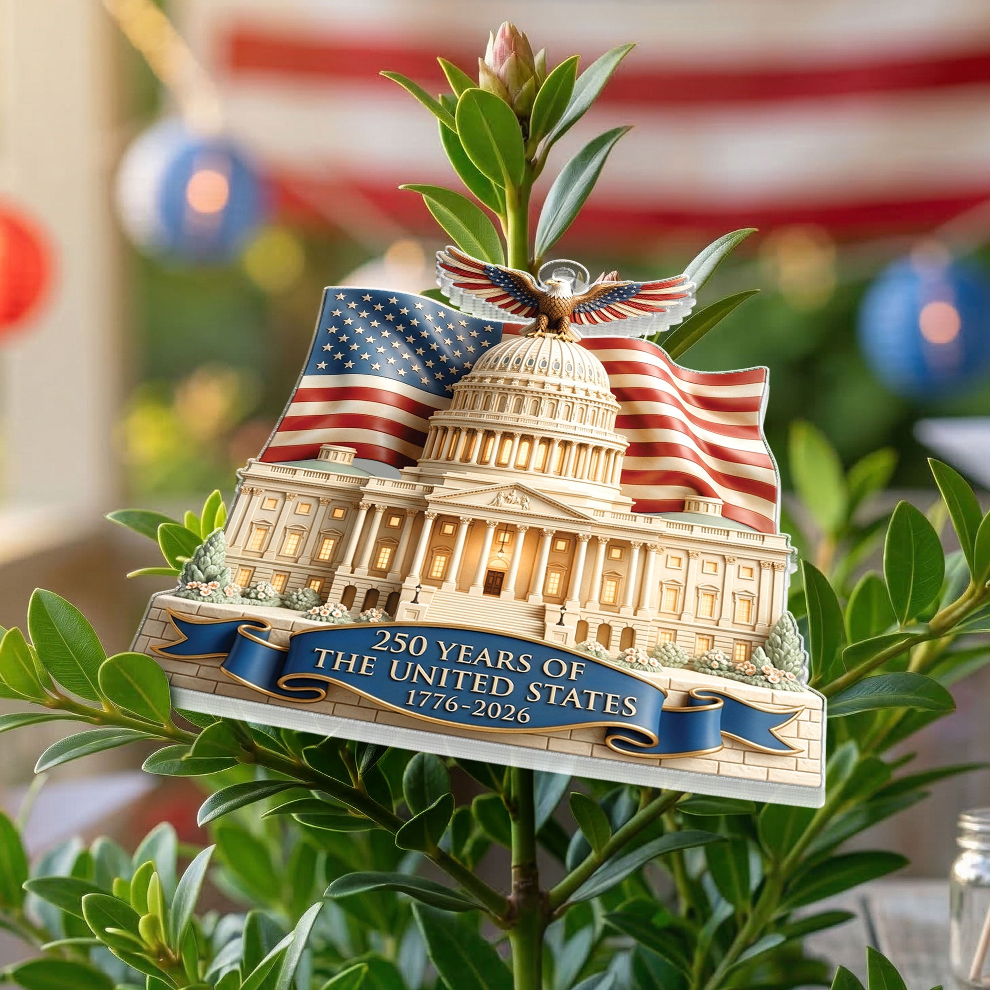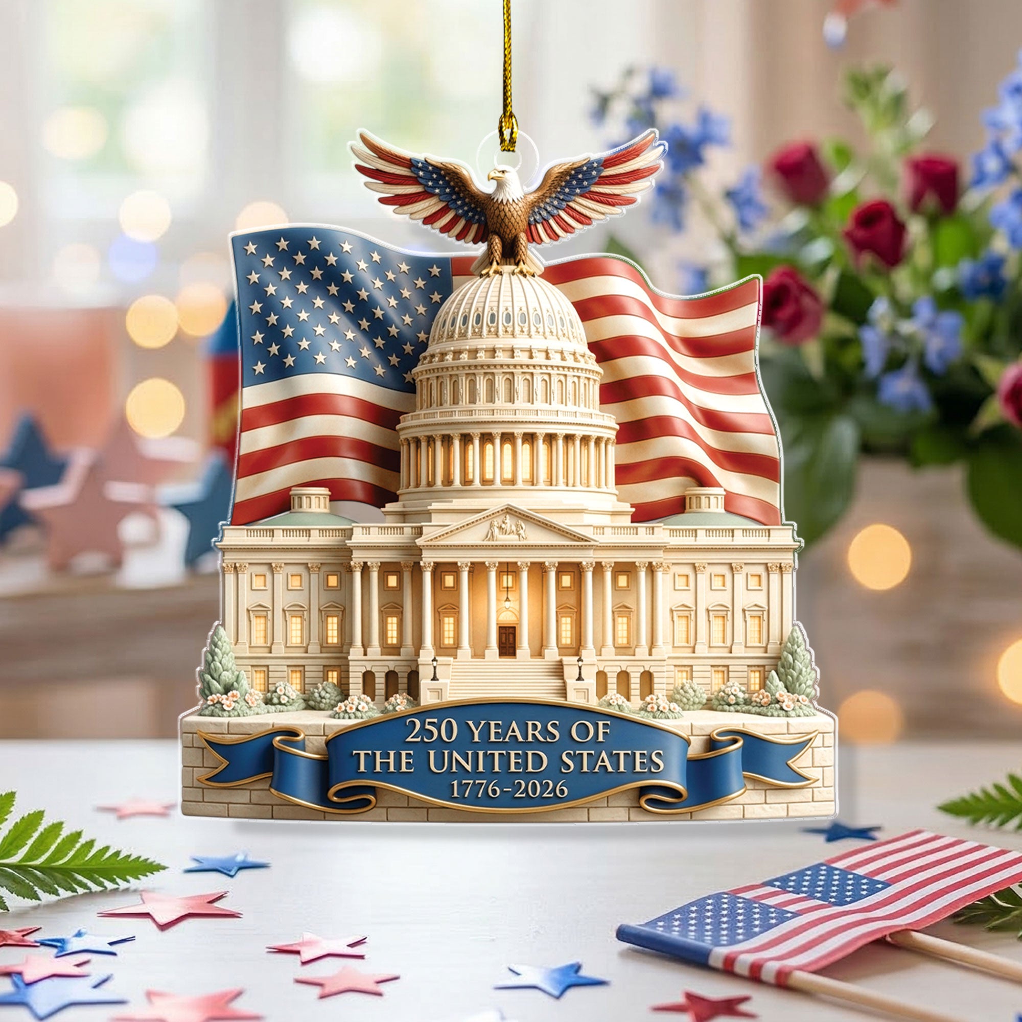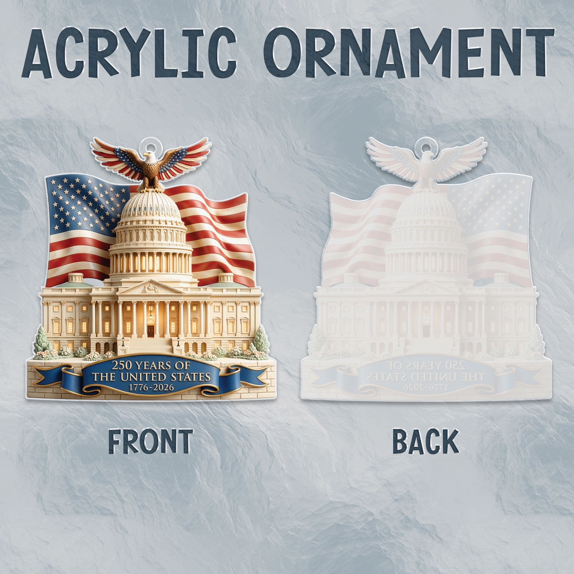 Celebrate America’s 250th anniversary from 1776 to 2026 with this flat acrylic ornament featuring a stunning 3D-illusion print. The design showcases the iconic US Capitol building framed by a grand waving American flag and a majestic eagle, capturing the enduring legacy of the United States. Crafted from durable, high-quality acrylic, this lightweight ornament is perfect for hanging on Christmas trees, in windows, or as year-round patriotic decor. Ideal for history enthusiasts, veterans, and patriots, it adds a touch of national pride to homes, offices, or holiday displays. Easy to display with included hanging hardware, it’s a meaningful gift for Independence Day, Memorial Day, or any occasion honoring American heritage.