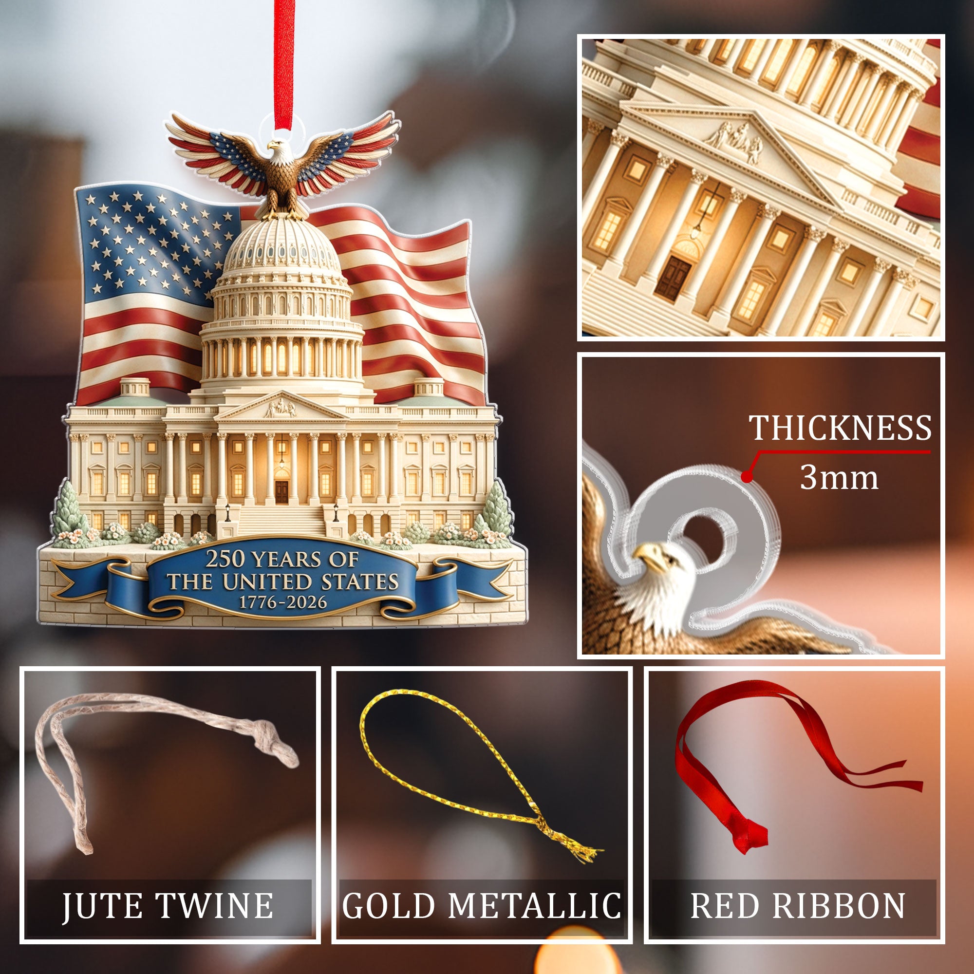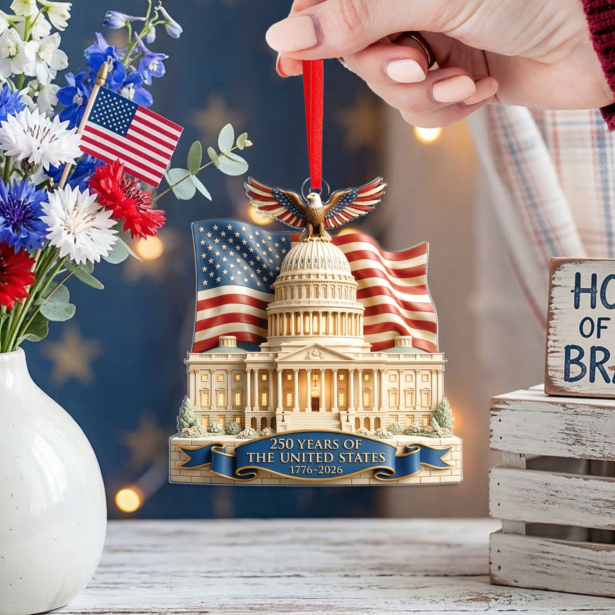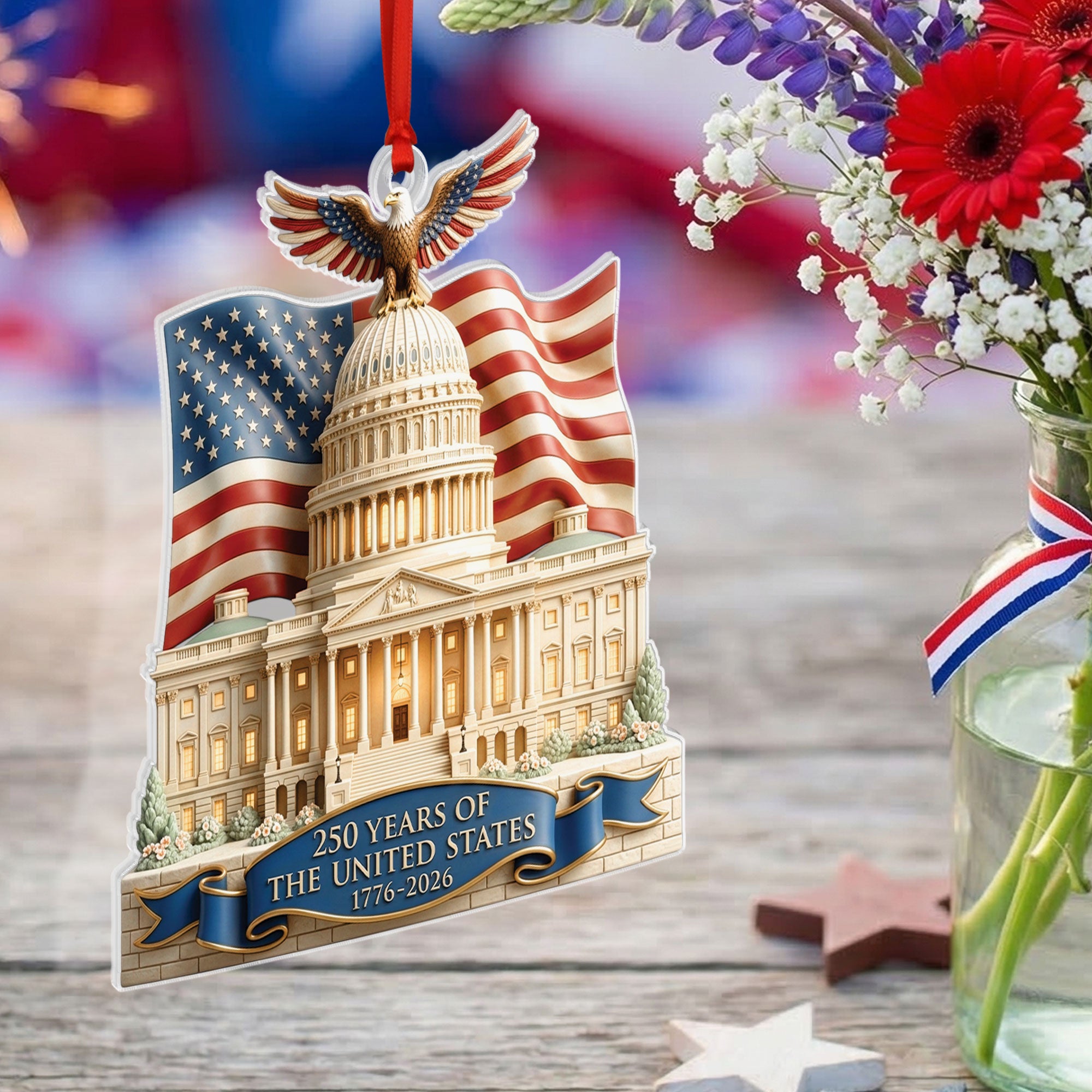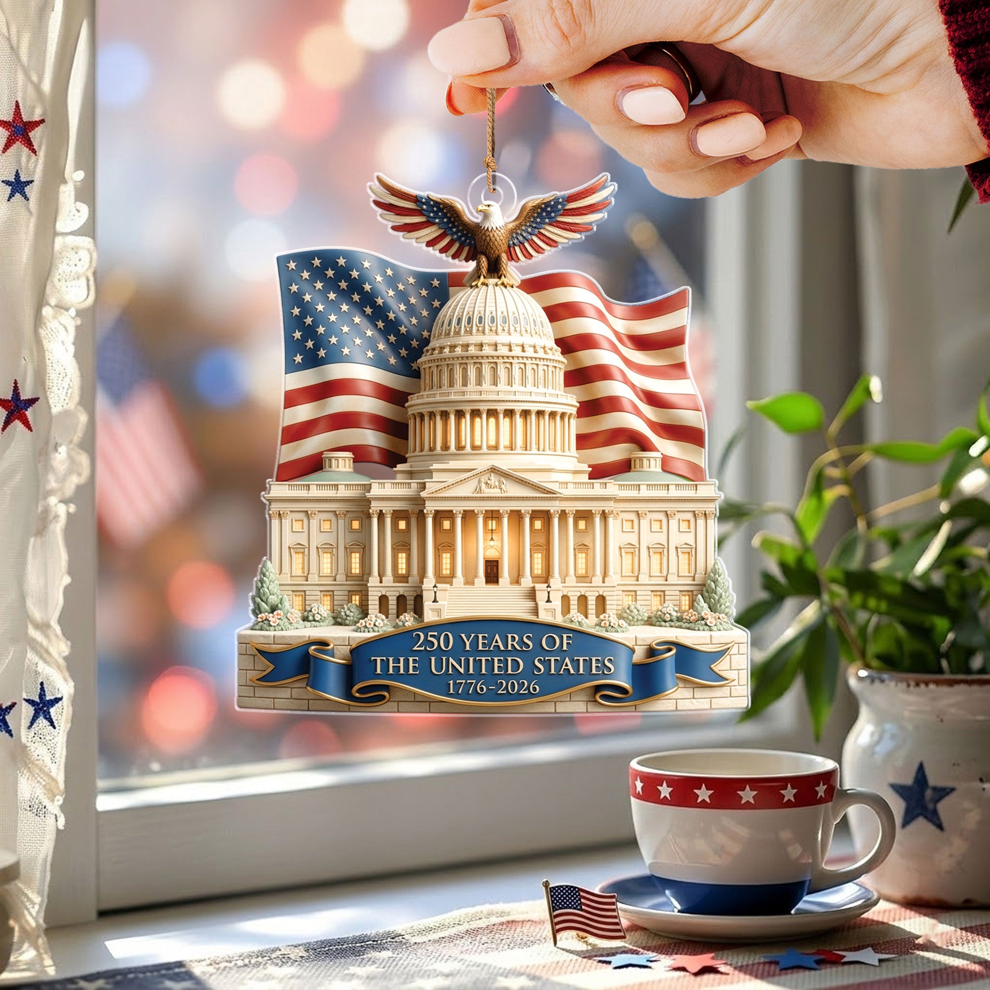 Celebrate America’s 250th anniversary from 1776 to 2026 with this flat acrylic ornament featuring a stunning 3D-illusion print. The design showcases the iconic US Capitol building framed by a grand waving American flag and a majestic eagle, capturing the enduring legacy of the United States. Crafted from durable, high-quality acrylic, this lightweight ornament is perfect for hanging on Christmas trees, in windows, or as year-round patriotic decor. Ideal for history enthusiasts, veterans, and patriots, it adds a touch of national pride to homes, offices, or holiday displays. Easy to display with included hanging hardware, it’s a meaningful gift for Independence Day, Memorial Day, or any occasion honoring American heritage.