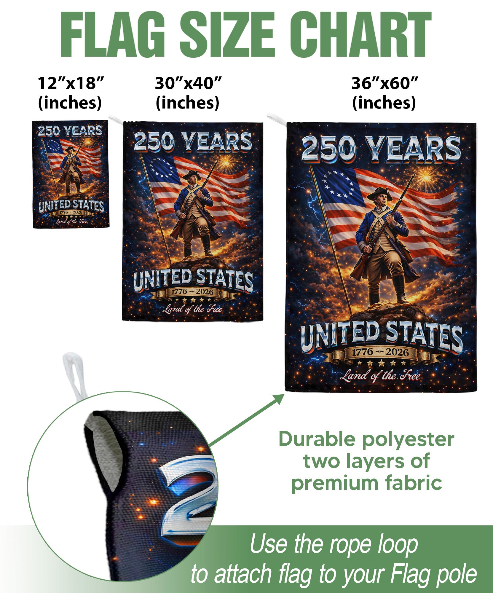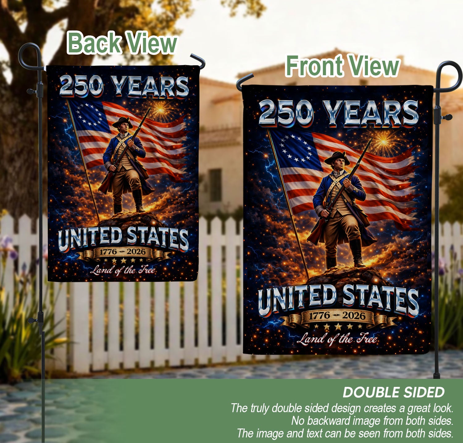 Honor 250 years of American independence with this striking United States garden flag. Featuring a bold revolutionary soldier and waving American flag design, it commemorates the journey from 1776 to 2026 as the Land of the Free. Crafted from durable, weather-resistant polyester fabric, this double-sided garden flag measures approximately 12.5 x 18 inches, perfect for standard garden flag poles. Display it proudly in your front yard, garden, porch, or at patriotic events like Fourth of July celebrations, Memorial Day, or Veterans Day. The vibrant colors and high-quality print ensure it withstands outdoor elements while showcasing national pride and historical heritage. Easy to hang and remove, it’s an inspiring addition to any outdoor space that celebrates American strength and freedom.