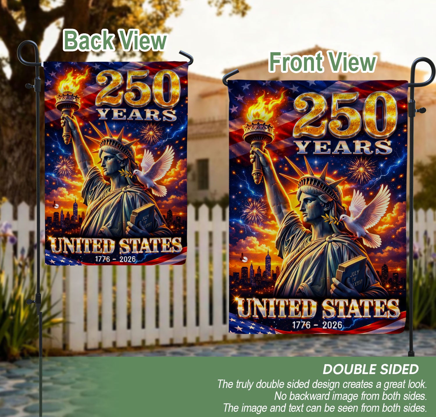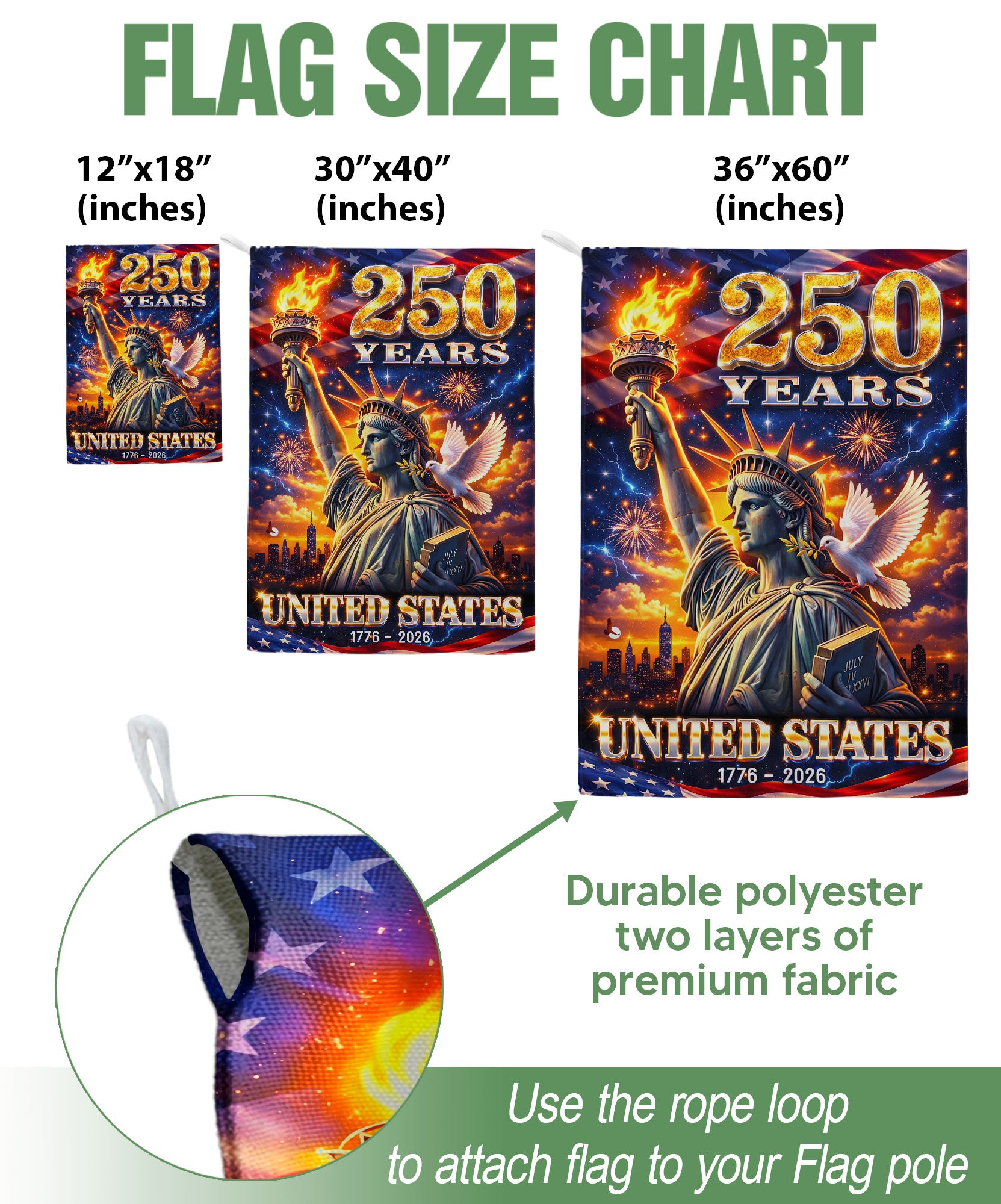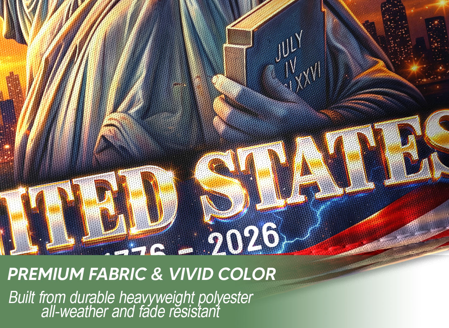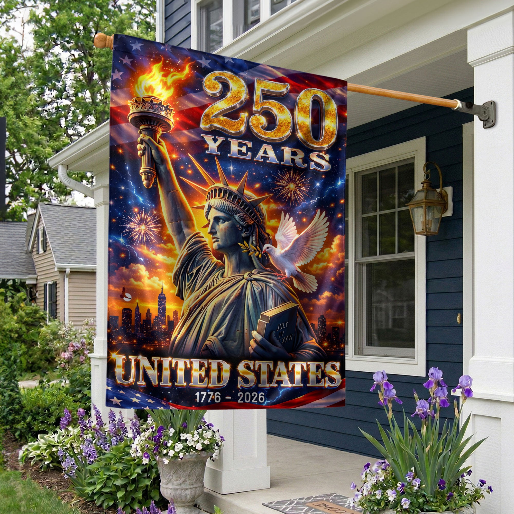 Celebrate 250 years of American independence with this striking house flag featuring the iconic Statue of Liberty holding a glowing torch, surrounded by bold patriotic elements. Perfect for displaying on your porch, garage, or garden during the 1776-2026 anniversary celebrations, Fourth of July events, or as an everyday symbol of hope, unity, and freedom. Crafted from durable, weather-resistant polyester fabric with vibrant double-sided printing that withstands wind, rain, and sun. Double-stitched edges and premium brass grommets ensure easy hanging on flag poles or brackets. Measures standard house flag size for maximum visual impact. Ideal for patriots, history enthusiasts, and homeowners wanting to showcase national pride.