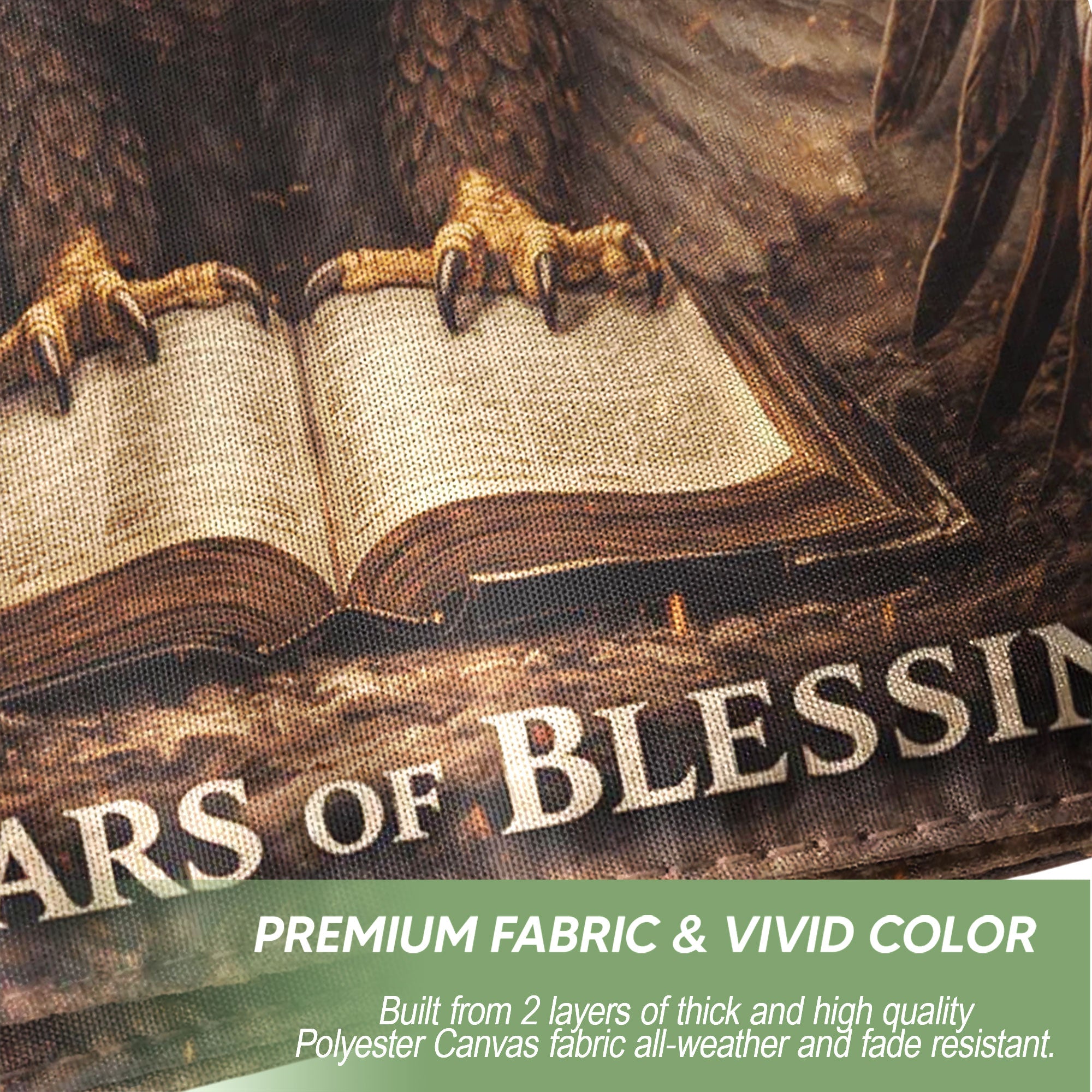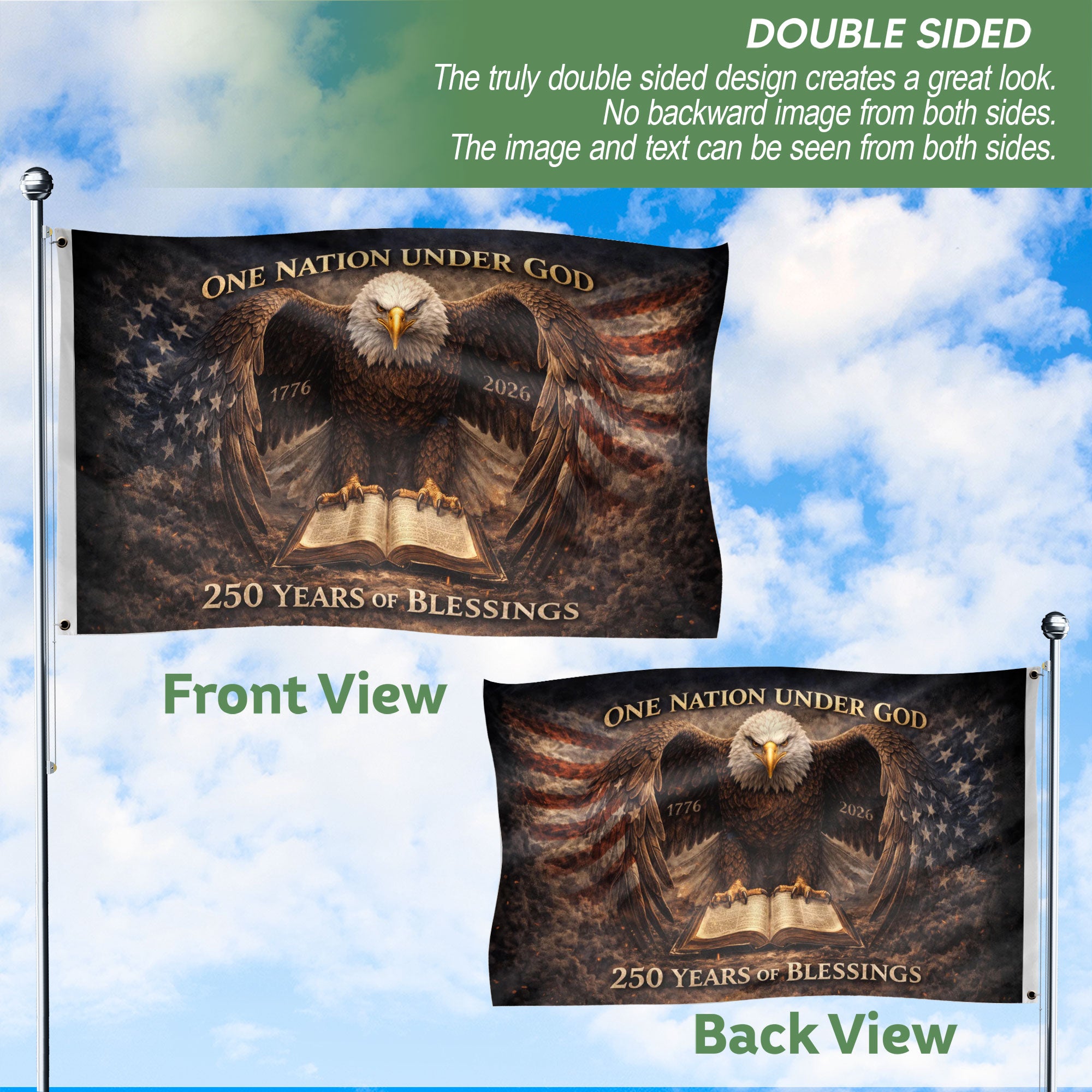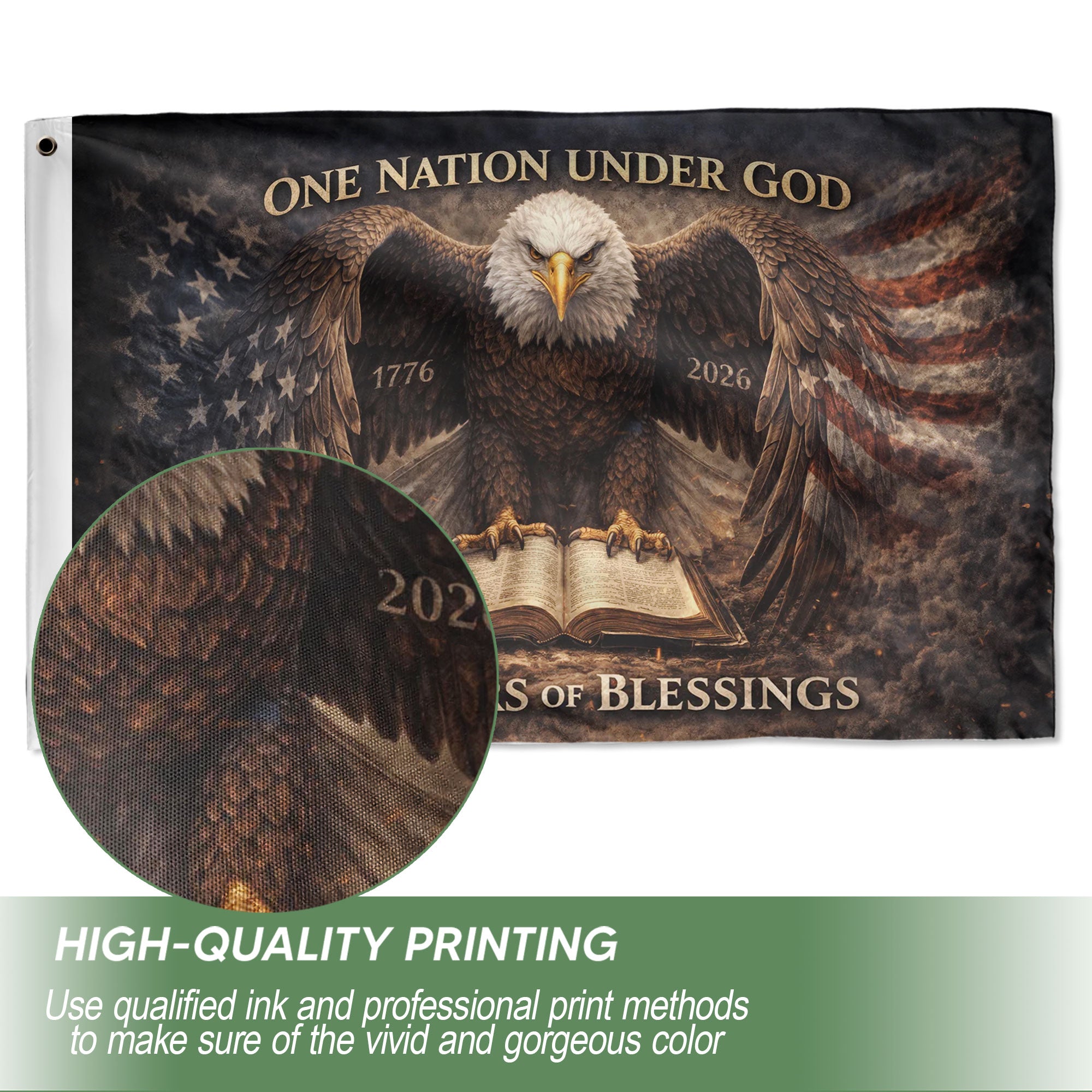 Celebrate 250 years of American independence from 1776 to 2026 with this double-sided patriotic flag banner. The striking design features a majestic eagle clutching the Holy Bible, symbolizing the nation’s religious heritage, enduring blessings, and spiritual foundation of liberty. Crafted from durable, weather-resistant polyester fabric, this high-quality banner withstands outdoor conditions for long-lasting display. Double-sided printing ensures the vibrant graphics and bold colors are visible from both sides, making it perfect for porches, fences, flagpoles, garages, or any prominent spot.