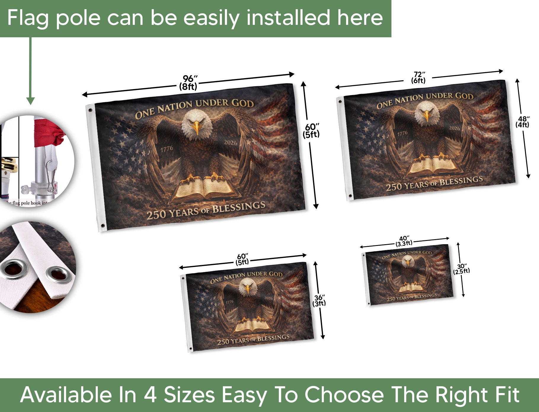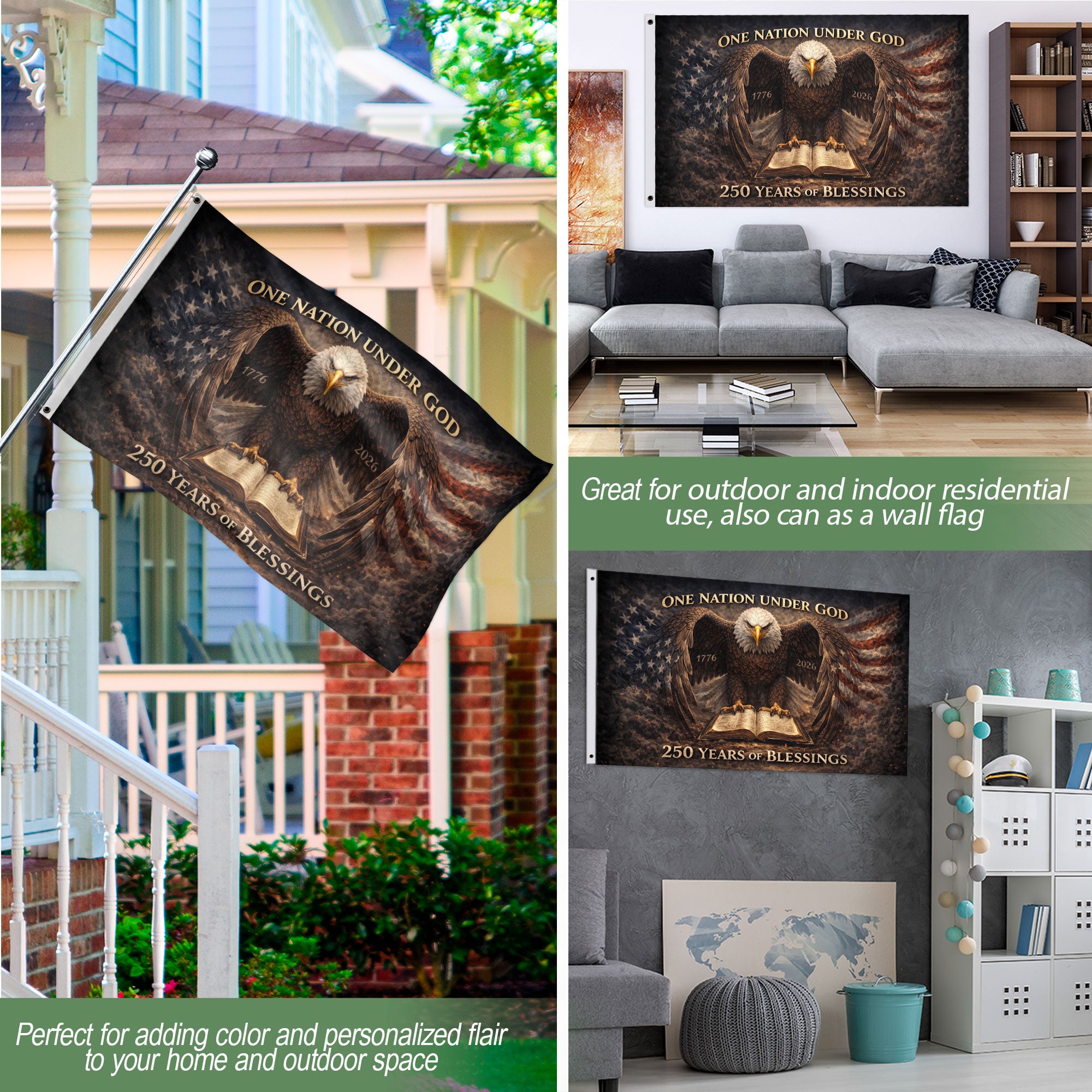Ideal for the semiquincentennial commemoration, parades, home displays, events, backyard gatherings, or patriotic celebrations. Show your devotion to faith, gratitude for America’s blessings, and pride in the principles of liberty that have sustained the nation for 250 years. Easy to hang with reinforced grommets, this faith-inspired USA flag banner measures standard size for versatile use. Honor the past, celebrate the present, and inspire the future with this unique 250th anniversary patriotic flag.