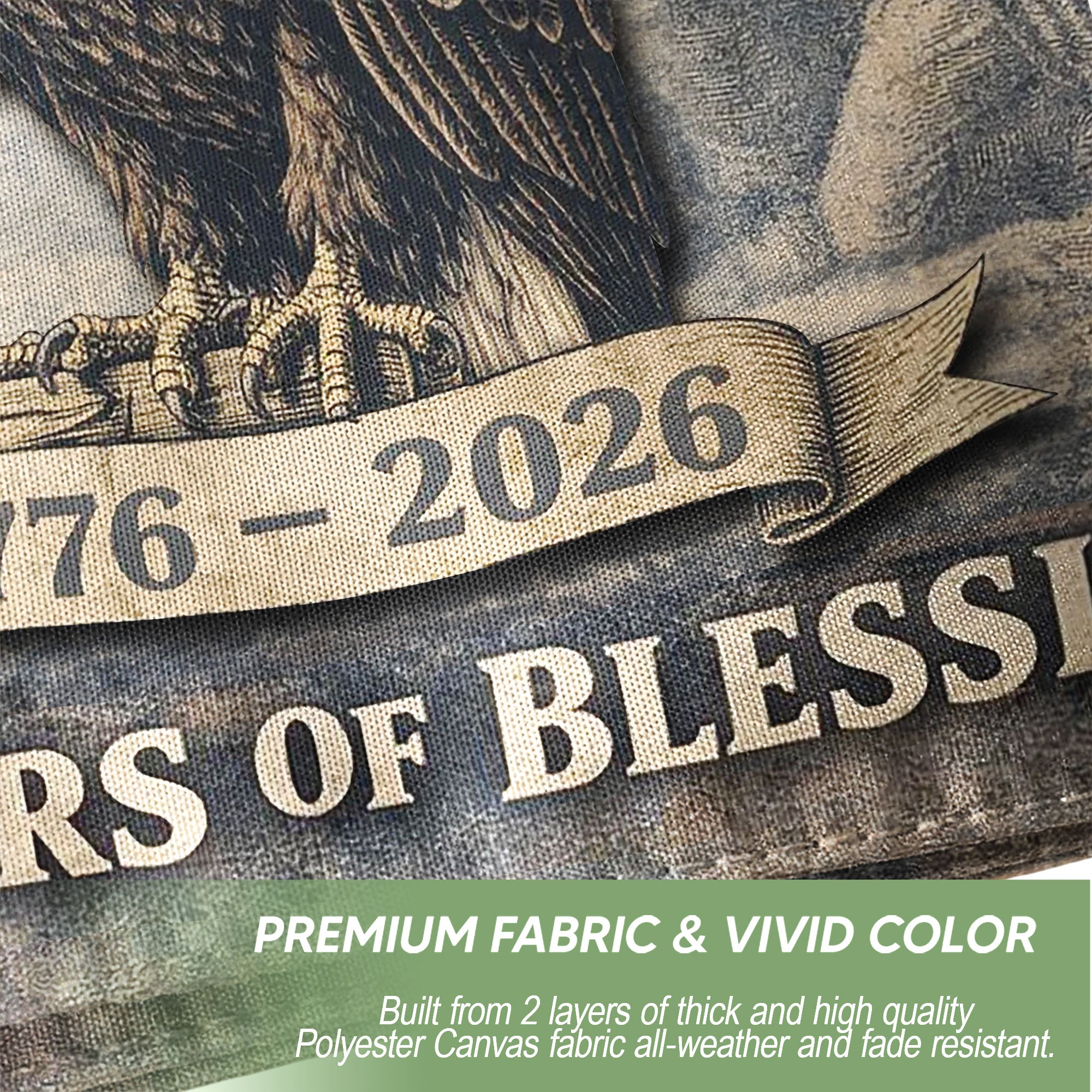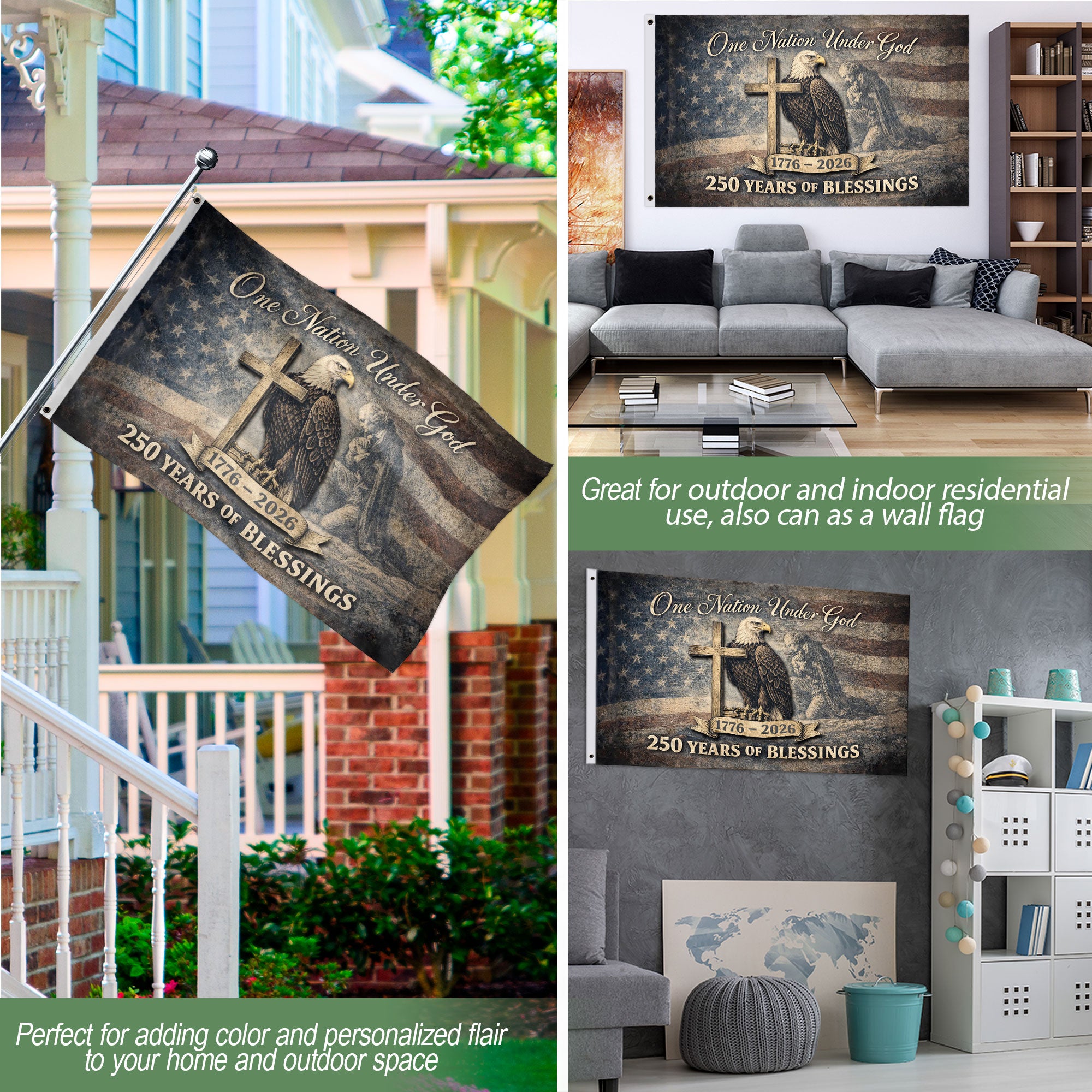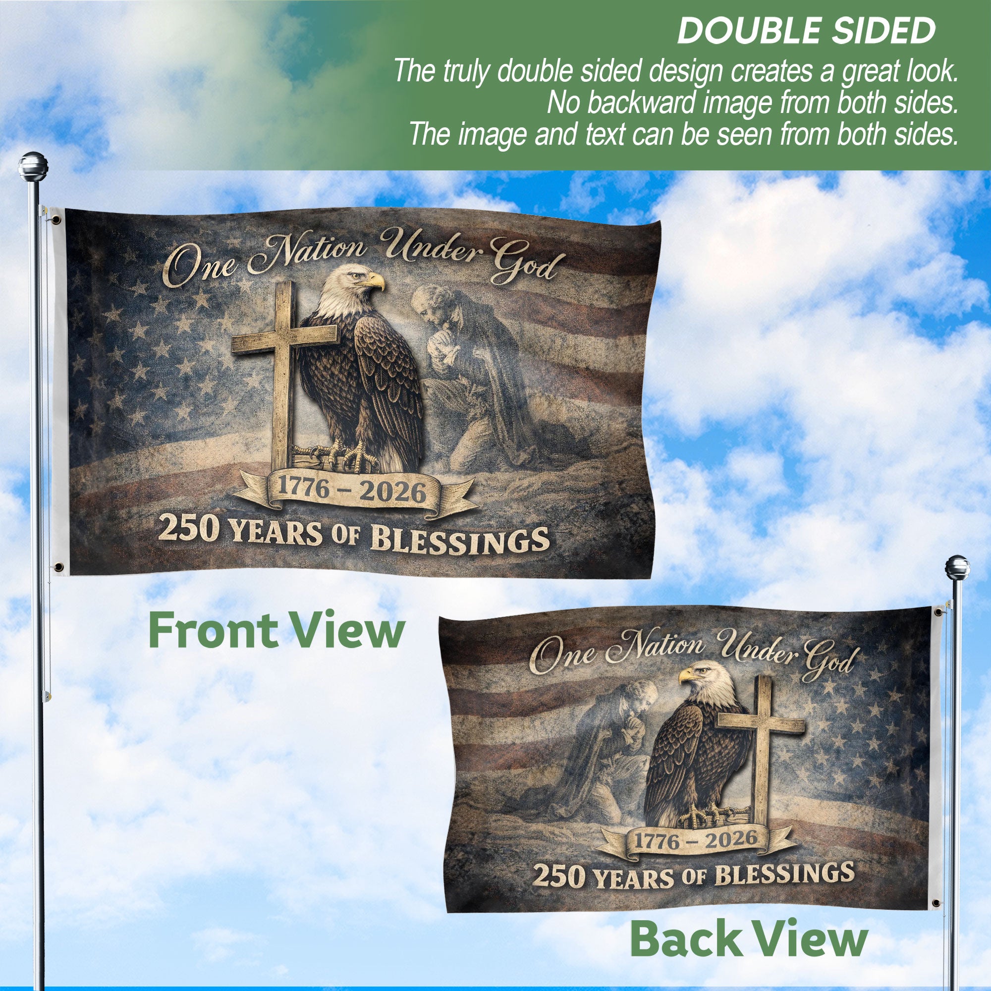 Celebrate 250 years of American heritage with this premium double-sided house flag. It features a striking Cross and Eagle design with ‘One Nation Under God 250 Years of Blessings’ text alongside the iconic USA flag. Spanning from 1776 to 2026, this flag symbolizes faith, strength, unity, and national pride. Made from high-quality polyester, it offers fade resistance, durability, and vibrant colors visible from both sides. Ideal for porches, patios, gardens, or any outdoor space, it withstands weather conditions while proudly displaying enduring American blessings across generations. Perfect for patriotic displays during holidays, anniversaries, or everyday pride.
