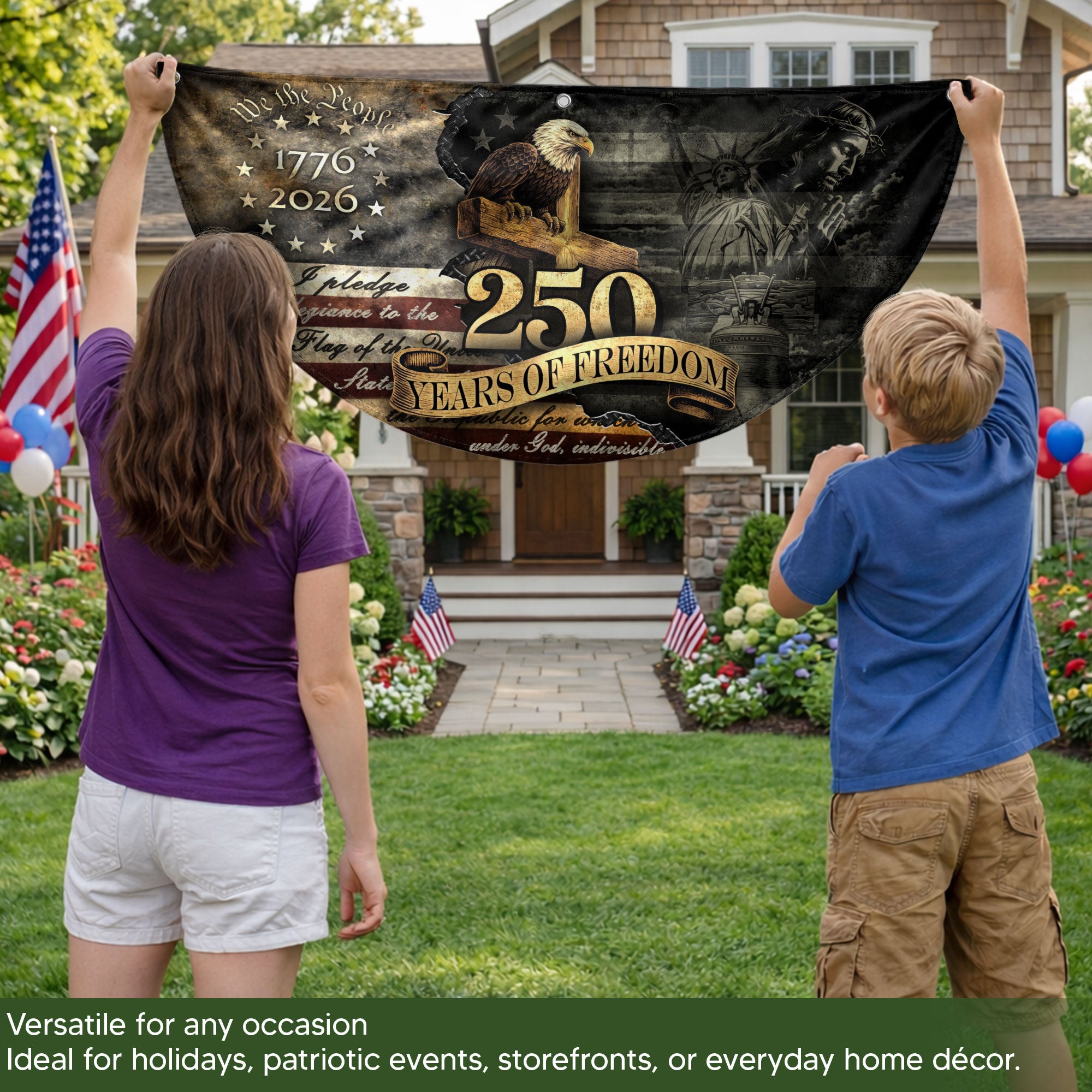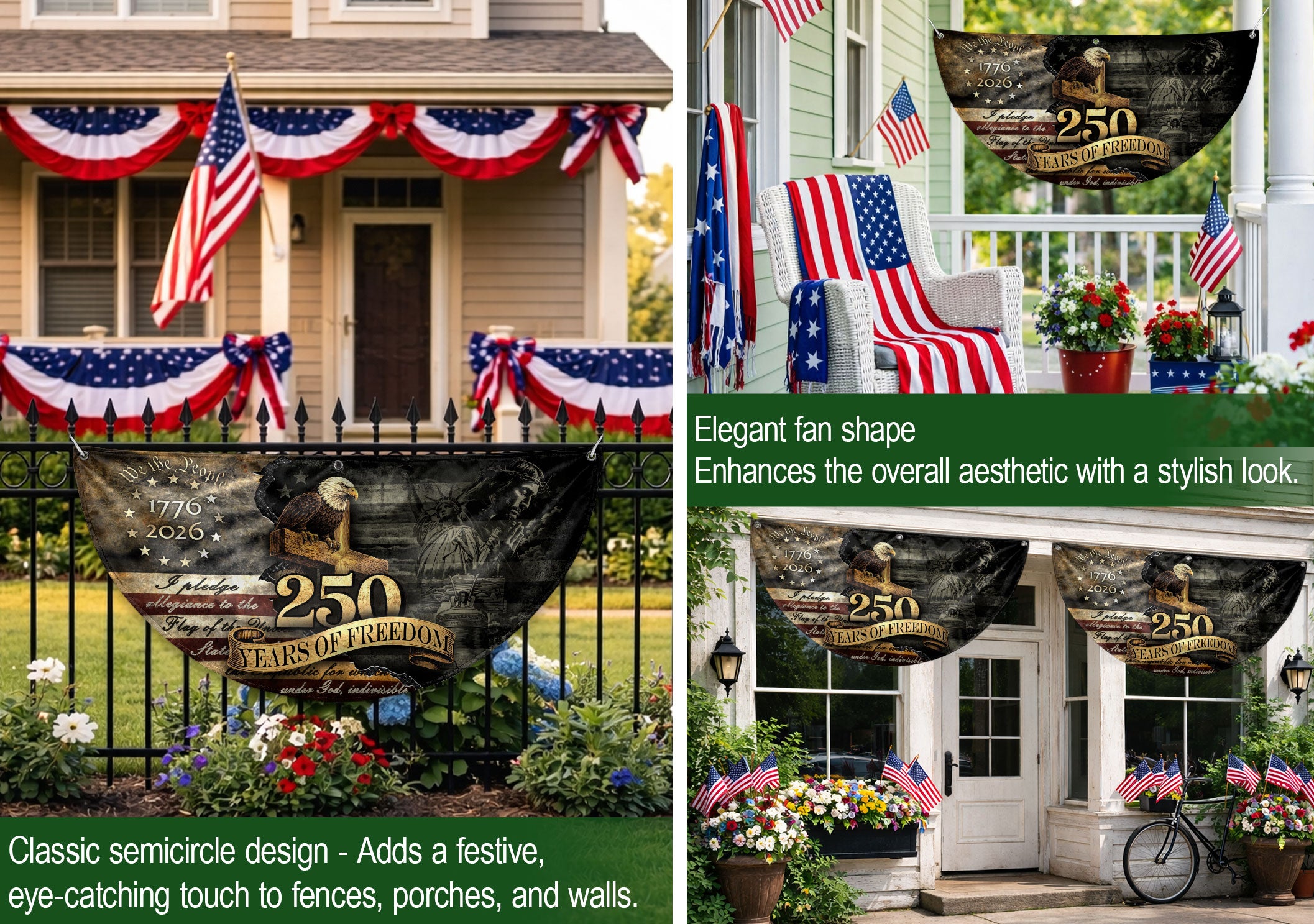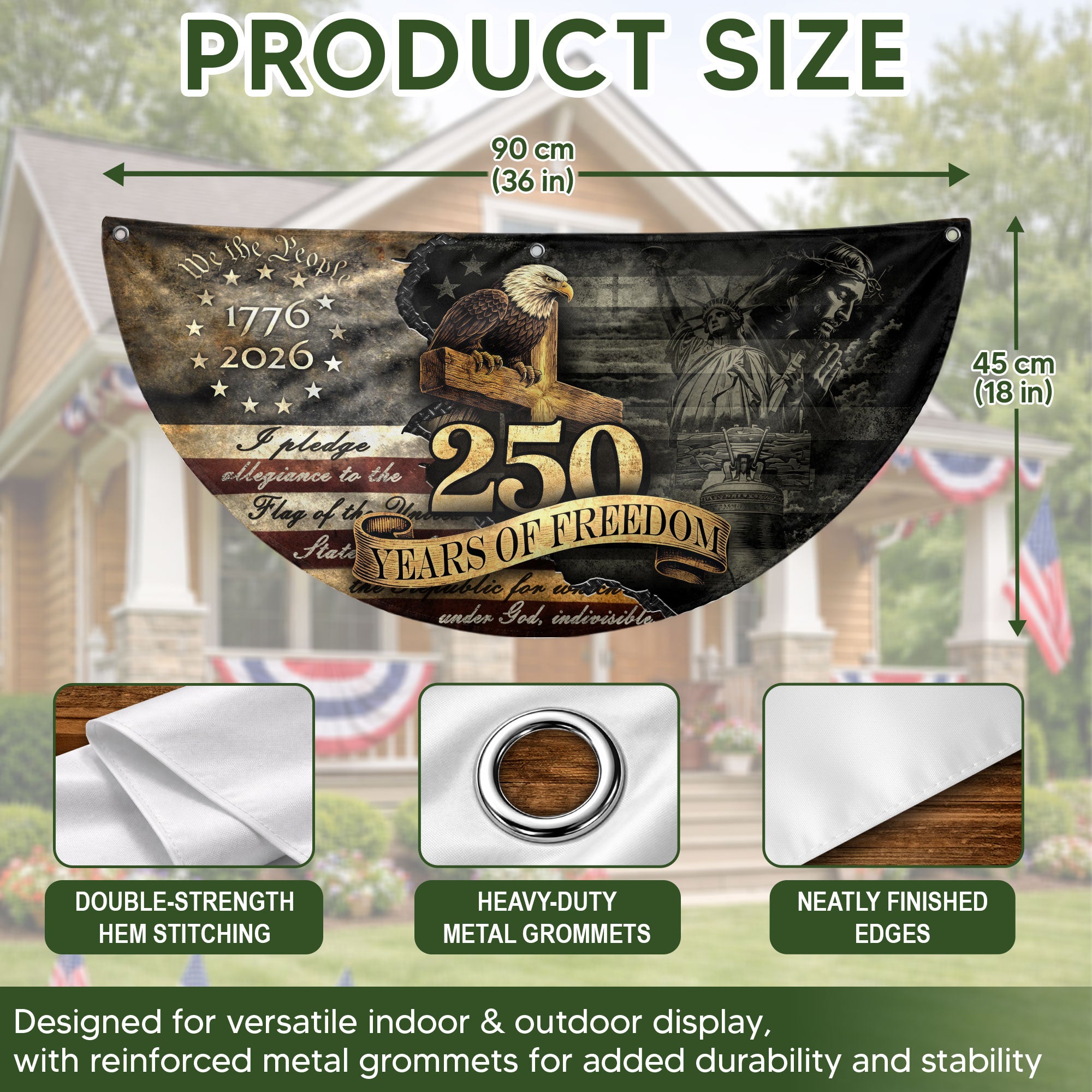 Celebrate 250 years of American independence with this vintage-style fence flag featuring a majestic eagle, historic elements, and the 1776-2026 timeline. Crafted for durability, this weather-resistant flag is perfect for outdoor display on fences, gardens, porches, or entryways. Its vibrant colors and high-quality polyester material resist fading from sun, wind, and rain, ensuring long-lasting patriotic pride. Easy to install with reinforced grommets or sleeves, it adds a touch of heritage and festivity to homes, events, or celebrations. Ideal for July 4th, anniversaries, or everyday American spirit.