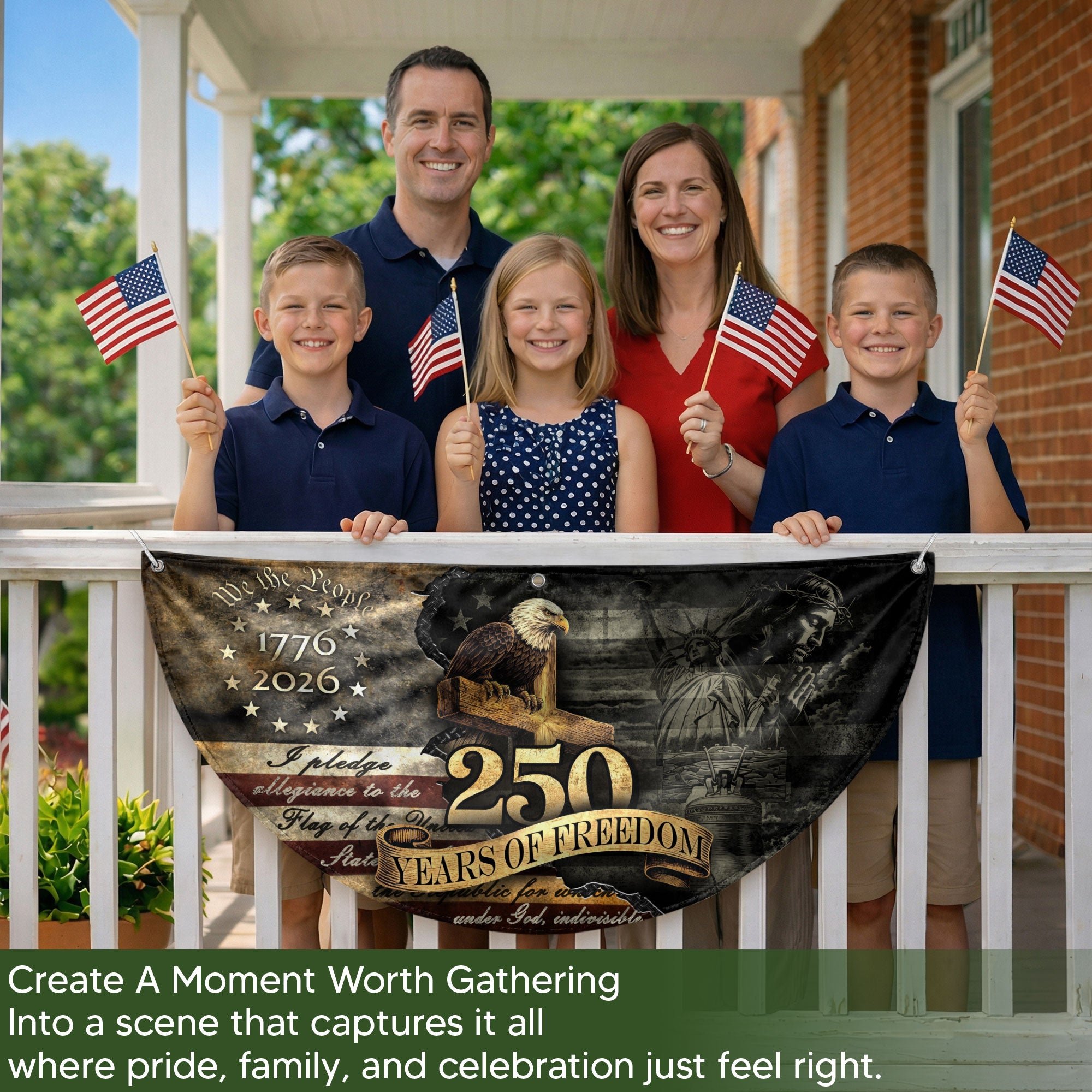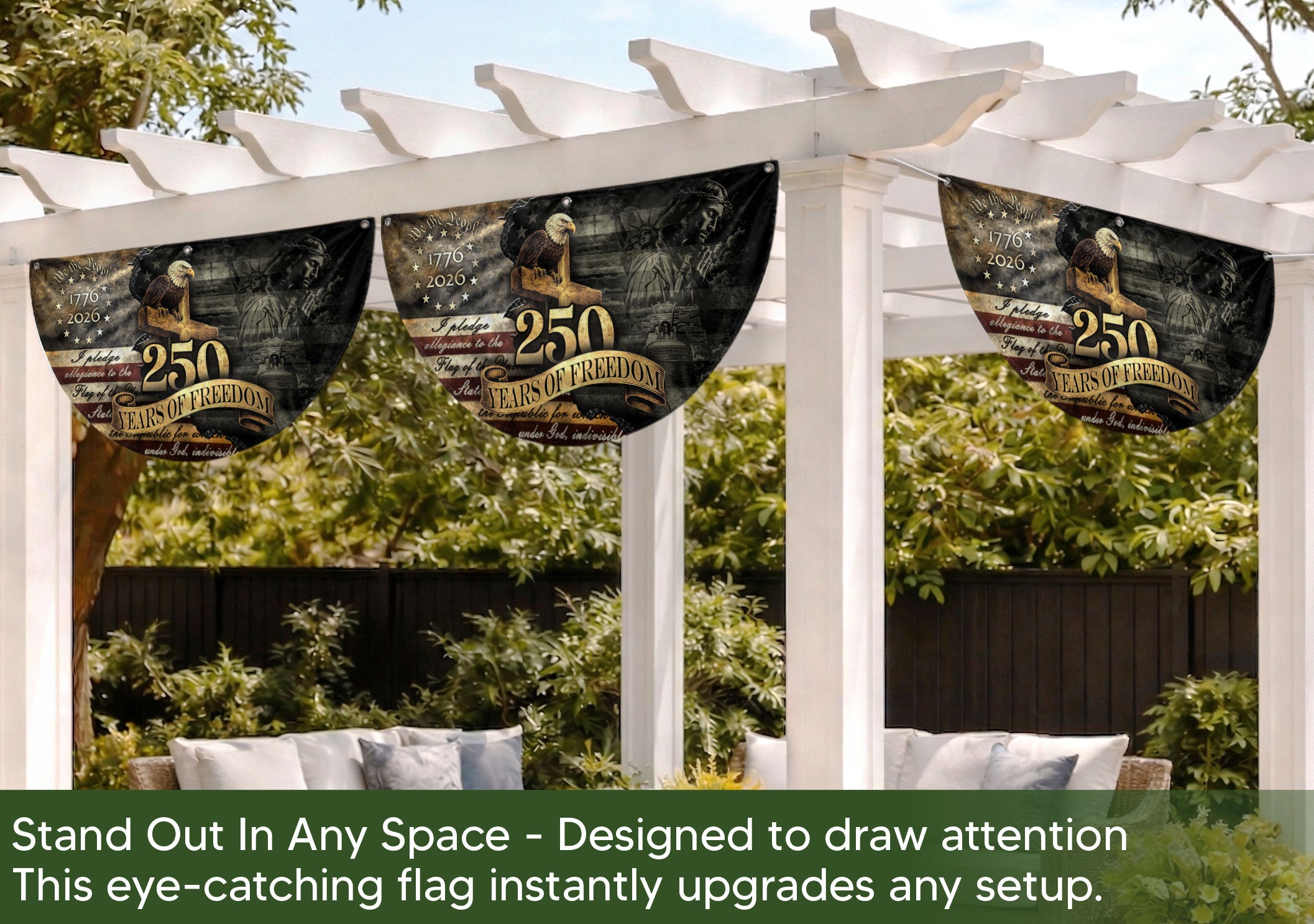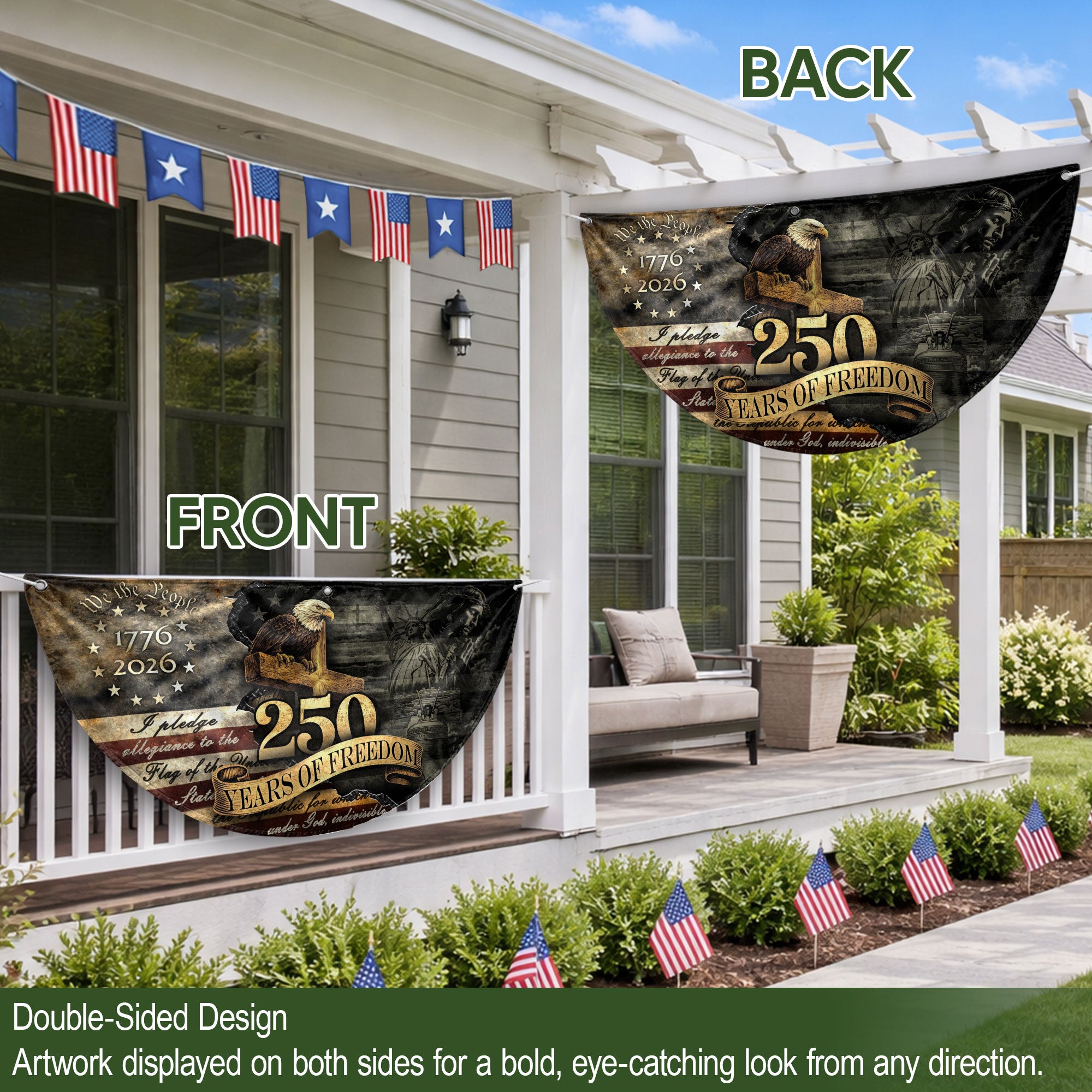 Celebrate 250 years of American independence with this vintage-style fence flag featuring a majestic eagle, historic elements, and the 1776-2026 timeline. Crafted for durability, this weather-resistant flag is perfect for outdoor display on fences, gardens, porches, or entryways. Its vibrant colors and high-quality polyester material resist fading from sun, wind, and rain, ensuring long-lasting patriotic pride. Easy to install with reinforced grommets or sleeves, it adds a touch of heritage and festivity to homes, events, or celebrations. Ideal for July 4th, anniversaries, or everyday American spirit.