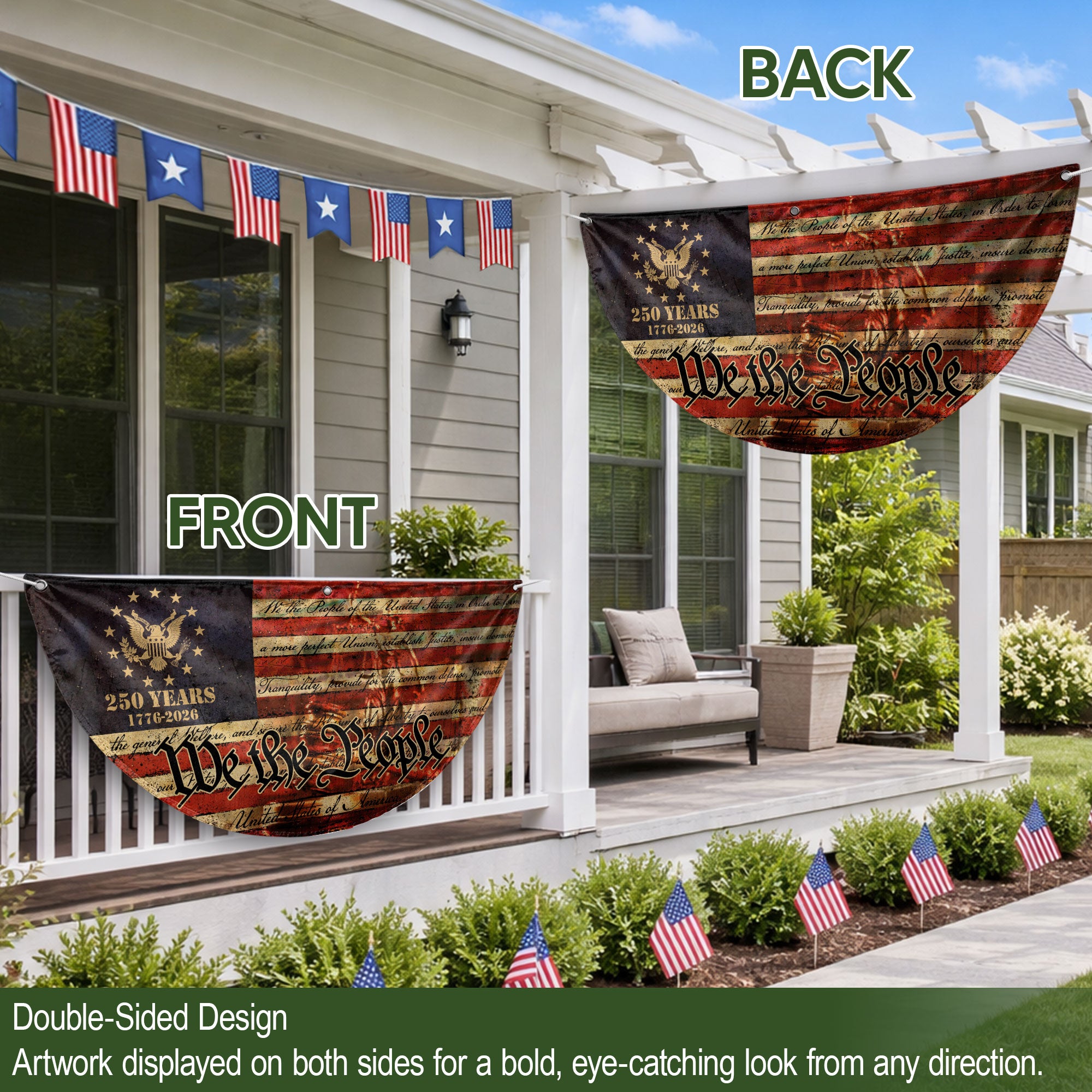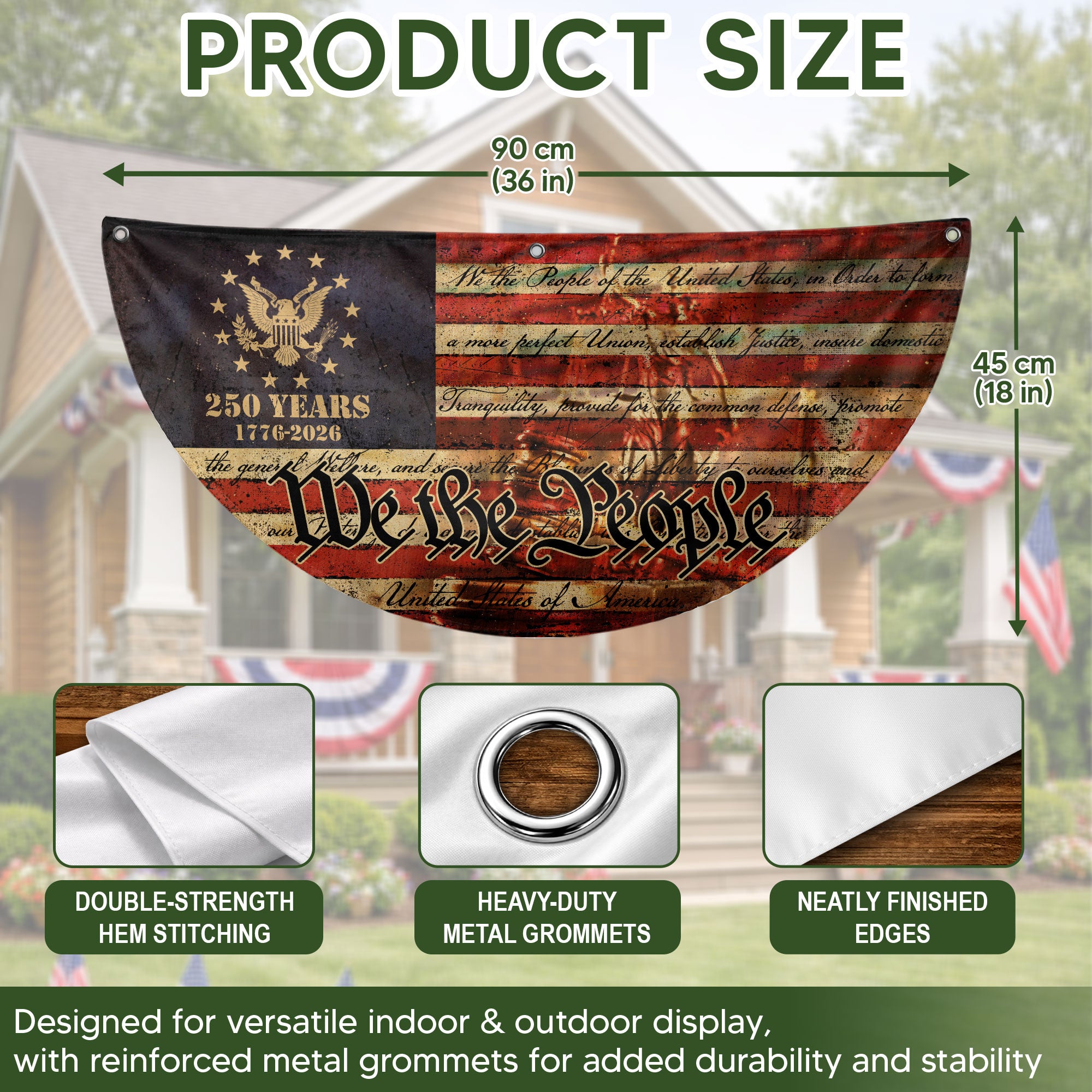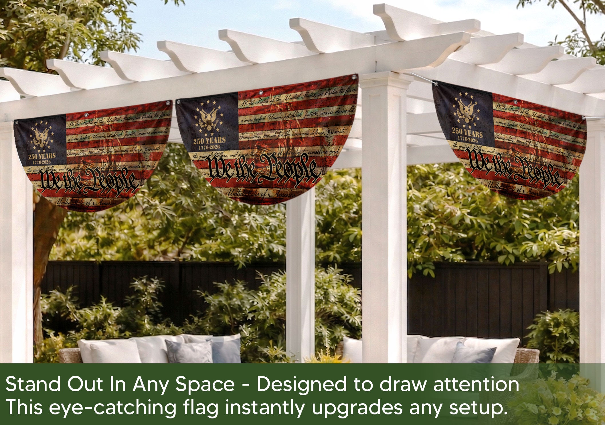 Celebrate the 250th anniversary of the United States in 2026 with this striking USA flag fence banner. Featuring the iconic ‘We the People’ inscription and a majestic eagle emblem, set against a classic red, white, and blue backdrop with the 1776-2026 milestone. This durable outdoor banner is perfect for displaying on fences, gardens, patios, or any outdoor space to honor American history, freedom, and patriotism. Made for weather-resistant use, it adds a bold patriotic touch to celebrations, parades, barbecues, or everyday displays of national pride. Ideal for history enthusiasts, veterans, and anyone commemorating the semiquincentennial.