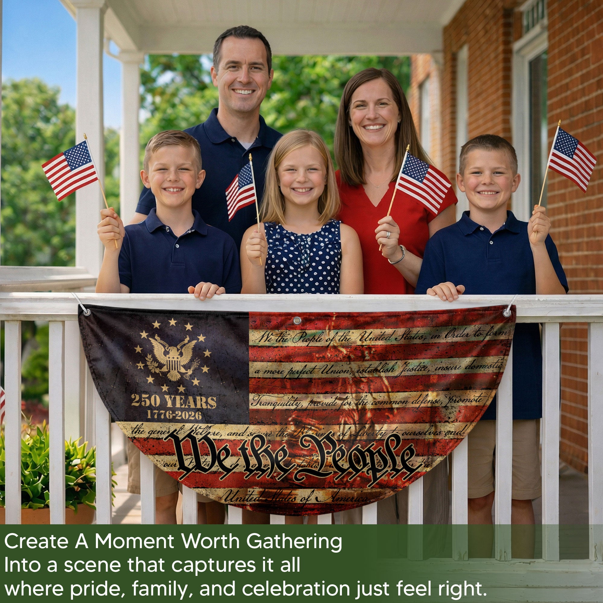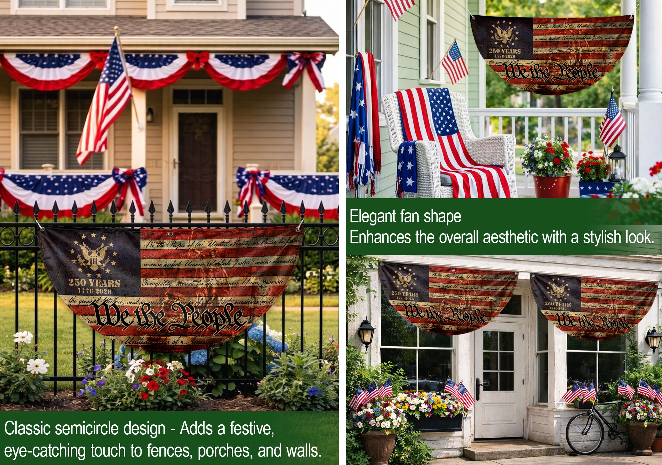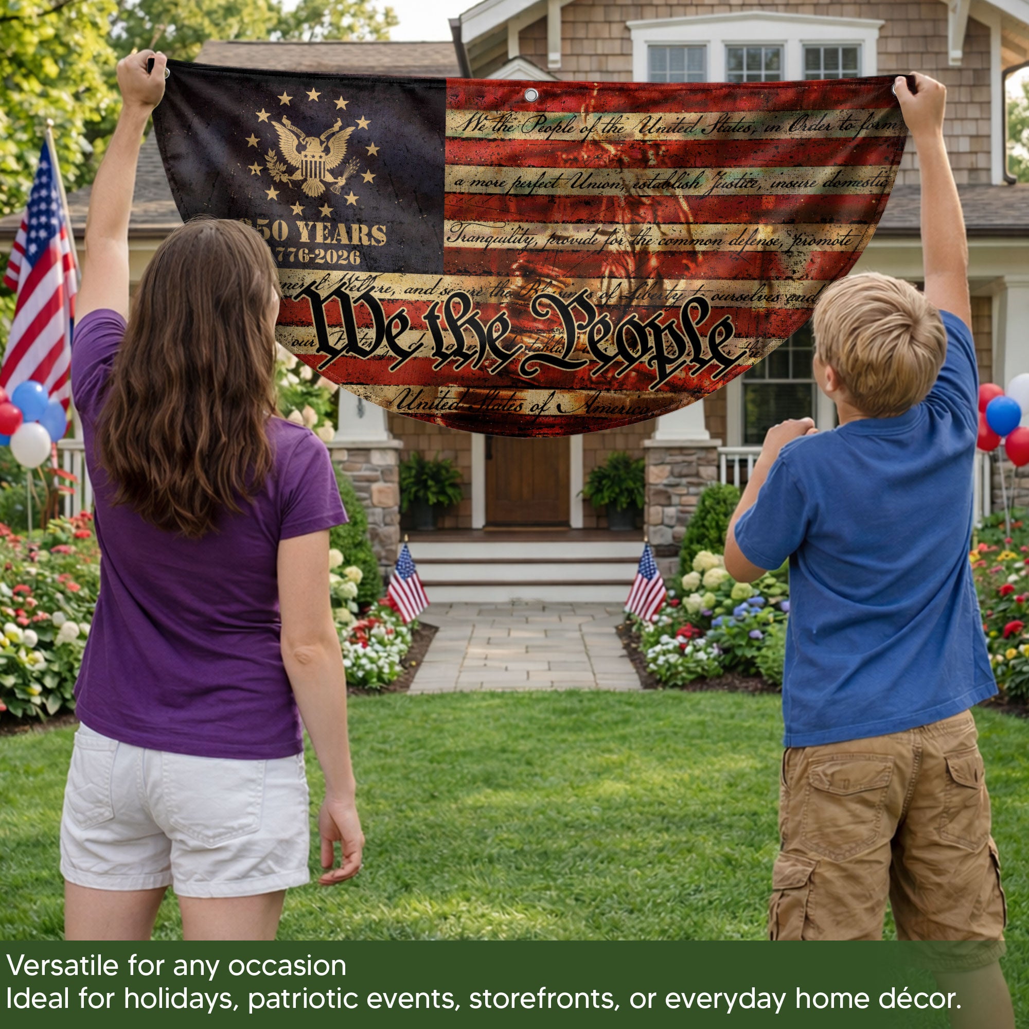 Celebrate the 250th anniversary of the United States in 2026 with this striking USA flag fence banner. Featuring the iconic ‘We the People’ inscription and a majestic eagle emblem, set against a classic red, white, and blue backdrop with the 1776-2026 milestone. This durable outdoor banner is perfect for displaying on fences, gardens, patios, or any outdoor space to honor American history, freedom, and patriotism. Made for weather-resistant use, it adds a bold patriotic touch to celebrations, parades, barbecues, or everyday displays of national pride. Ideal for history enthusiasts, veterans, and anyone commemorating the semiquincentennial.