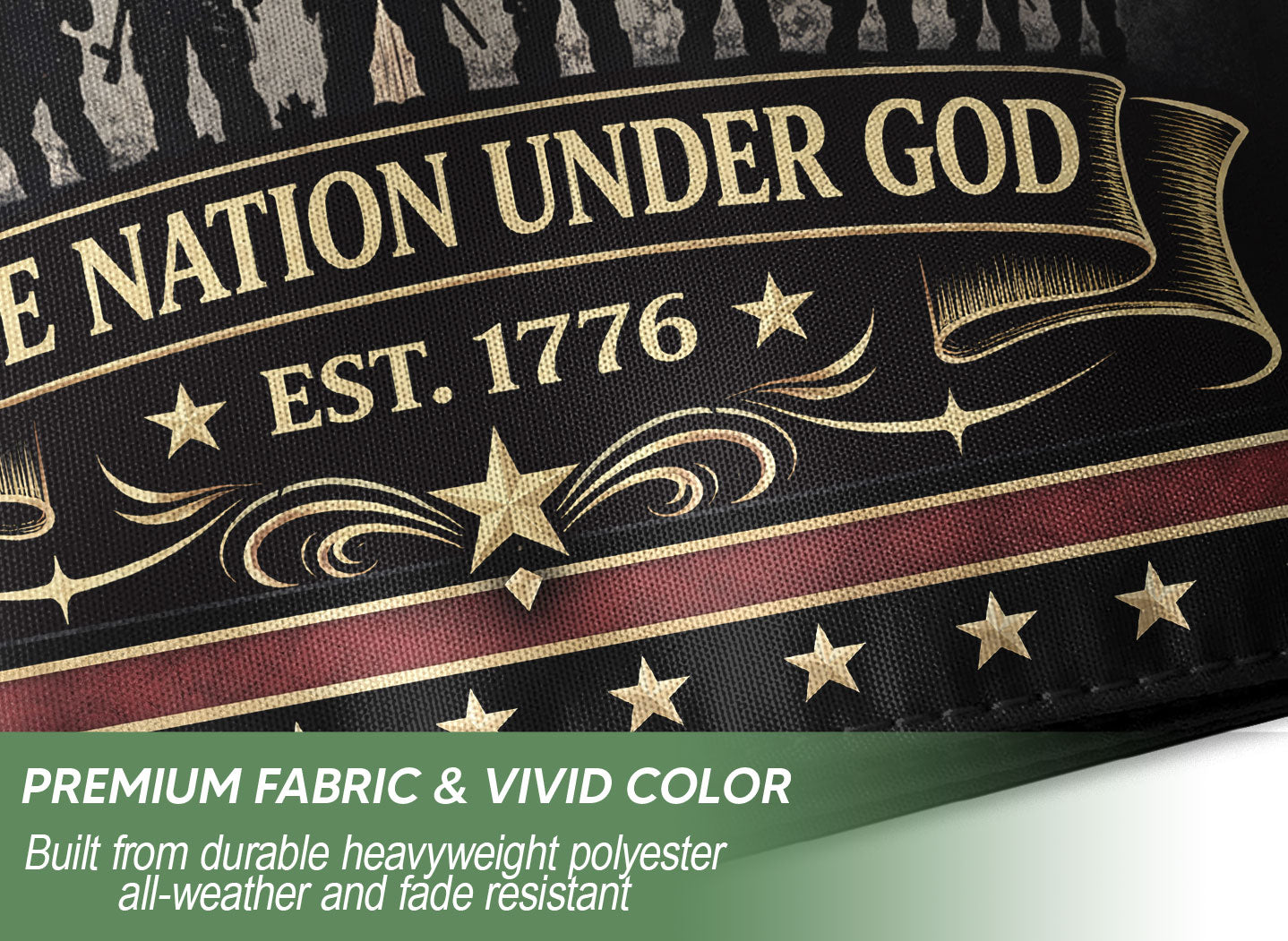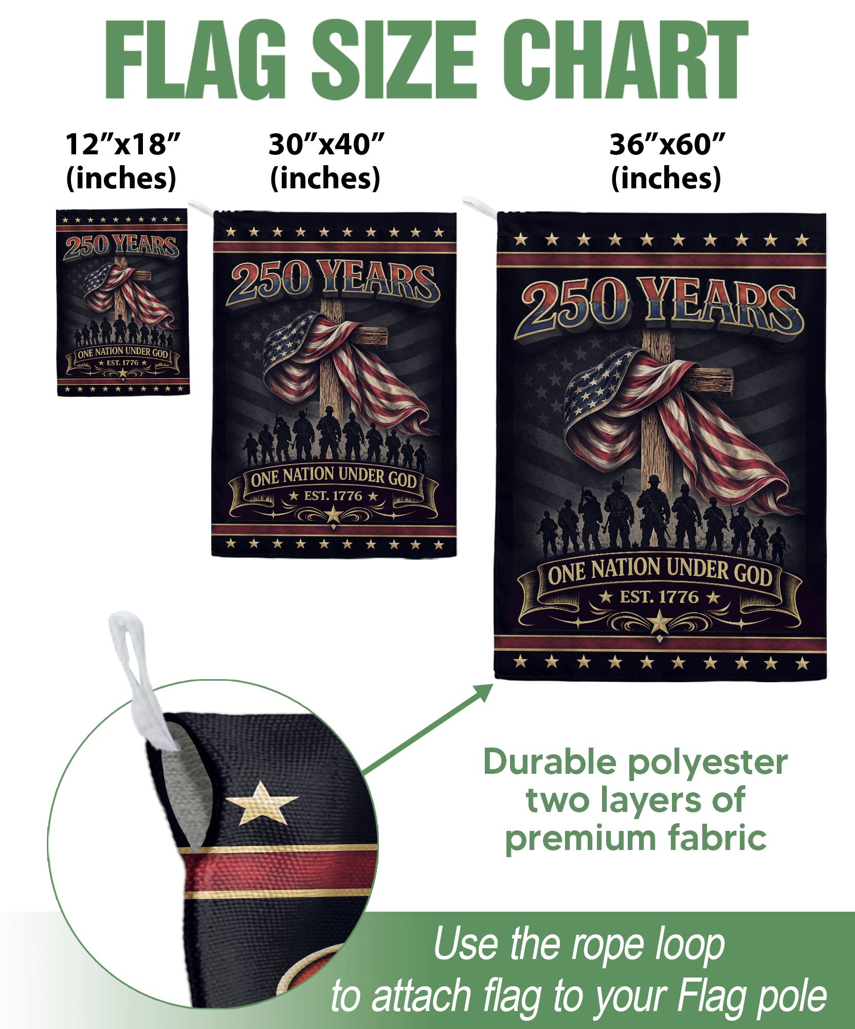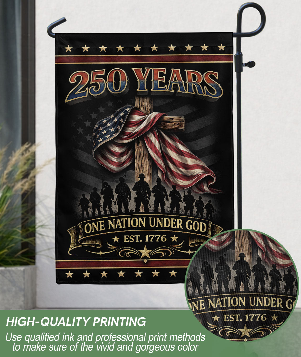 Celebrate 250 years of American independence with this double-sided garden flag featuring ‘One Nation Under God’ and ‘We The People’ messages. The striking design showcases a powerful eagle, prominent cross, and classic patriotic accents in red, white, and blue. Crafted from durable, weather-resistant polyester fabric, this garden flag stands strong against the elements, perfect for displaying faith, freedom, and national pride in your yard, patio, or garden bed. Easy to attach to a garden stake (sold separately), it measures approximately 12.5 x 18 inches for eye-catching visibility. Ideal for Independence Day, Memorial Day, Fourth of July, or everyday display to honor American values, strength, and enduring spirit.