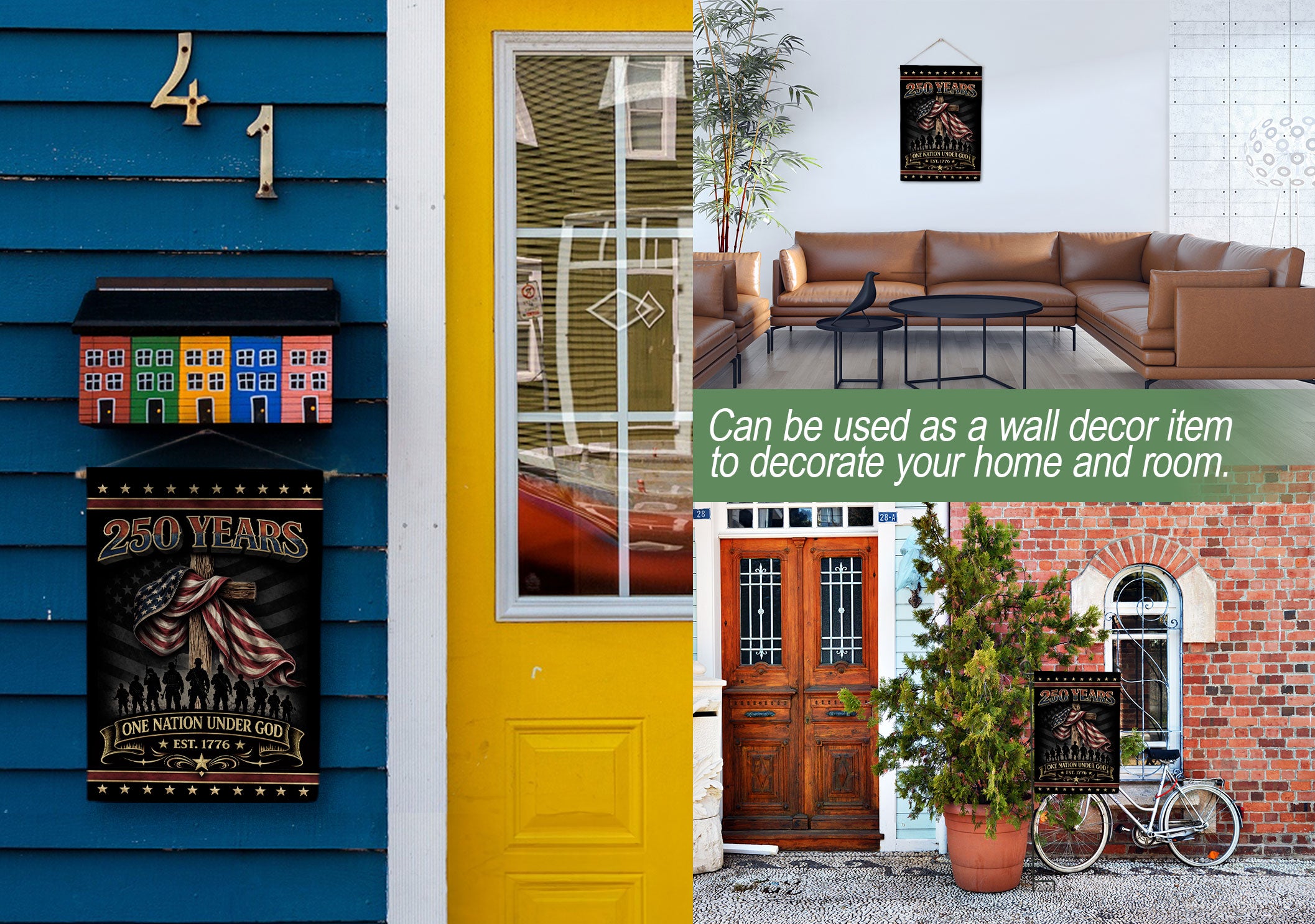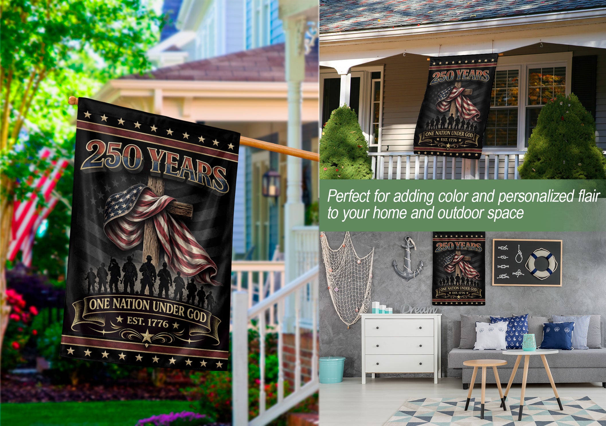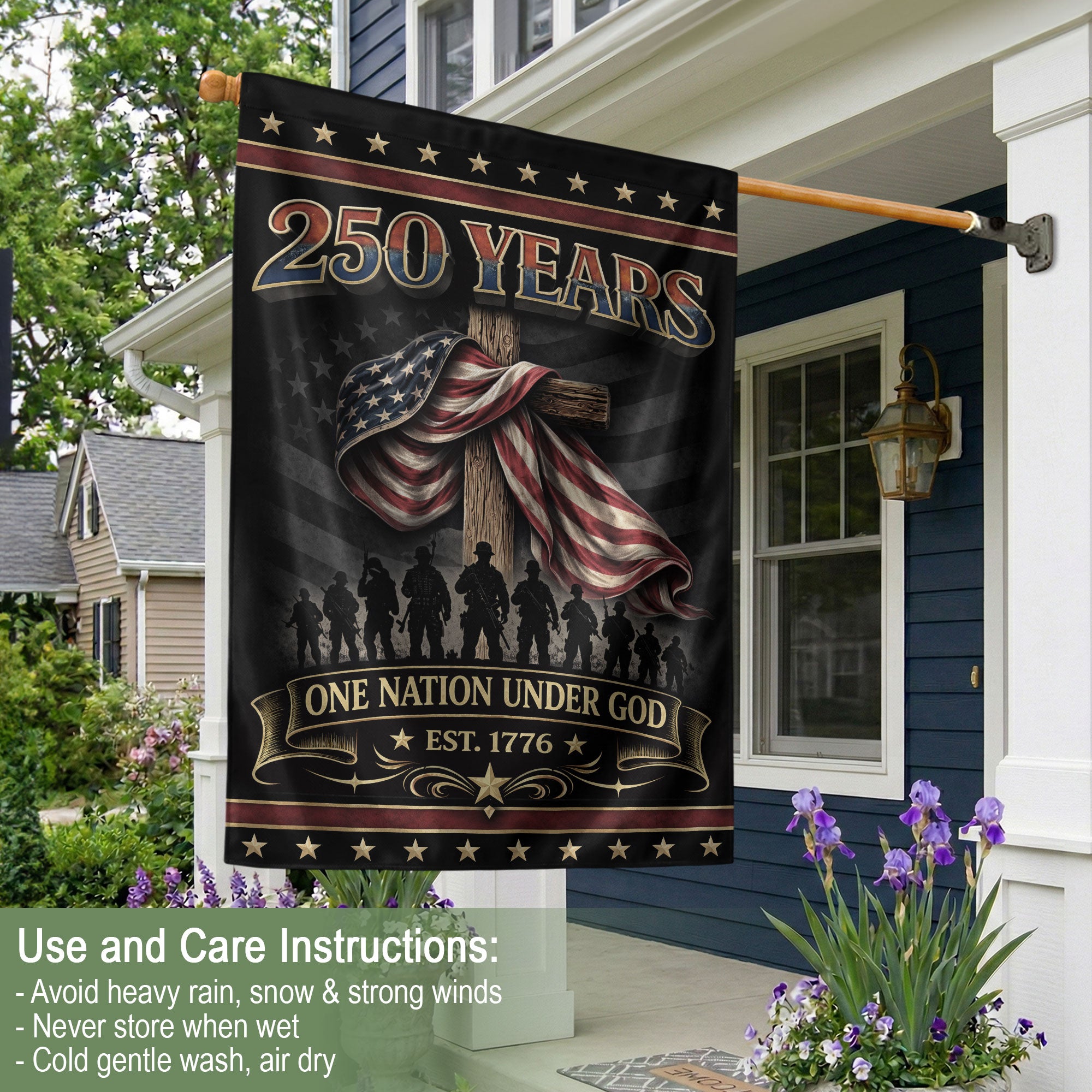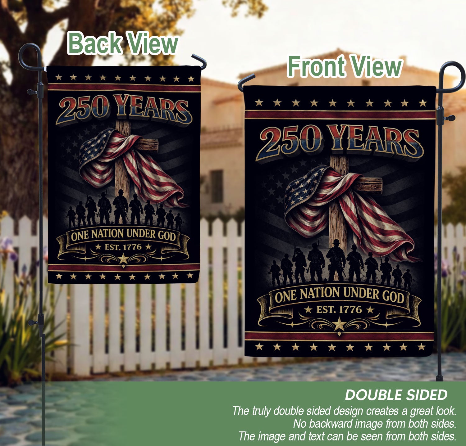Celebrate 250 years of American independence with this double-sided house flag featuring ‘One Nation Under God’ and ‘We The People’ messaging. The design showcases a powerful eagle, prominent cross, and classic patriotic accents in red, white, and blue. Crafted for durability, this garden flag stands proudly to represent faith, strength, freedom, and the enduring American spirit. Perfect for porches, patios, or yards during holidays, Independence Day, or everyday display. Fade-resistant fabric ensures long-lasting vibrancy in outdoor conditions.