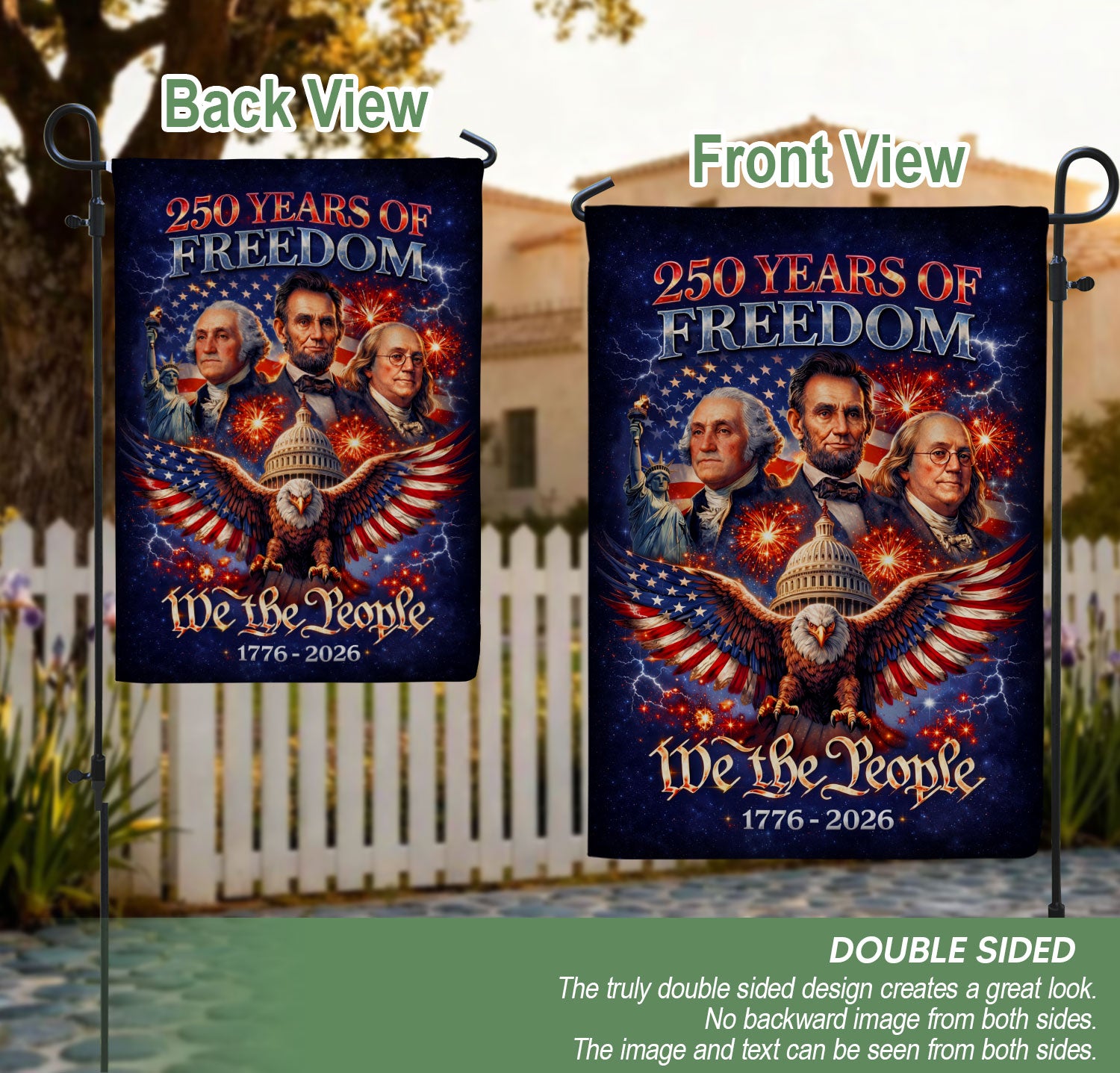 Celebrate America’s 250th anniversary with this double-sided garden flag honoring 250 years of freedom from 1776 to 2026. Featuring iconic founders George Washington, Abraham Lincoln, and Benjamin Franklin, this patriotic banner pays tribute to the visionaries who shaped the nation’s foundation. Crafted for durability, the flag displays leadership, unity, and the enduring pursuit of liberty on both sides for versatile outdoor display. Perfect for gardens, porches, mailboxes, or patriotic events. Made with high-quality, weather-resistant polyester fabric that withstands wind and elements while maintaining vibrant colors. Easy to hang with a sleeve for standard garden flag poles (pole not included). Ideal for history enthusiasts, Fourth of July celebrations, Memorial Day, or everyday display of American pride. Measures standard garden flag size for eye-catching appeal.