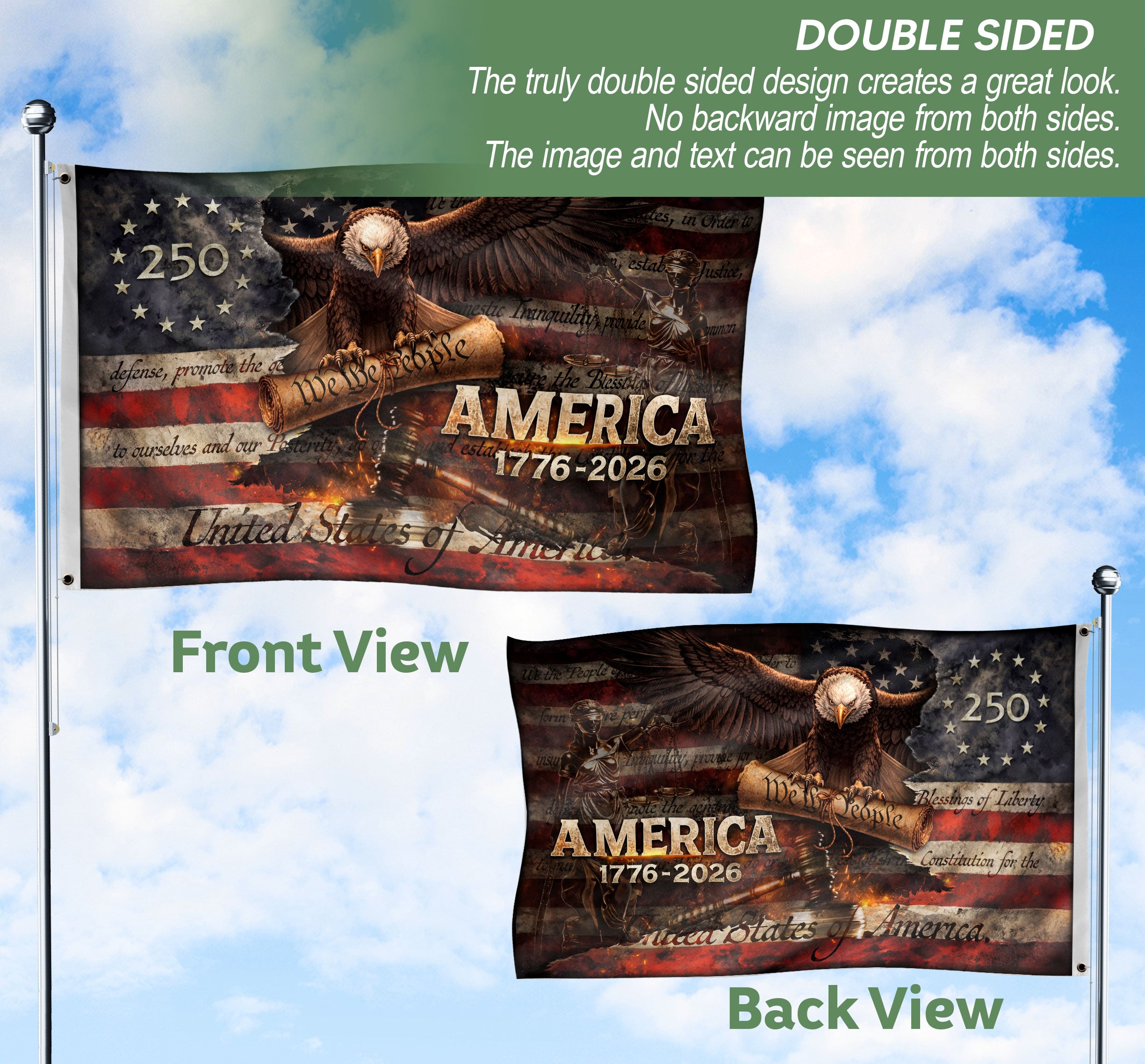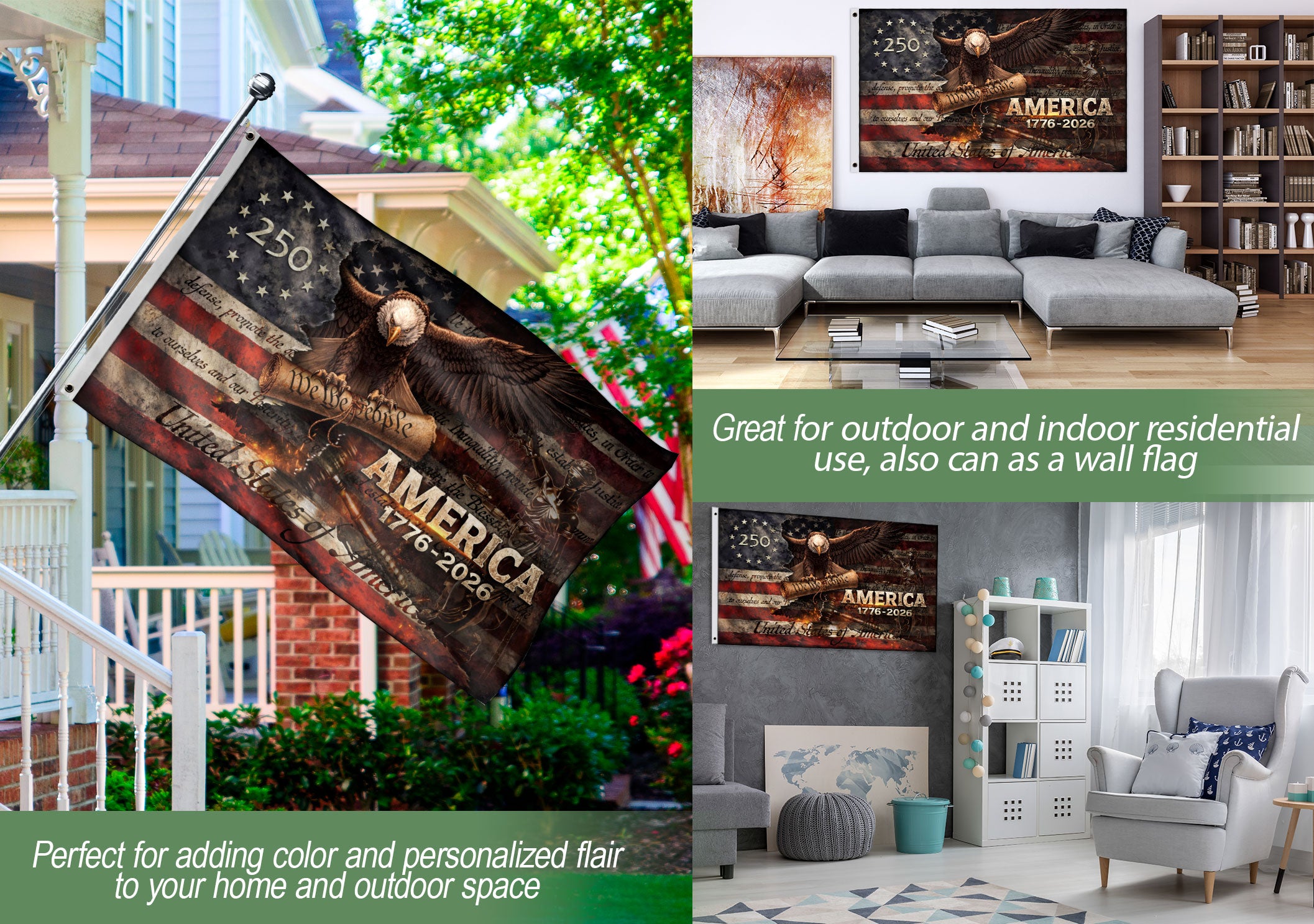 Celebrate 250 years of American independence with this striking house flag. Featuring a bold patriotic eagle, “We The People” scroll, and vintage design commemorating 1776-2026, it’s crafted for durable outdoor display. Made from high-quality polyester fabric that withstands weather elements, this flag adds a powerful statement of national pride, history, and freedom to your porch, yard, or garden. Perfect for Fourth of July, Memorial Day, or everyday display to honor American heritage. Double-sided printing ensures visibility from both sides, with reinforced edges for long-lasting use. Easy to hang with a standard flagpole or bracket—not included.
