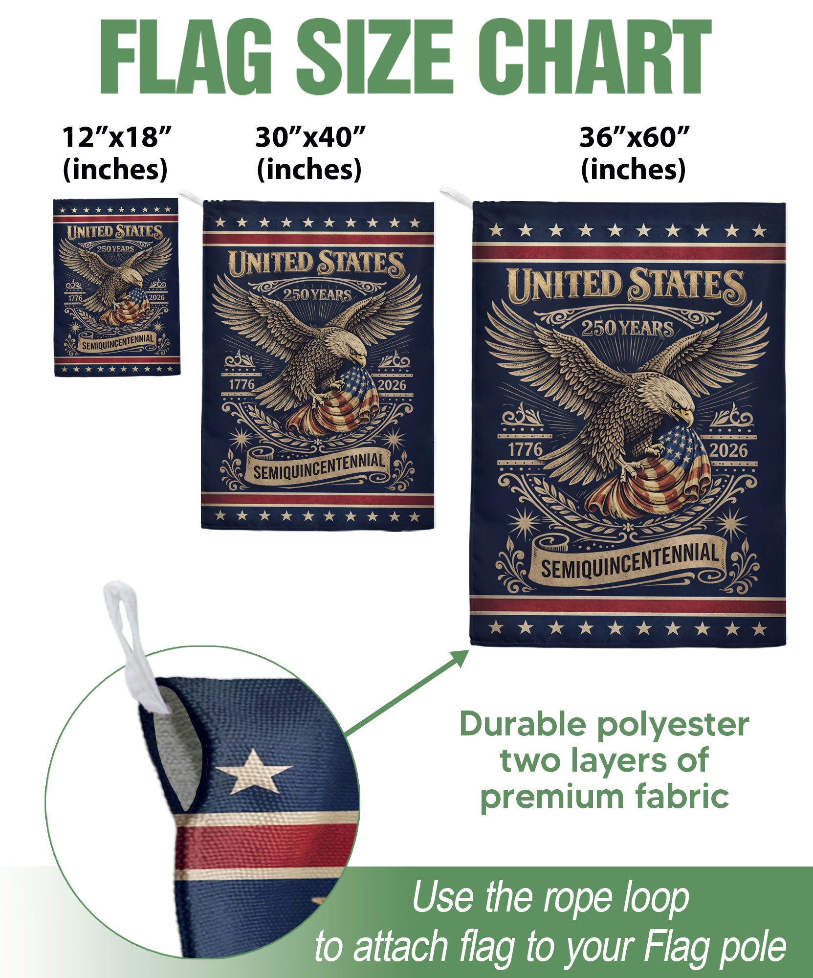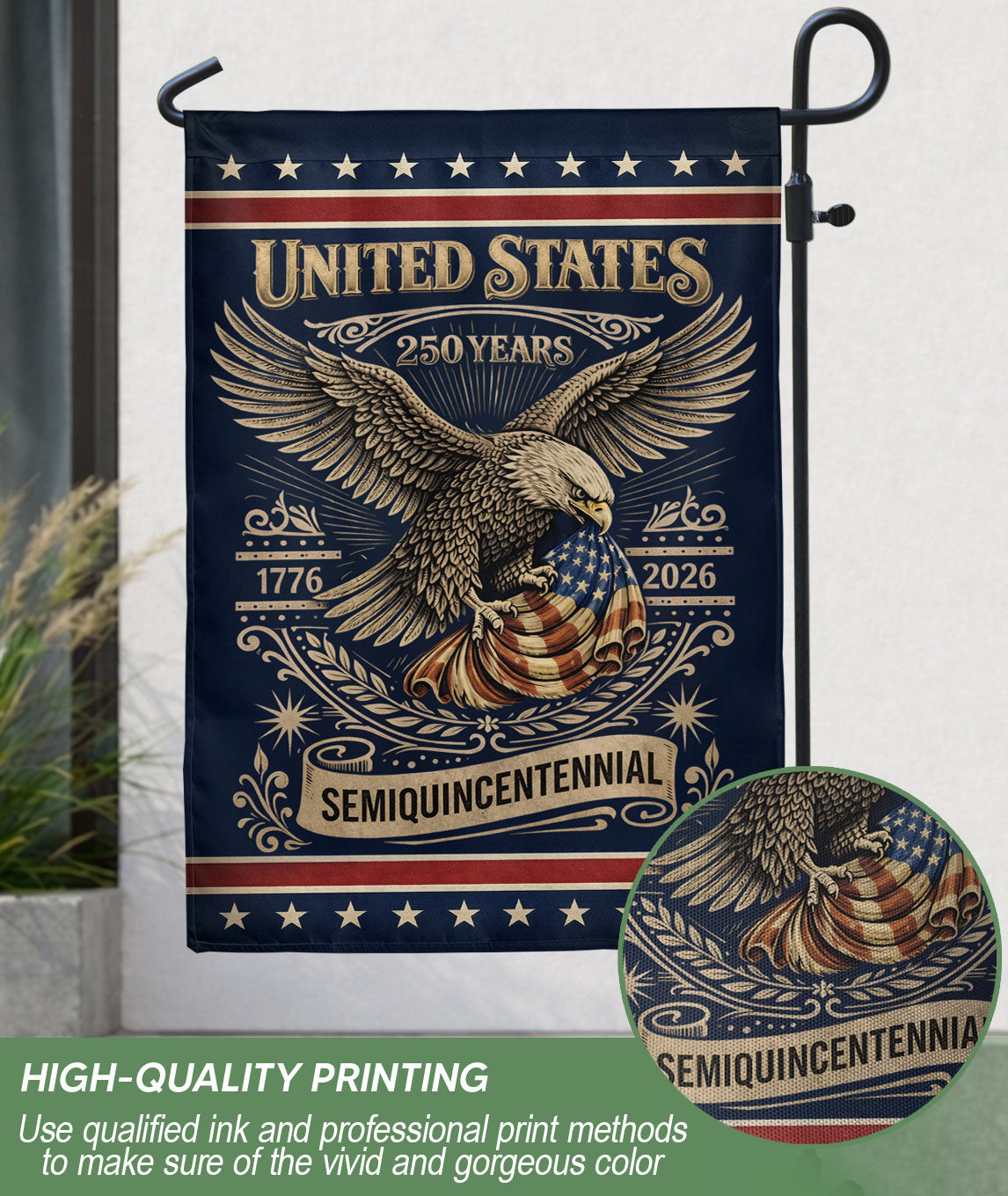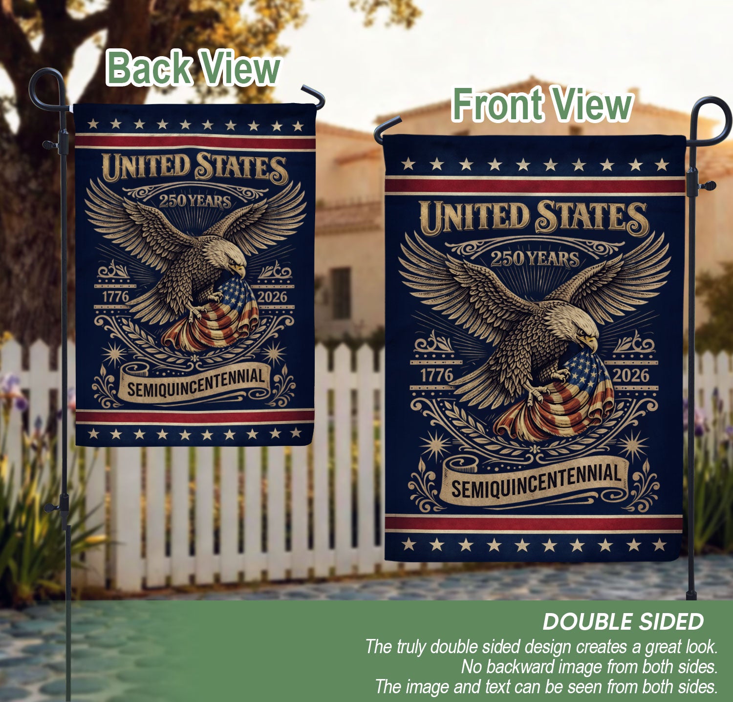 Celebrate America’s 250th Anniversary from 1776 to 2026 with this striking double-sided house flag. Featuring a bold patriotic eagle emblem surrounded by iconic American elements, this durable outdoor yard flag embodies national pride, strength, and unity. Perfect for displaying on your porch, pathway, mailbox, or garden during the Semiquincentennial festivities. Crafted for all-weather use, it ensures vibrant colors and clear visibility from both sides, making it an ideal tribute to 250 years of American freedom and history.