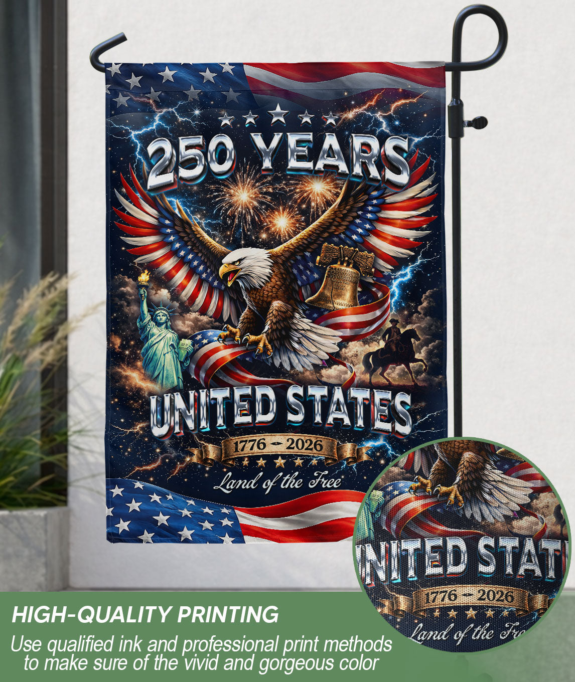Celebrate America’s 250th anniversary from 1776 to 2026 with this patriotic double-sided garden flag. Featuring a majestic bald eagle soaring alongside the iconic Statue of Liberty, this vintage-inspired design captures 250 years of liberty, strength, and hope. Perfect for outdoor decor in gardens, porches, yards, or patios, it adds a timeless tribute to American freedom. Crafted for durability to withstand weather elements, the flag displays vibrant colors and clear imagery on both sides for visibility from any angle. Ideal for Independence Day, Memorial Day, Fourth of July, or everyday display of national pride. Easy to hang with a standard garden flag pole (not included). Honor the enduring symbols of the USA with this classic outdoor decoration.