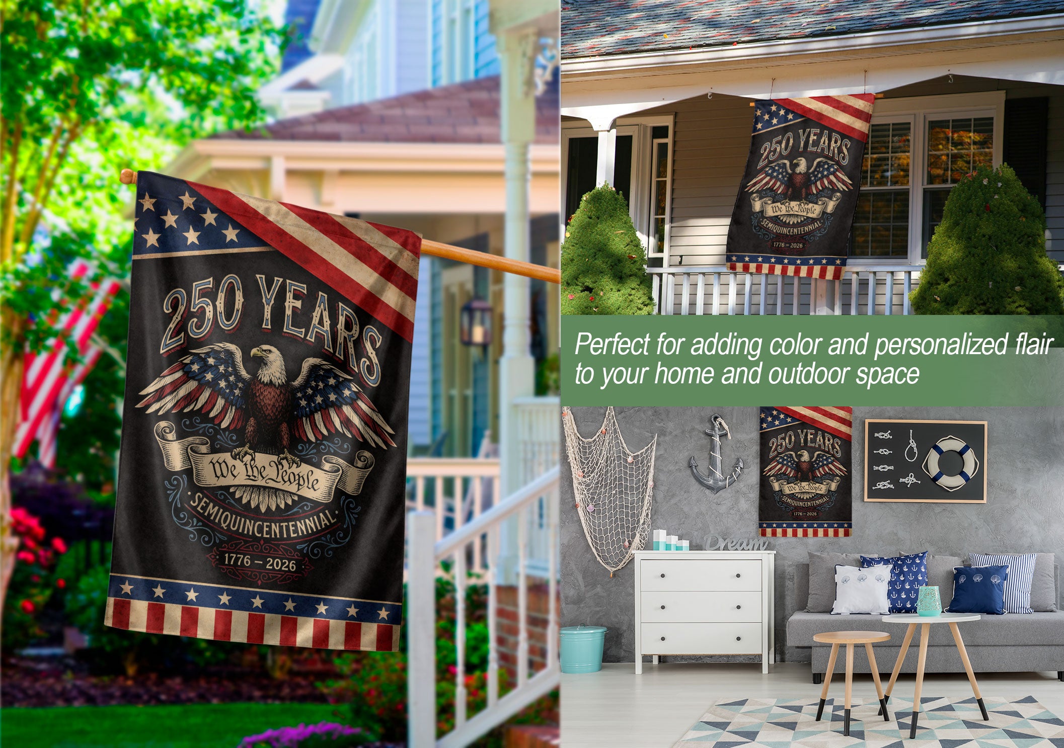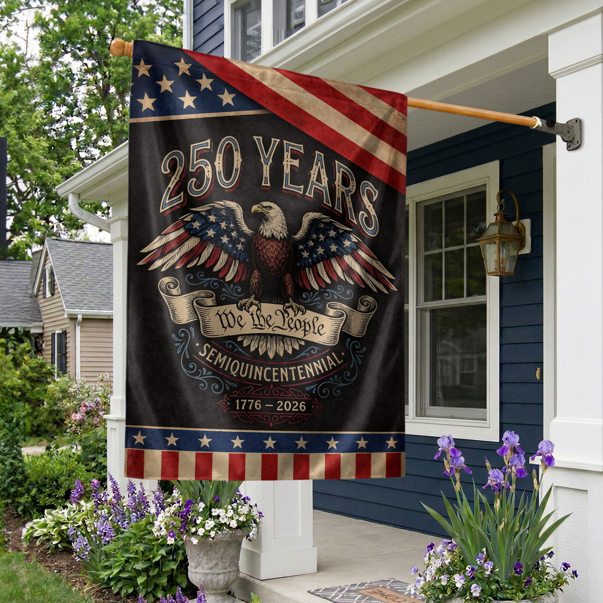 Celebrate America’s 250th anniversary from 1776 to 2026 with this patriotic double-sided garden flag. Featuring the iconic “We The People” text and a majestic bald eagle emblem, this vintage-inspired USA flag symbolizes 250 years of liberty and unity. Perfect for garden, yard, porch, or outdoor displays, it adds classic American pride to any space. Crafted for durability, the double-sided design ensures bold visibility from both sides, making it ideal for holidays, Independence Day, or everyday patriotism. Easy to hang with a standard garden flag pole (not included). Honor the nation’s enduring spirit with this timeless piece of Americana.