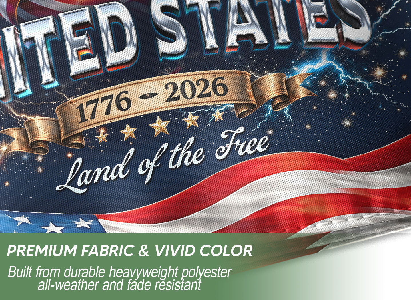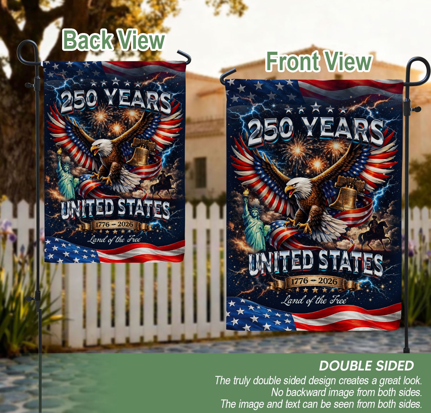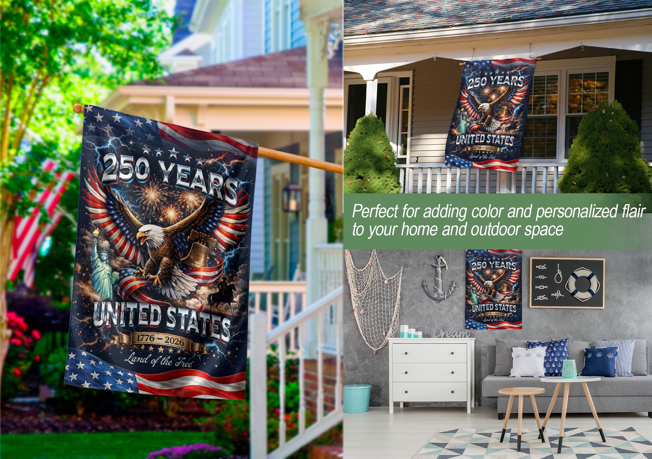 Celebrate America’s 250th anniversary from 1776 to 2026 with this vintage-inspired double-sided house flag. Featuring a majestic bald eagle and the iconic Statue of Liberty, it serves as a timeless tribute to the nation’s enduring symbols of freedom, strength, and hope. Perfect for outdoor decor on porches, patios, or gardens, this durable flag is designed for all-weather use, ensuring vibrant colors and clear details from both sides. Crafted with high-quality polyester fabric, it resists fading and tearing, making it ideal for patriotic displays during holidays, Independence Day, or everyday pride. Easy to hang with a standard flagpole sleeve, this classic piece adds a touch of American heritage to any home exterior.
