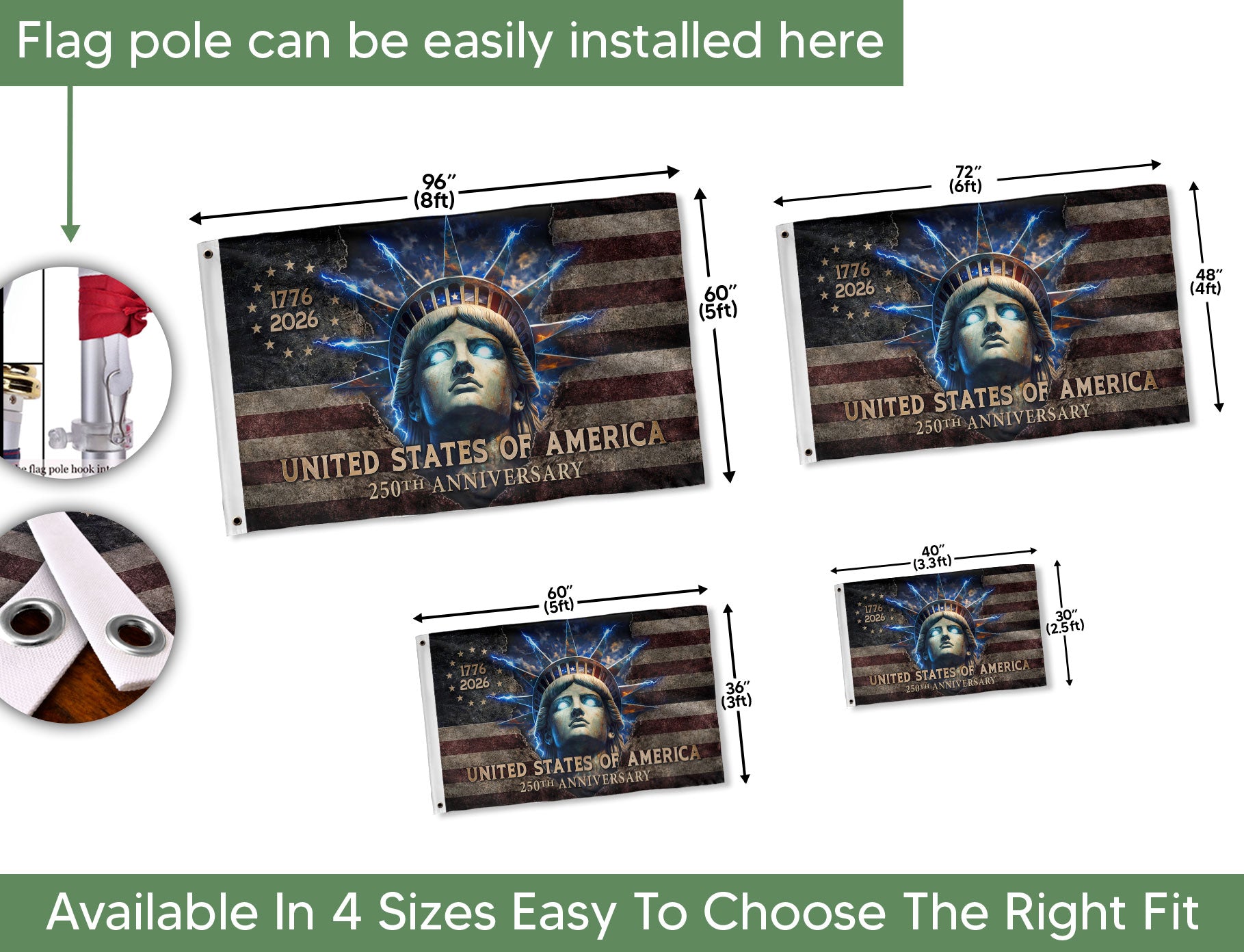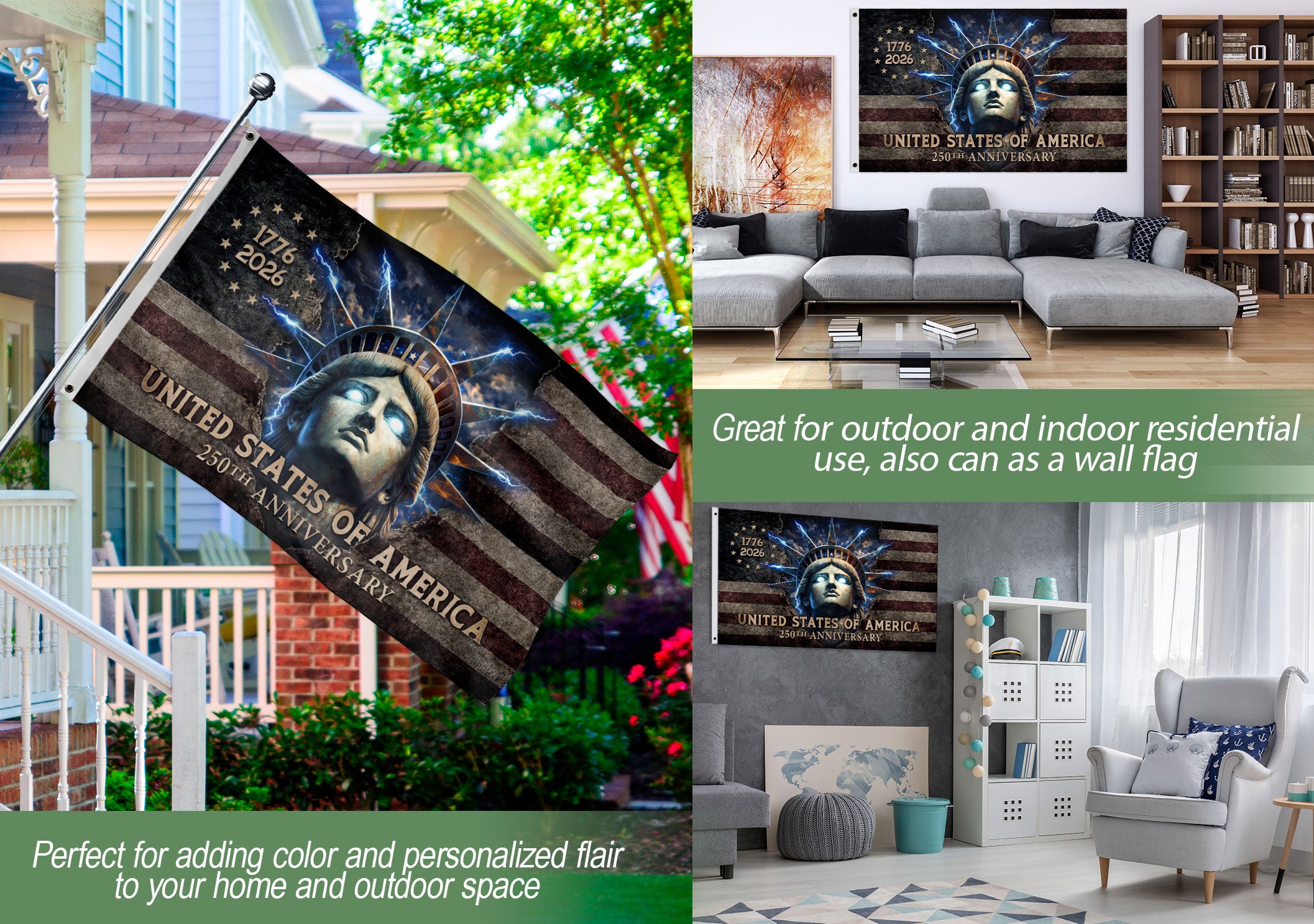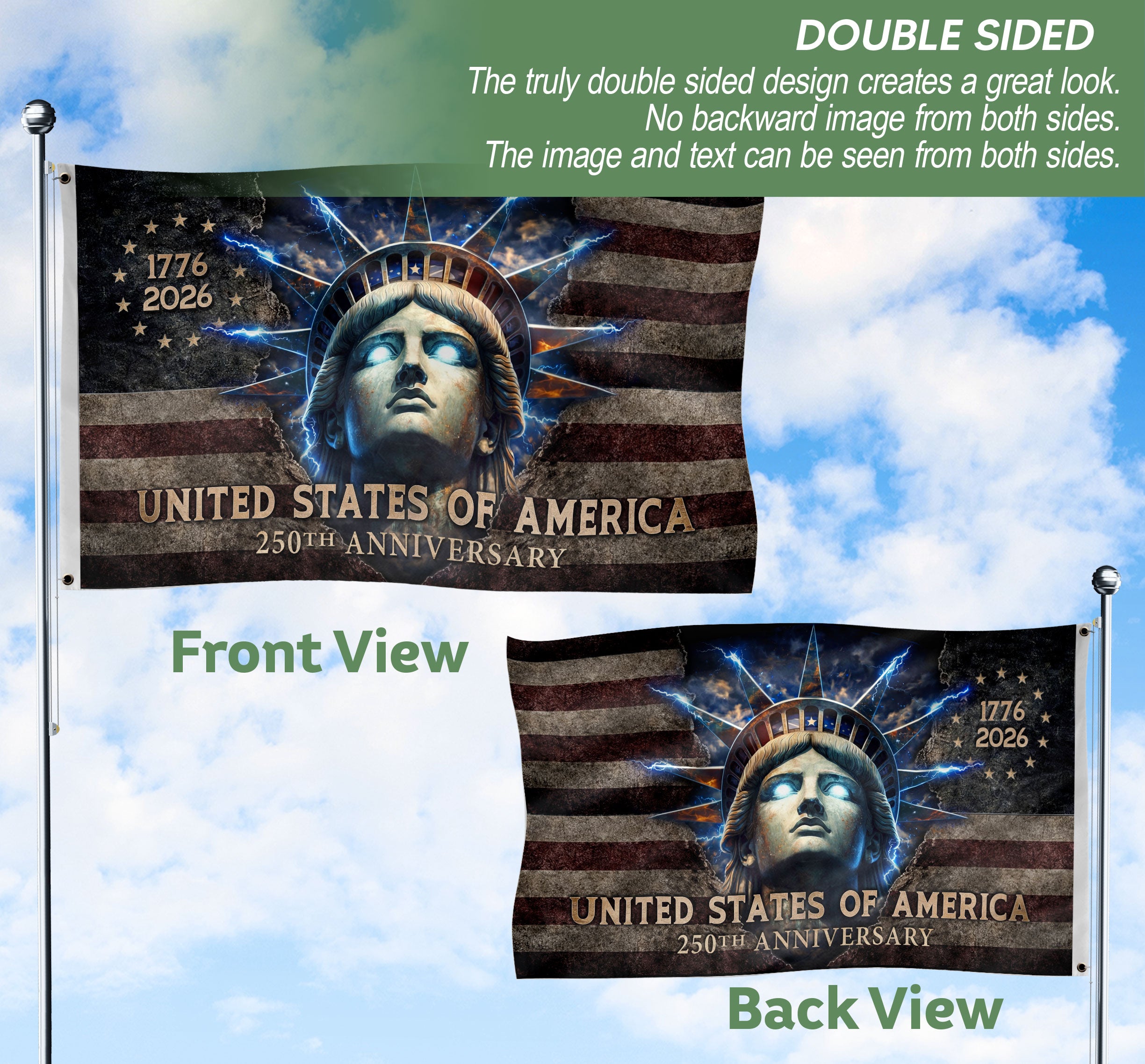 Celebrate America’s 250th anniversary from 1776 to 2026 with this striking double-sided house flag featuring a bold artistic rendering of the Statue of Liberty. The Lady Liberty design includes dramatic glowing eyes that symbolize hope, strength, and patriotic pride, making it a powerful emblem of the nation’s enduring spirit of freedom. Perfect for displaying on your porch, garage, garden, or yard to honor American heritage on Independence Day, Memorial Day, Fourth of July, or every day. Crafted from high-quality, weather-resistant polyester fabric, this outdoor flag maintains vibrant colors and durability against sun, wind, and rain. Double-sided printing ensures the sharp, vivid image is visible from both sides. It features a sturdy sleeve for easy hanging on standard flag poles, with standard house flag dimensions for versatile home decoration. Show your patriotism with this unique 250th anniversary flag that captures the watchful gaze of Lady Liberty.