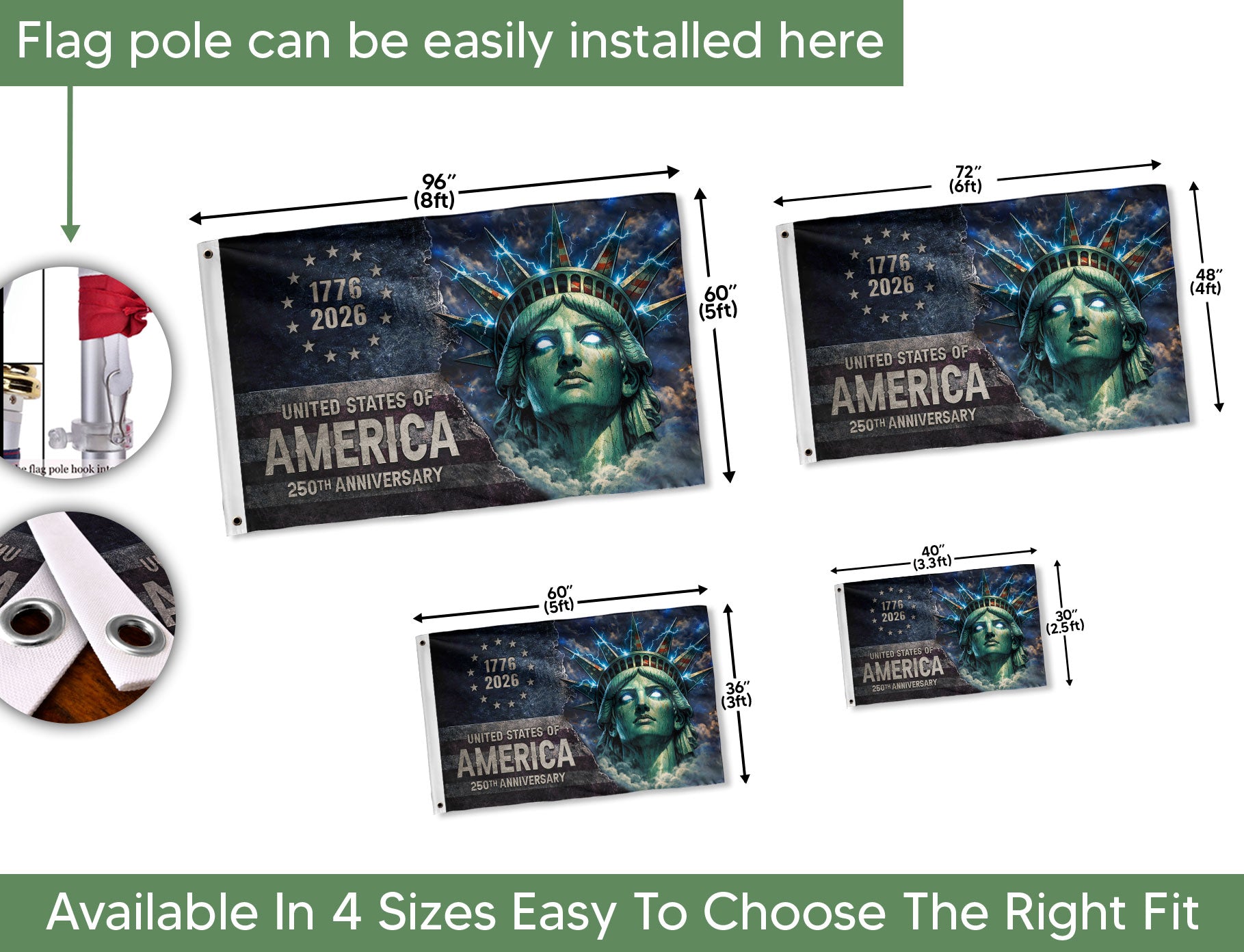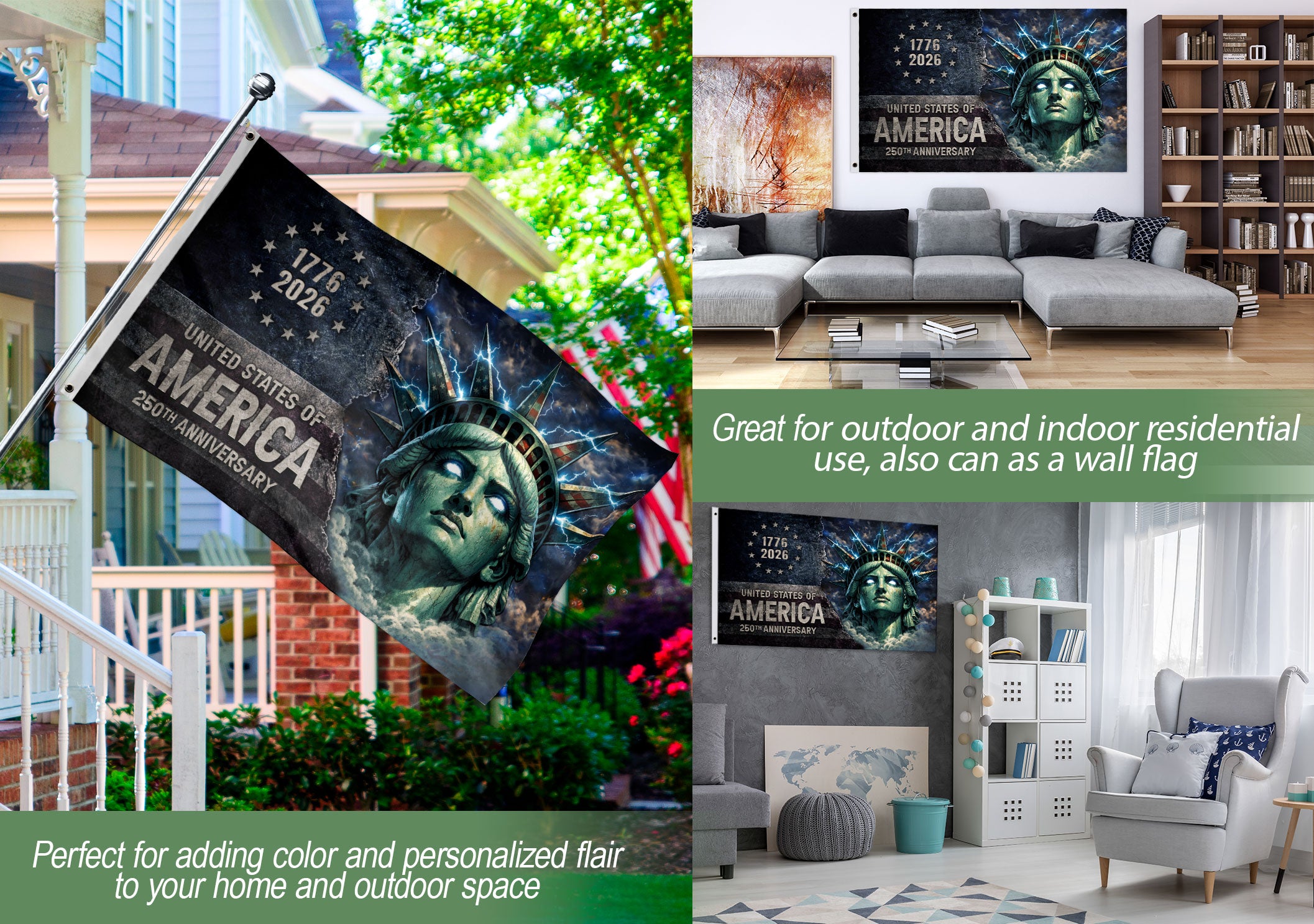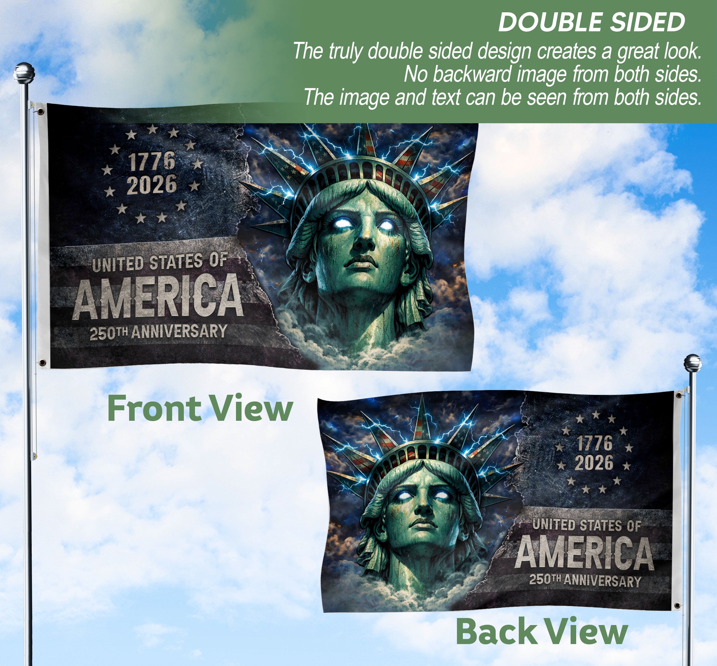 Celebrate America’s 250th anniversary from 1776 to 2026 with this premium double-sided house flag. The design showcases the iconic Statue of Liberty illuminated by bold lightning-inspired streetwear graphics, blending historical significance with modern urban energy. Perfect for displaying national pride on your porch, garage, or garden. Made from durable, weather-resistant polyester fabric, it maintains vibrant colors and sharp details in all outdoor conditions. Double-sided printing ensures the artwork looks crisp from both sides. Ideal for patriots, history enthusiasts, and streetwear fans commemorating this semiquincentennial milestone. Standard house flag size with included sleeve for easy hanging and compatibility with most flag poles and hardware. Show your American spirit with this unique fusion of patriotism and contemporary style.