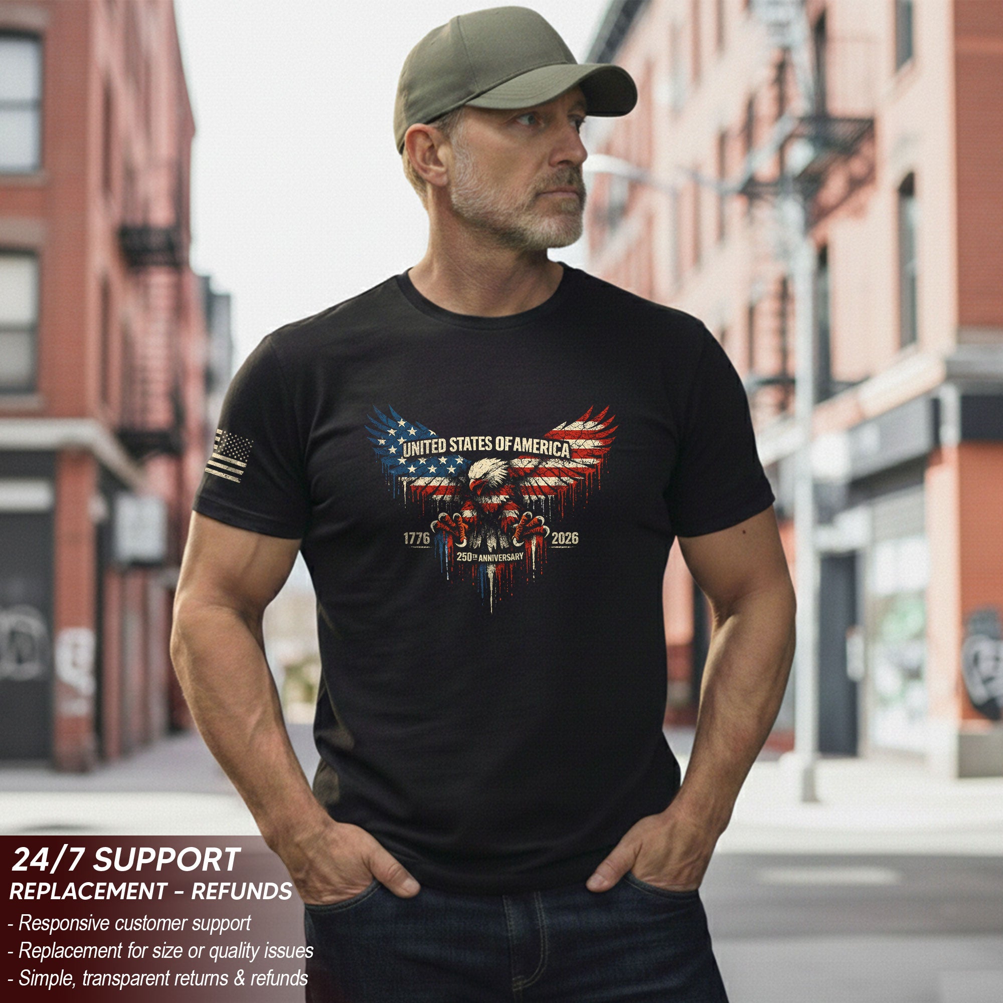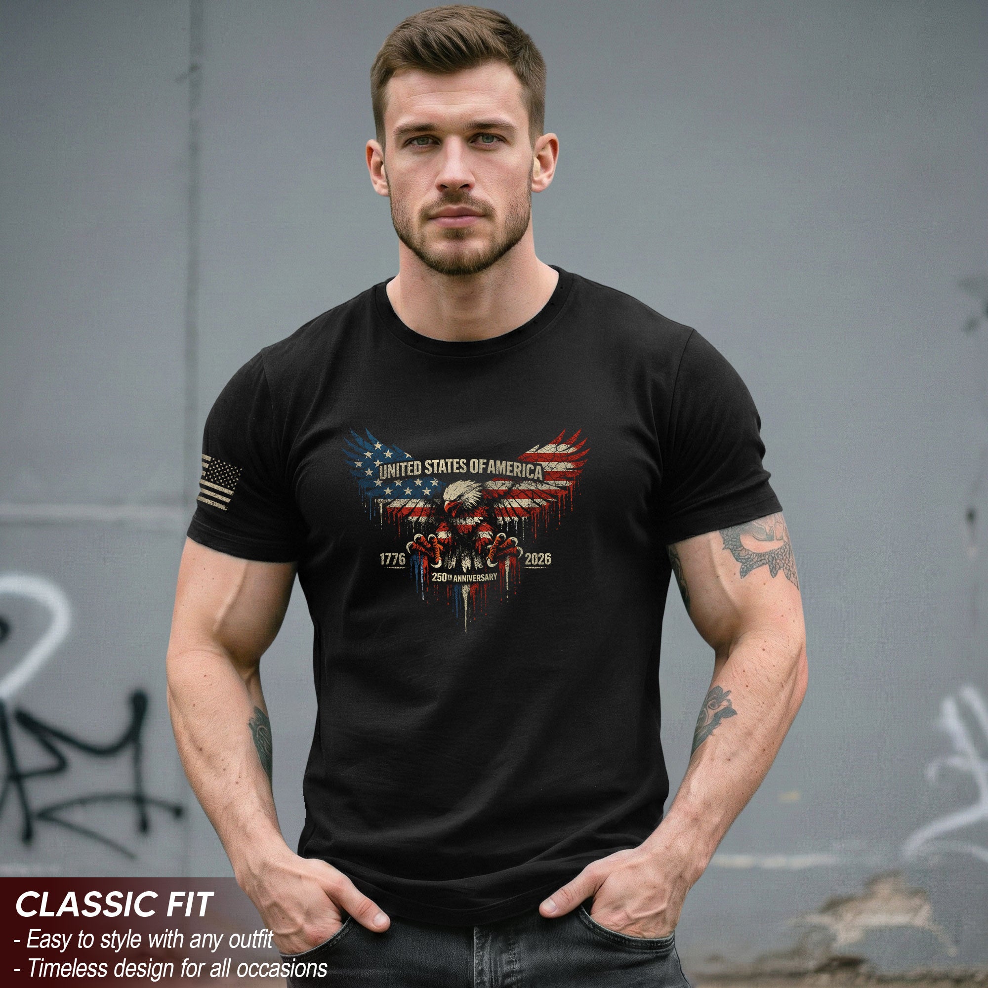 Celebrate America’s 250th anniversary from 1776 to 2026 with this patriotic T-shirt featuring a bold American flag and soaring eagle design. Crafted for comfort and durability, this tee symbolizes strength, unity, freedom, and national pride. Perfect for Independence Day celebrations, veterans, history enthusiasts, or everyday wear to show your American spirit. Made from high-quality, soft cotton blend fabric that holds up wash after wash. Available in multiple sizes for men, women, and unisex fit. Ideal for barbecues, parades, rallies, or casual outings. Honor 250 years of resilience and liberty in style.