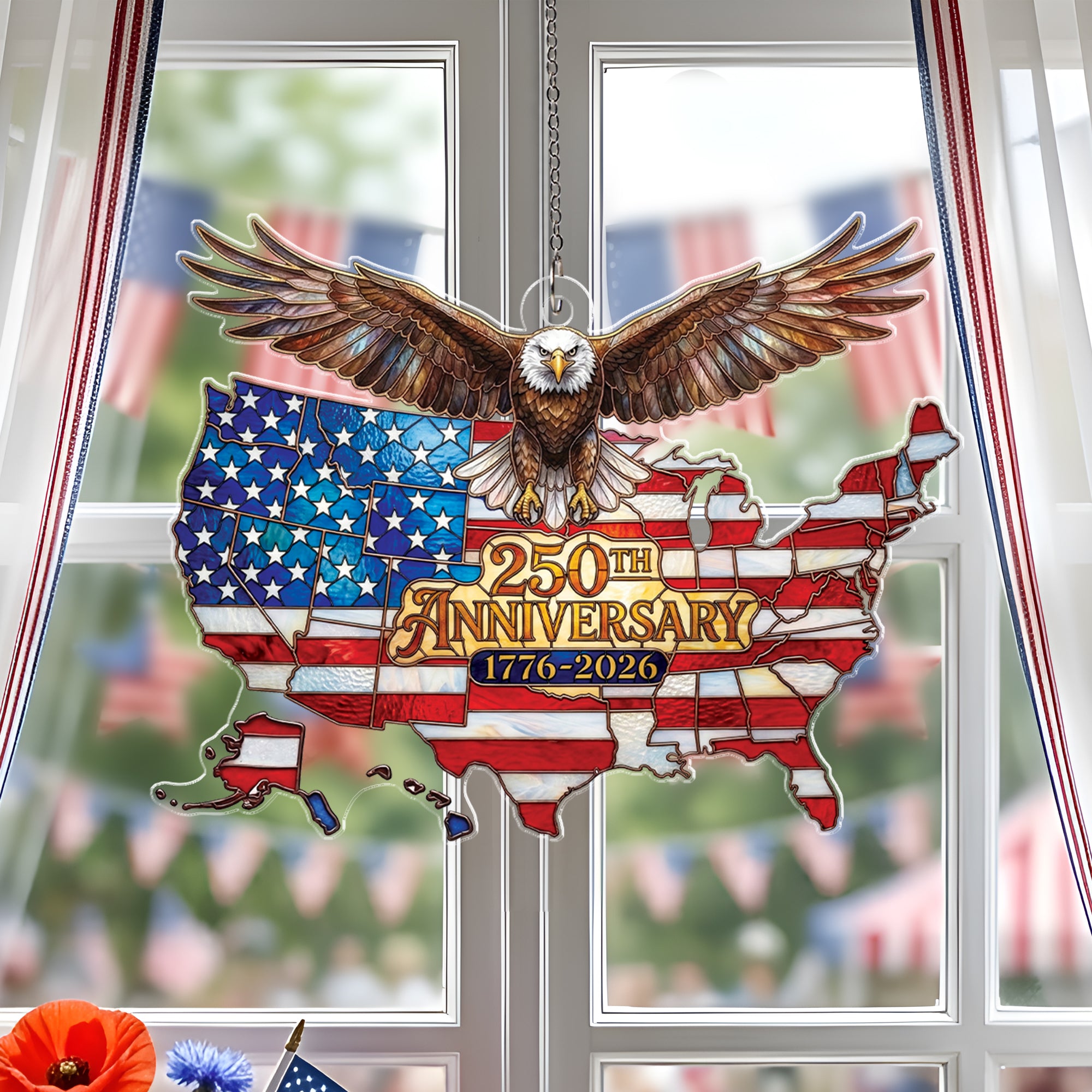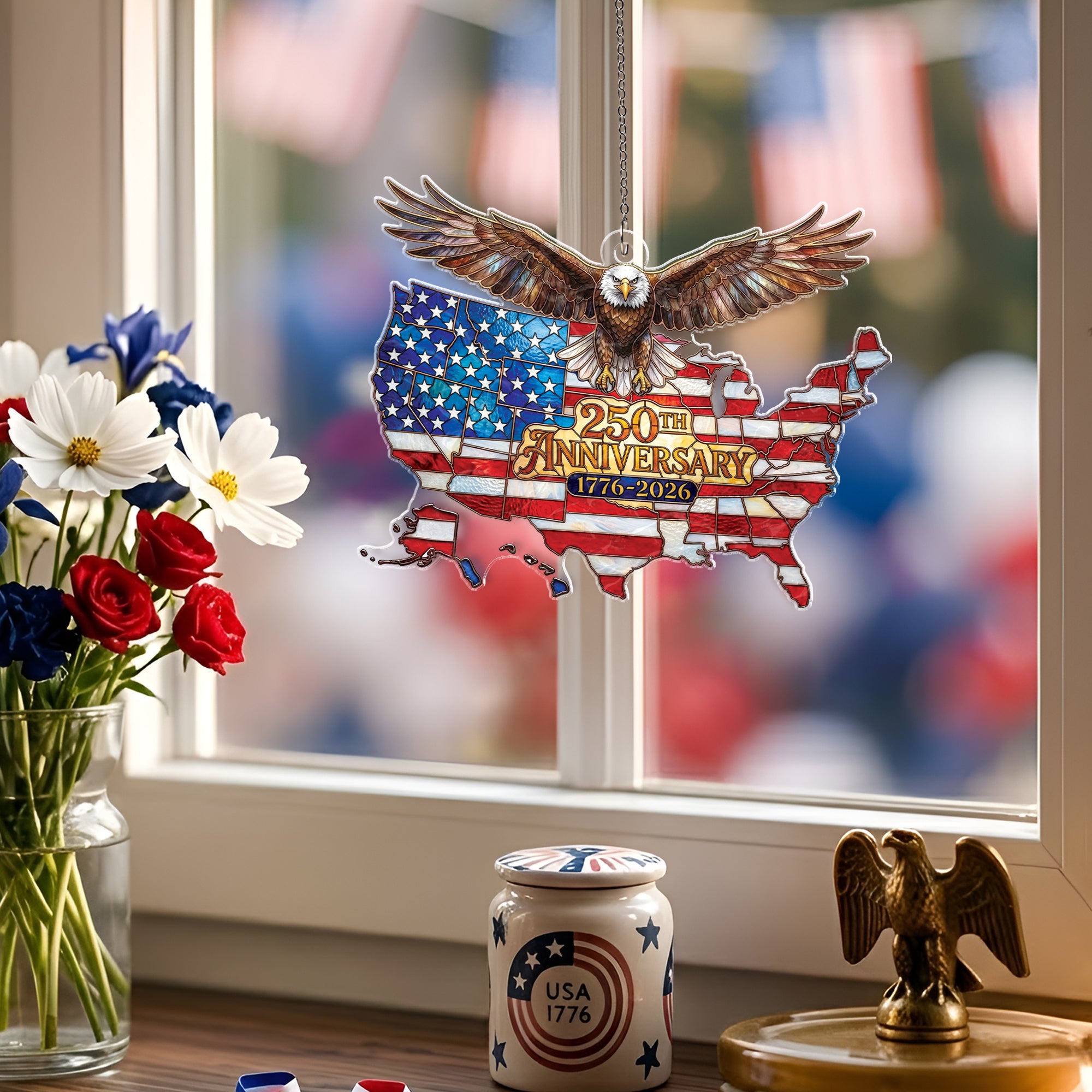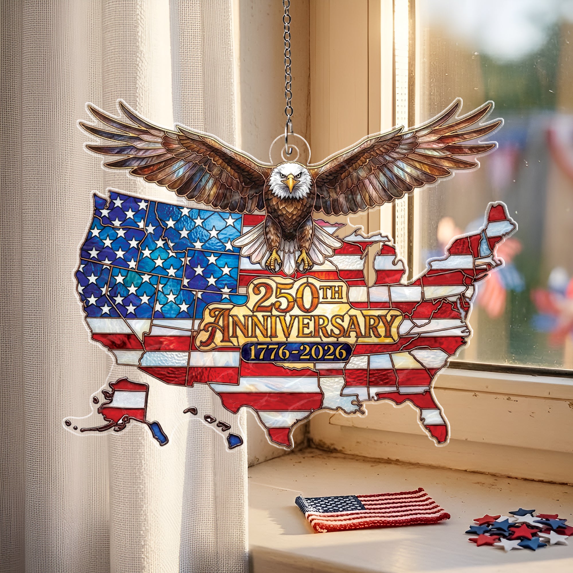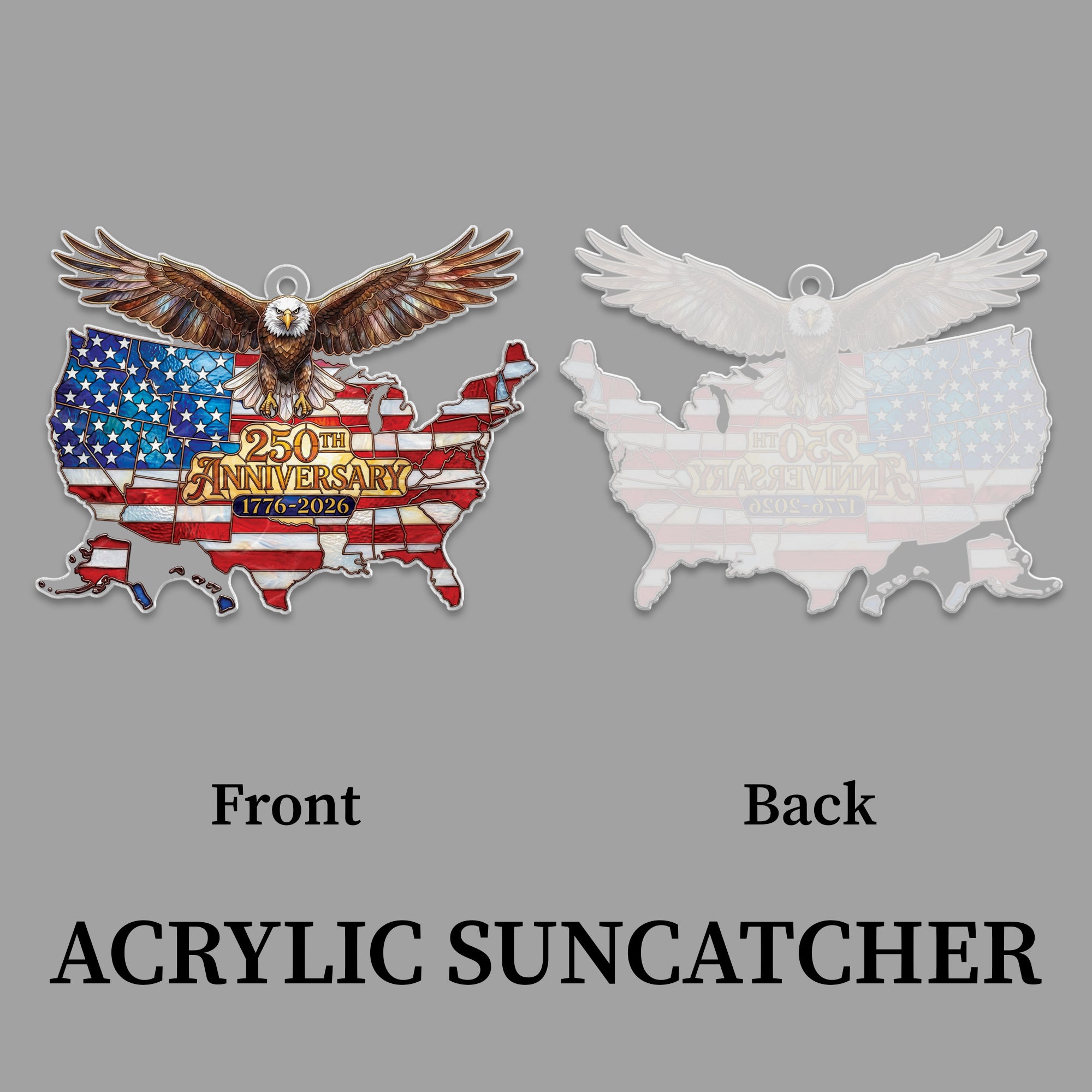 Celebrate America’s 250th anniversary from 1776 to 2026 with this stunning acrylic suncatcher ornament. Featuring a detailed USA map and a majestic soaring bald eagle, it symbolizes national unity, independence, and patriotic pride. Crafted from durable, high-quality acrylic, this suncatcher catches sunlight beautifully, casting colorful rainbows and adding a festive touch to any space. Perfect for hanging in windows, on porches, or as tree ornaments during holidays. Ideal for patriots, history enthusiasts, and collectors commemorating this historic milestone. Lightweight and easy to hang with included loop, it’s a meaningful gift for July 4th, Independence Day, or anniversary celebrations.