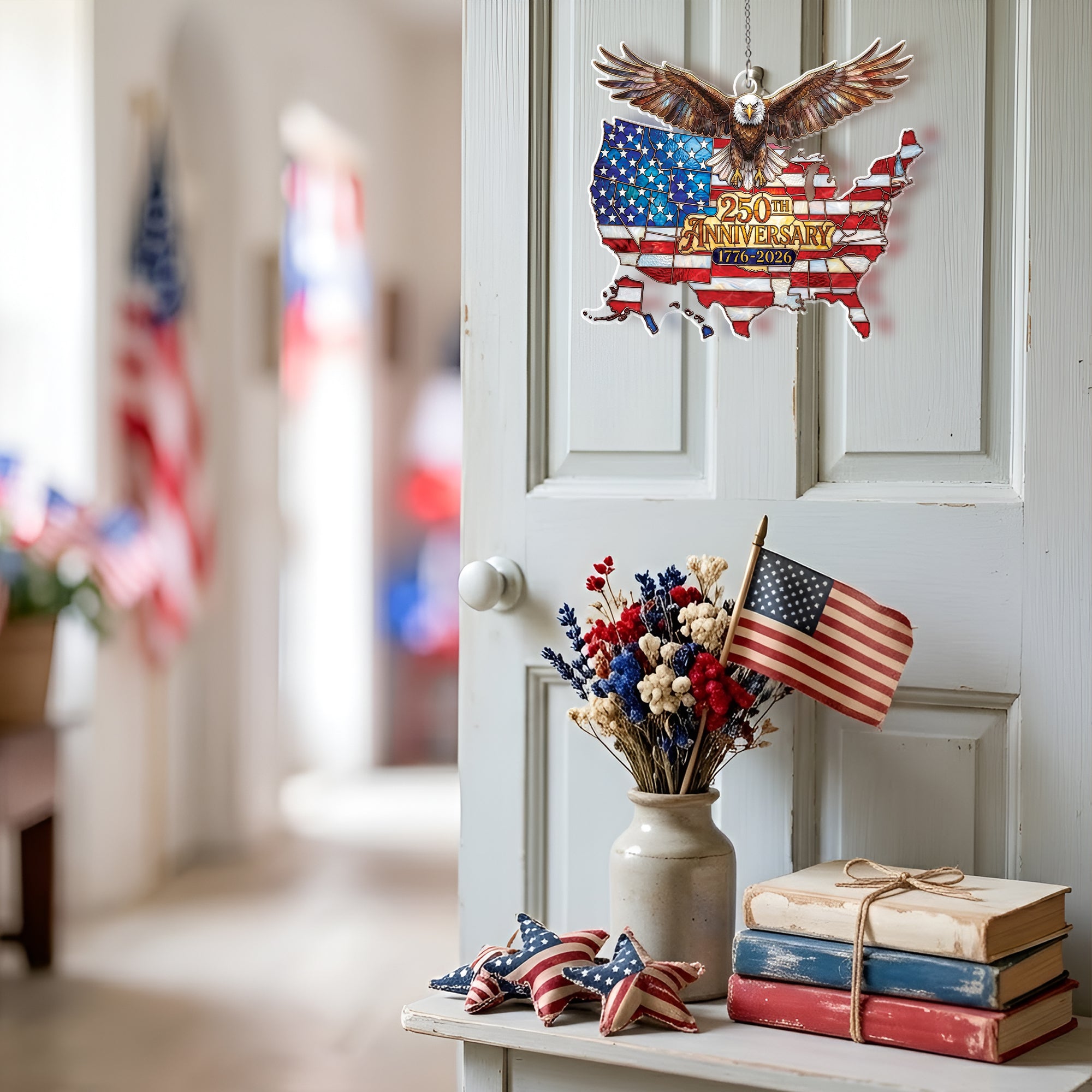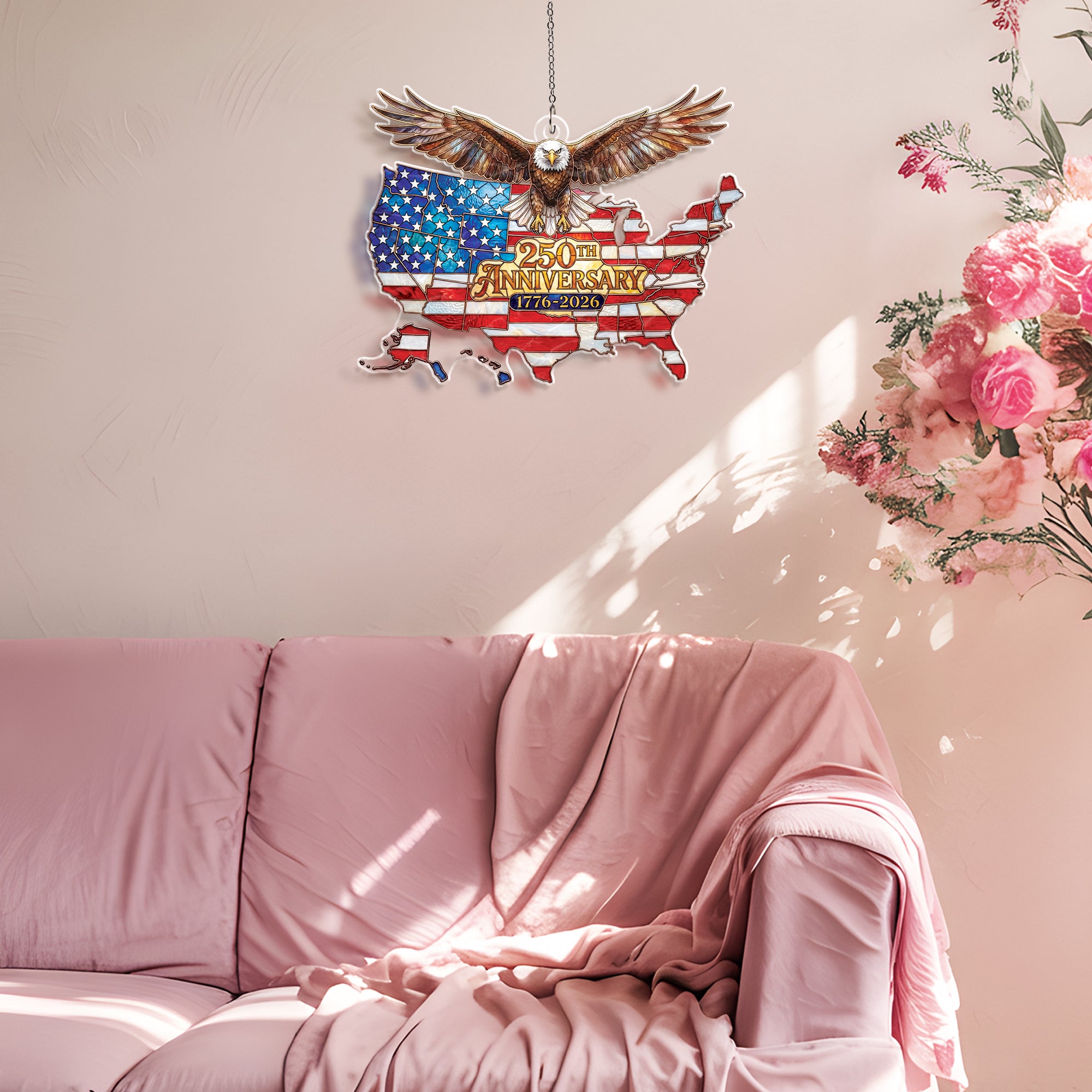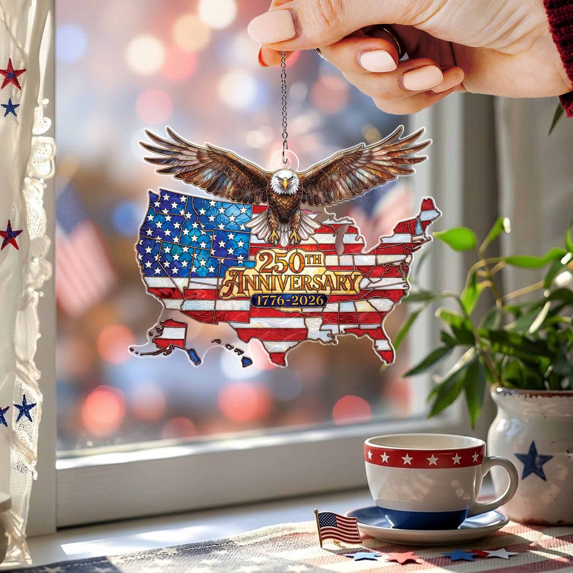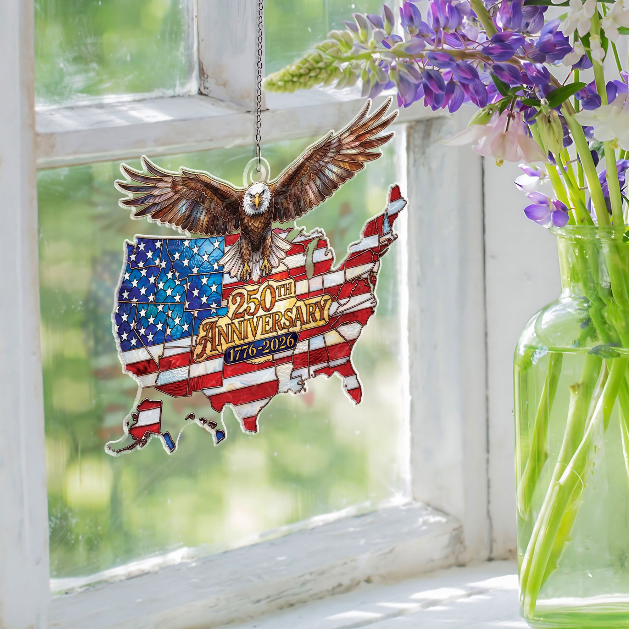 Celebrate America’s 250th anniversary from 1776 to 2026 with this stunning acrylic suncatcher ornament. Featuring a detailed USA map and a majestic soaring bald eagle, it symbolizes national unity, independence, and patriotic pride. Crafted from durable, high-quality acrylic, this suncatcher catches sunlight beautifully, casting colorful rainbows and adding a festive touch to any space. Perfect for hanging in windows, on porches, or as tree ornaments during holidays. Ideal for patriots, history enthusiasts, and collectors commemorating this historic milestone. Lightweight and easy to hang with included loop, it’s a meaningful gift for July 4th, Independence Day, or anniversary celebrations.