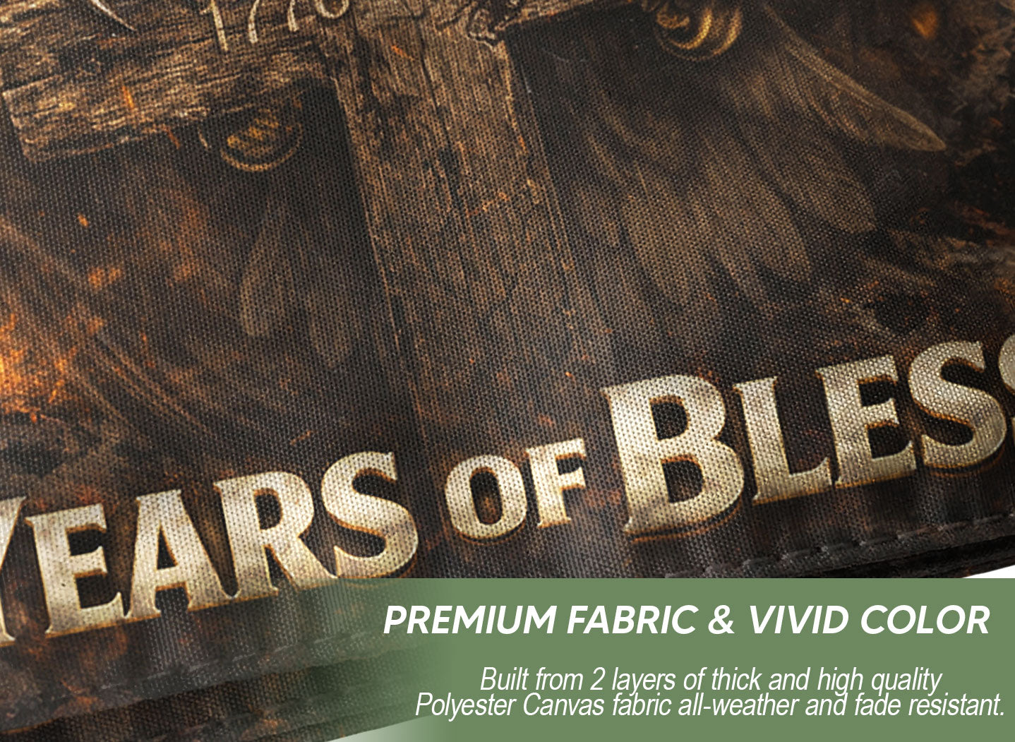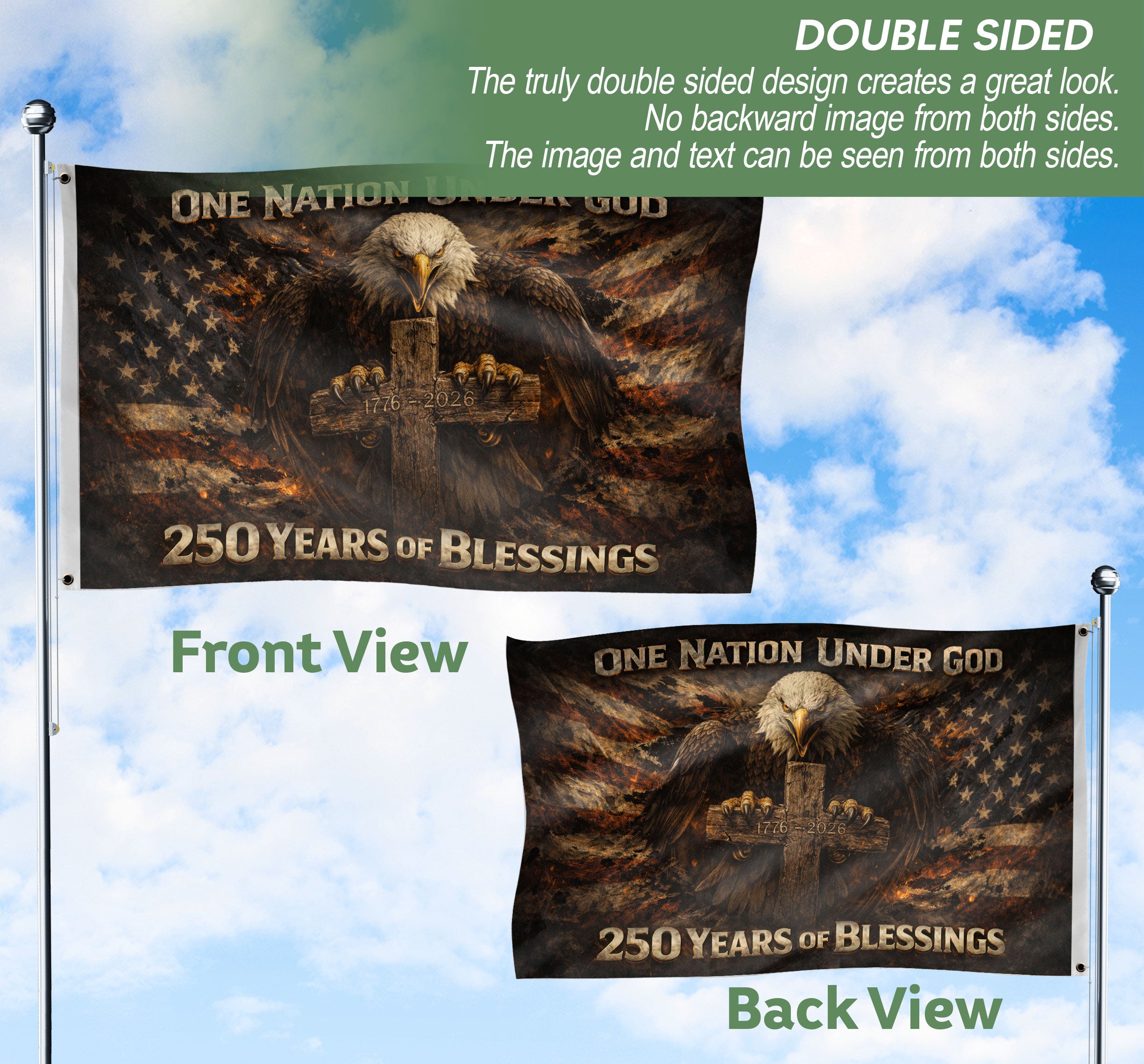 Celebrate 250 years of American independence with this striking double-sided flag banner spanning 1776-2026. Featuring a powerful bald eagle, cross, and ‘One Nation Under God’ motto, it honors the nation’s courageous history, faith-driven strength, and enduring spiritual foundation. Crafted for durability, this religious patriotic banner is ideal for displaying at home, events, parades, or outdoor gatherings to showcase devotion and national pride. Perfect for history enthusiasts, veterans, and patriots marking the semiquincentennial milestone.