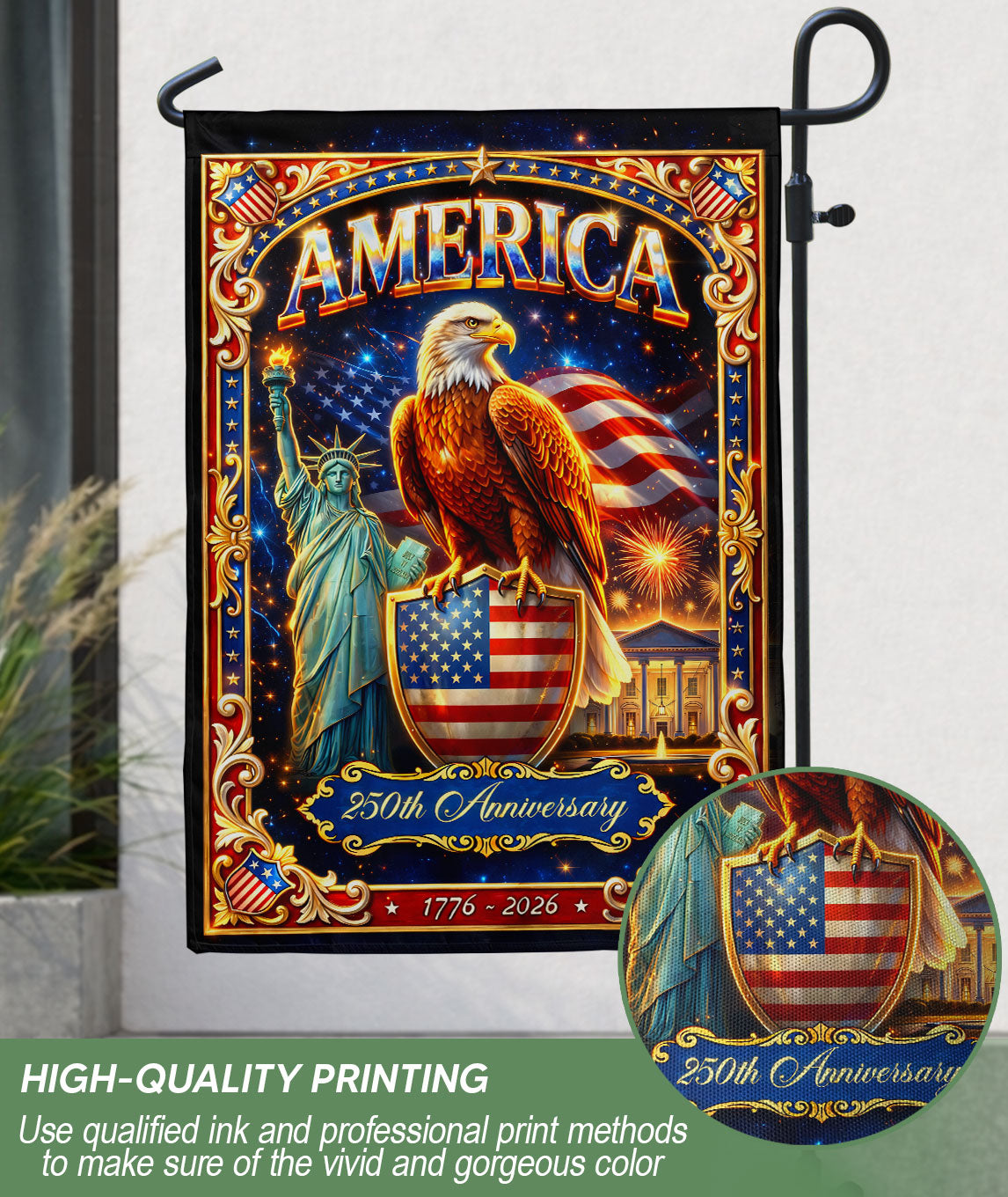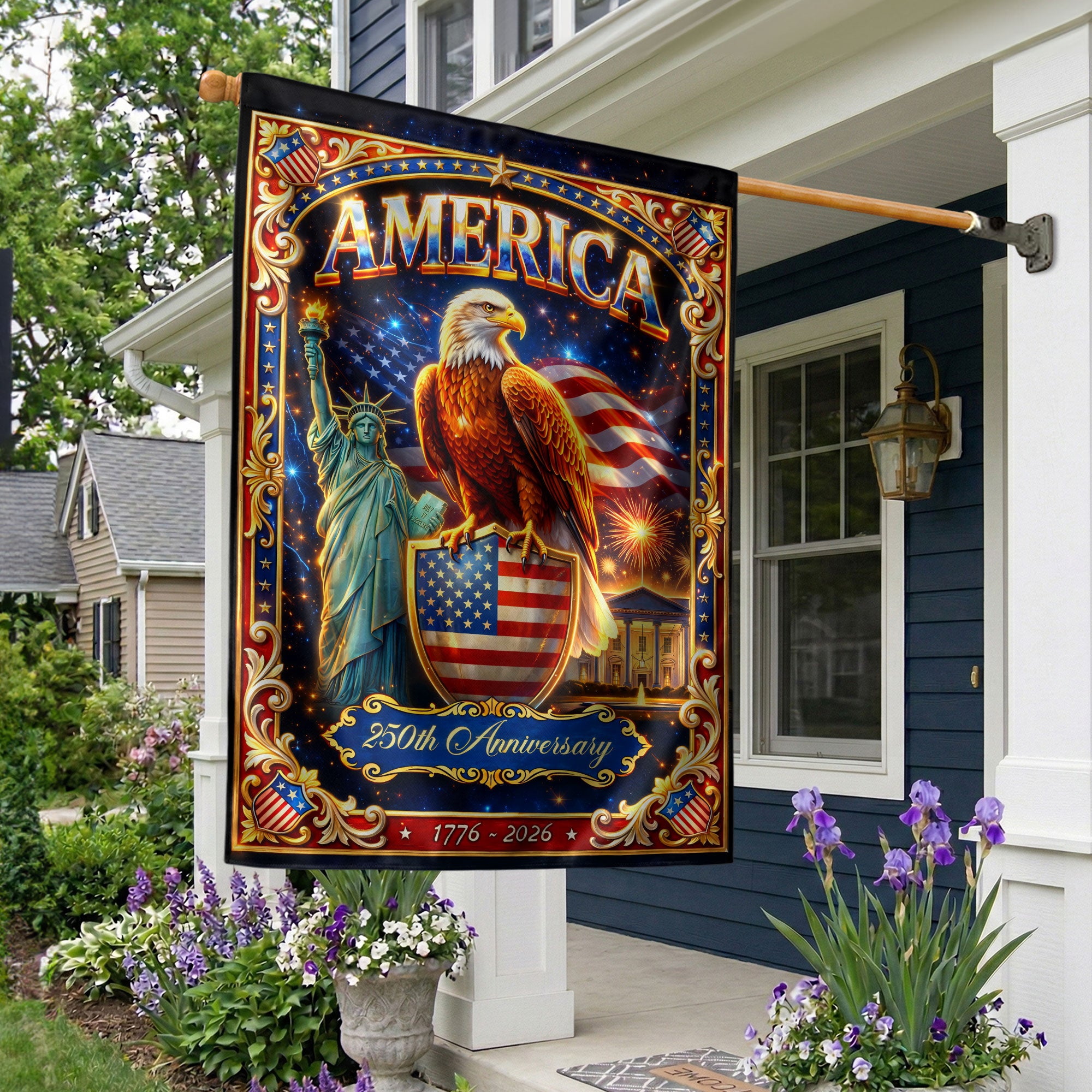 Celebrate the United States’ 250th anniversary with this striking garden flag. Featuring a majestic eagle perched alongside the iconic Statue of Liberty, this patriotic yard banner proudly displays ‘1776-2026’ to honor 250 years of American independence and freedom. Crafted from durable, weather-resistant polyester fabric, the vibrant double-sided print ensures bold colors and clear details that withstand outdoor elements like sun, wind, and rain. Measuring approximately 12.5 x 18 inches, it’s perfect for garden stakes, porches, mailboxes, or patios. This meaningful design symbolizes national heritage, strength, unity, and pride, making it an ideal decoration for Independence Day, Memorial Day, Fourth of July, or everyday display. Easy to hang with a standard garden flag pole (not included), it adds a touch of Americana to any outdoor space.