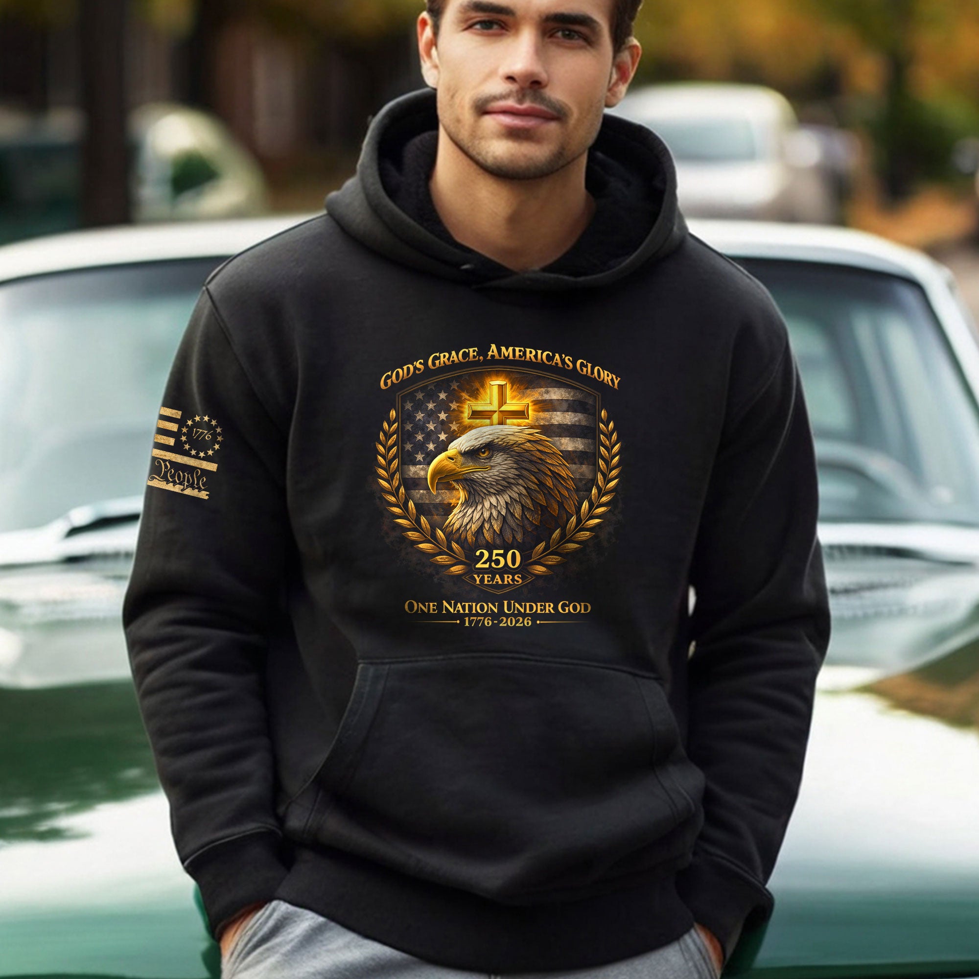 Celebrate America’s 250th anniversary from 1776 to 2026 with this premium unisex hoodie featuring a striking bald eagle and Christian cross design. Crafted from soft, high-quality cotton-polyester blend fleece, it offers superior comfort, warmth, and durability for everyday wear. The bold patriotic graphic symbolizes 250 years of liberty, blessings, and faith, making it an ideal keepsake or gift for patriots, Christians, and history enthusiasts. Perfect for casual outings, family gatherings, or commemorating the Semiquincentennial milestone in 2026. Available in multiple sizes for men, women, and youth. Machine washable for easy care. Embrace American heritage with this meaningful apparel piece.