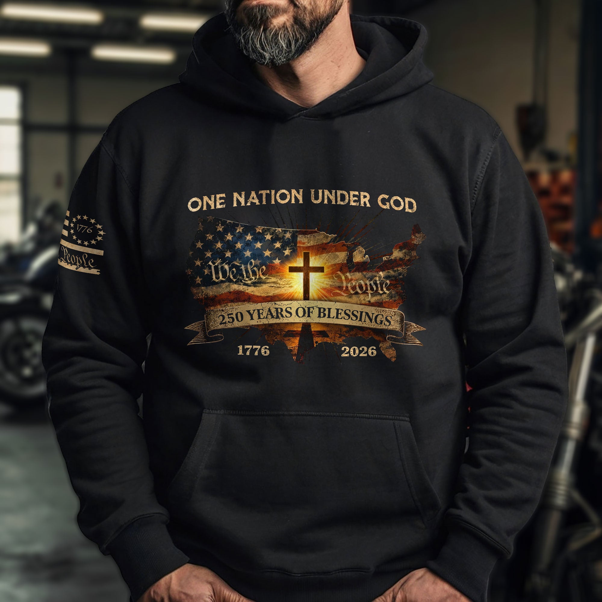 Celebrate America’s 250th anniversary from 1776 to 2026 with this premium hoodie featuring a striking USA map, prominent Christian cross, and American flag design. The bold ‘One Nation Under God’ message honors the nation’s providential liberty and the courage defining our 50 states for two and a half centuries. Crafted from soft, durable fabric, this unisex hoodie offers quarter-zip comfort, a cozy hood, kangaroo pocket, and ribbed cuffs and hem for all-day wear. Perfect for patriots, Christians, and history enthusiasts to wear at rallies, church events, family gatherings, or casual outings. Show your pride in the enduring American spirit with this commemorative quarter-millennium edition piece. Available in multiple sizes for men, women, and youth.