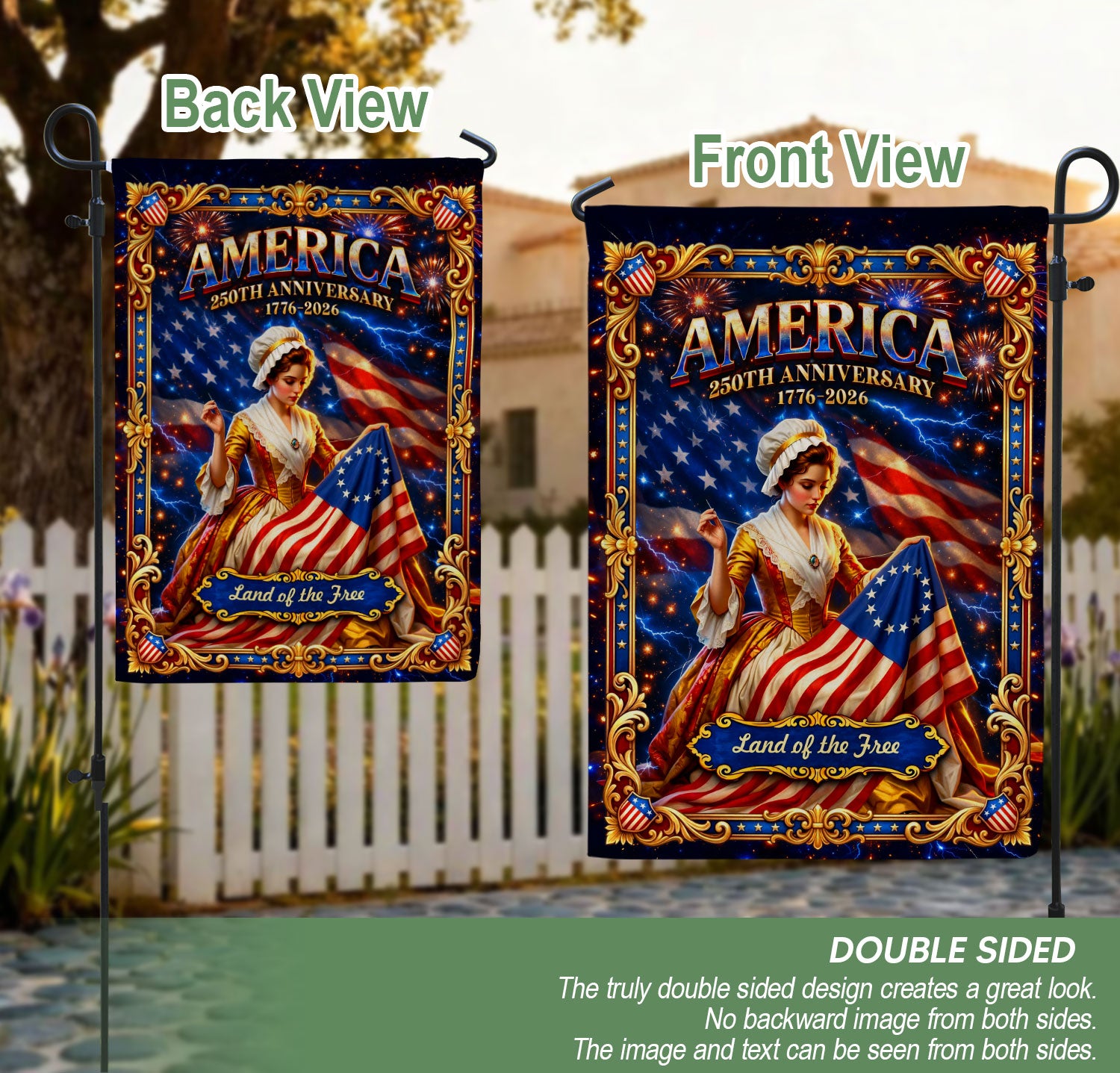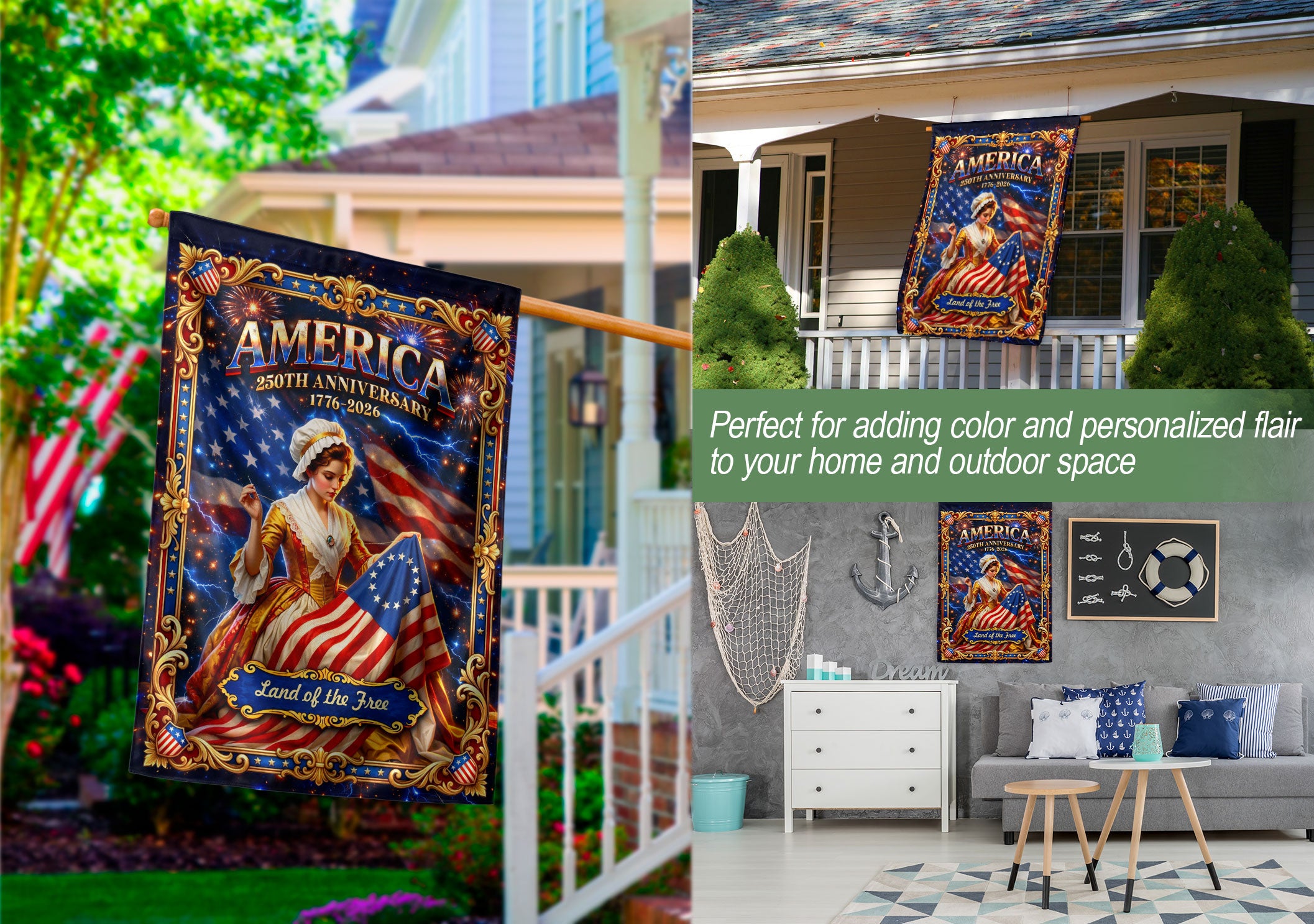 Celebrate 250 years of American independence with this elegant house flag featuring a Betsy Ross-inspired design and vintage patriotic artwork. Crafted with rich, durable colors and historic symbolism, it honors the spirit of freedom from 1776 to 2026. Perfect for porches, gardens, or home exteriors, this double-sided flag displays timeless American pride and heritage. Made from high-quality polyester fabric for weather resistance and long-lasting vibrancy, it’s an ideal decoration for patriotic holidays, Fourth of July, or everyday display of national pride.