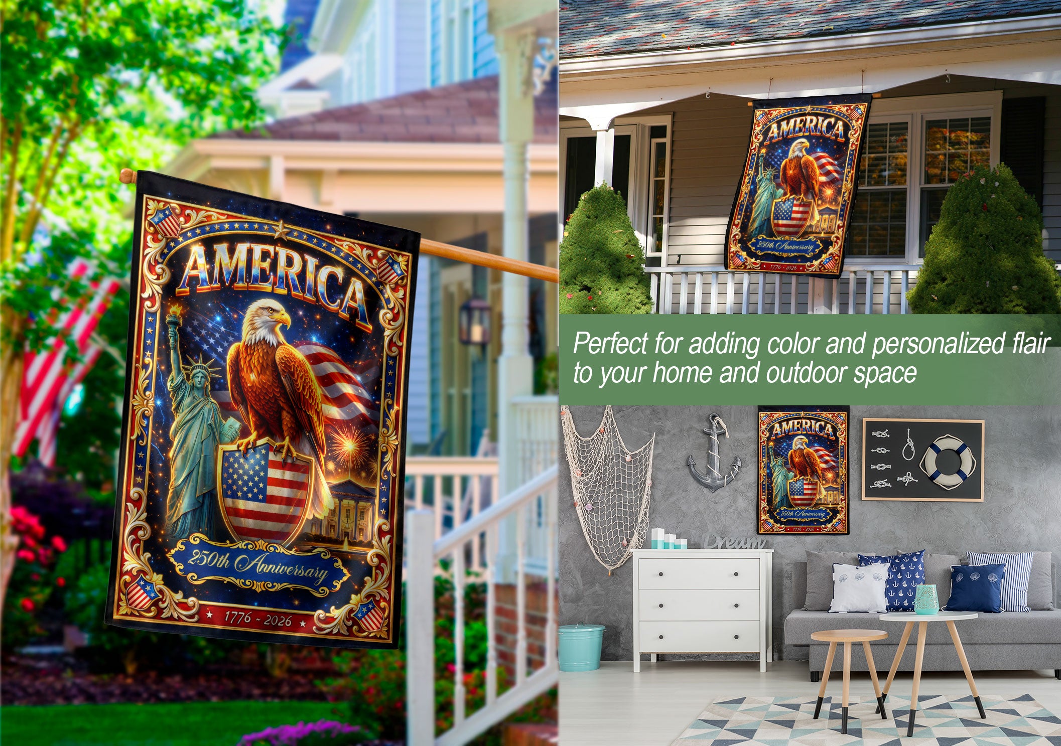Celebrate the United States’ 250th anniversary from 1776 to 2026 with this striking house flag. Featuring a majestic eagle perched atop the iconic Statue of Liberty and a bold patriotic shield, this vibrant banner embodies American pride, strength, unity, and independence. Crafted for durability and weather resistance, it’s ideal for displaying on your porch, garage, or garden during holidays like the 4th of July, Memorial Day, or year-round to showcase your patriotic spirit. The high-quality polyester material ensures vivid colors that won’t fade easily, making it a meaningful addition to your home decor. Perfect for history enthusiasts, veterans, and anyone honoring America’s legacy of freedom.