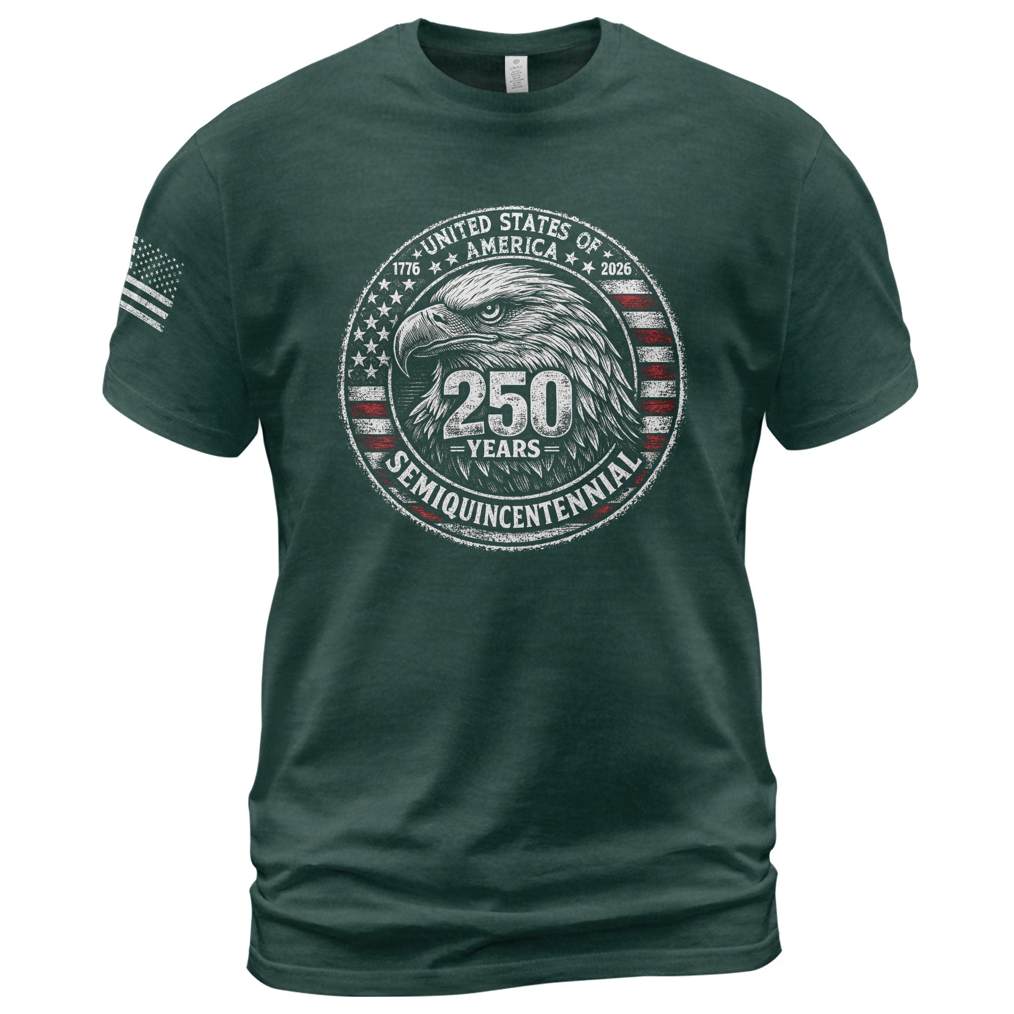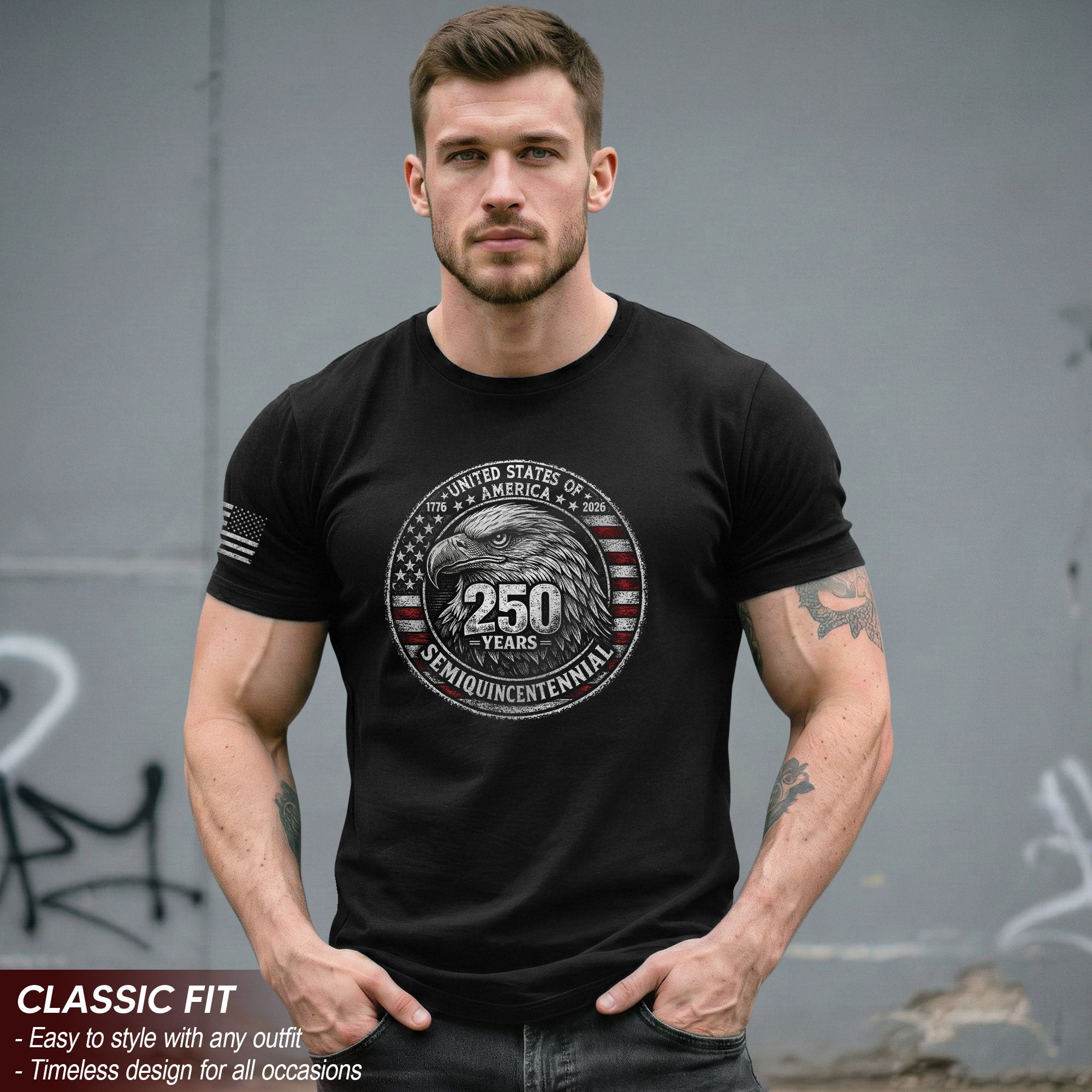 Celebrate America’s 250th anniversary from 1776 to 2026 with this premium T-shirt featuring a bold circular design. The detailed bald eagle emblem set against the iconic American flag pays tribute to 250 years of independence, unity, and progress. Crafted from high-quality, soft cotton for all-day comfort, this unisex tee is perfect for patriots, history enthusiasts, and Fourth of July events. Ideal for wearing during the historic 2026 milestone celebrations, barbecues, parades, or everyday patriotic pride. Durable print ensures the design stays vibrant wash after wash. Available in multiple sizes for men, women, and youth.