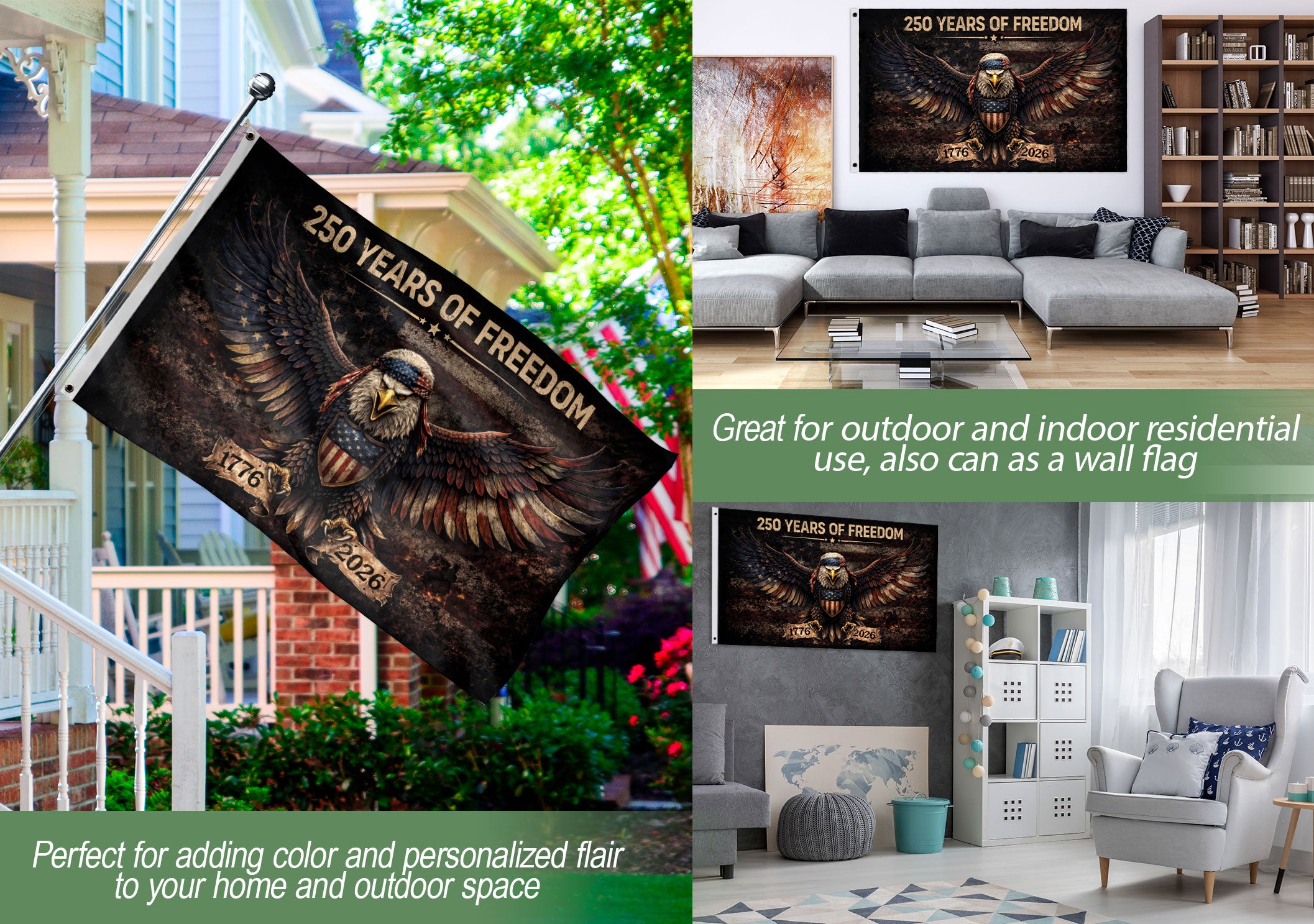 Celebrate America’s 250th anniversary from 1776 to 2026 with this memorial-style patriotic flag featuring a bold eagle emblem. Crafted from durable, fade-resistant polyester fabric, it includes reinforced stitching and brass grommets for secure hanging on poles or walls. Measuring 3×5 feet, this standard-size flag withstands outdoor weather, maintaining vibrant colors year-round. Ideal for Independence Day, Memorial Day, Veterans Day celebrations, backyard barbecues, parades, porches, homes, offices, or community events. Display it to honor national pride, freedom, and the enduring spirit of the nation.