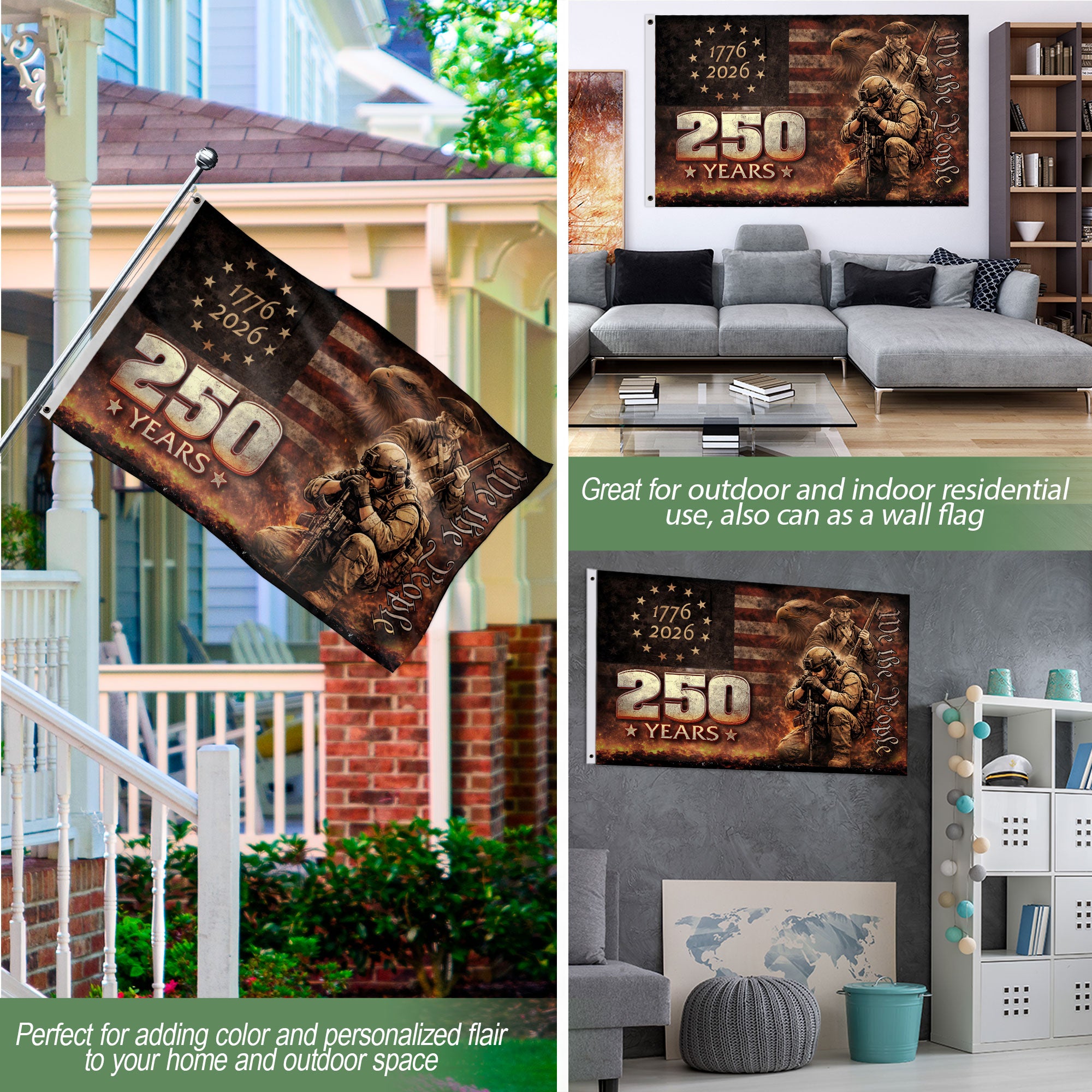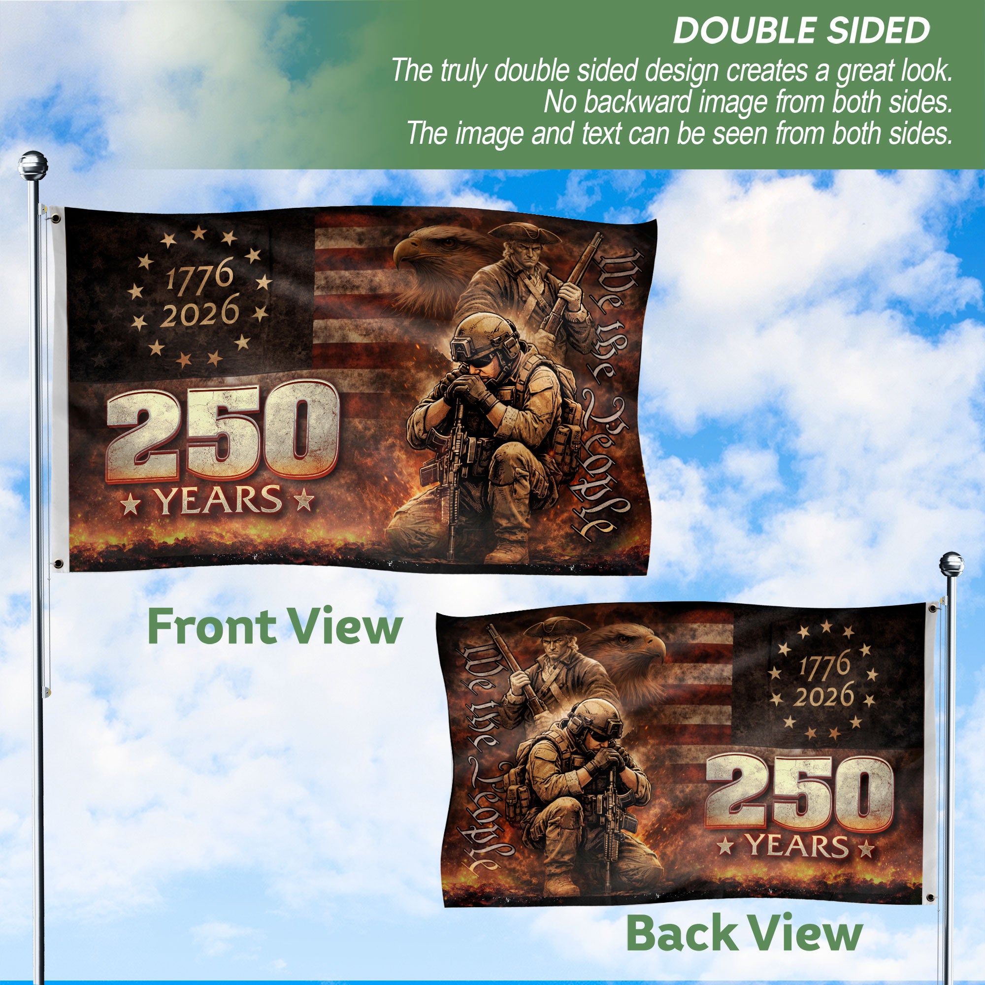The American Eagle 250th Flag 1776-2026 commemorates the United States’ 250th anniversary, blending patriotic heritage with iconic symbolism. Featuring the bold bald eagle emblem, this flag represents freedom, strength, and national unity from 1776 to 2026. Crafted from high-quality, weather-resistant polyester fabric, it withstands outdoor elements while preserving vibrant colors and sharp details for long-lasting display.