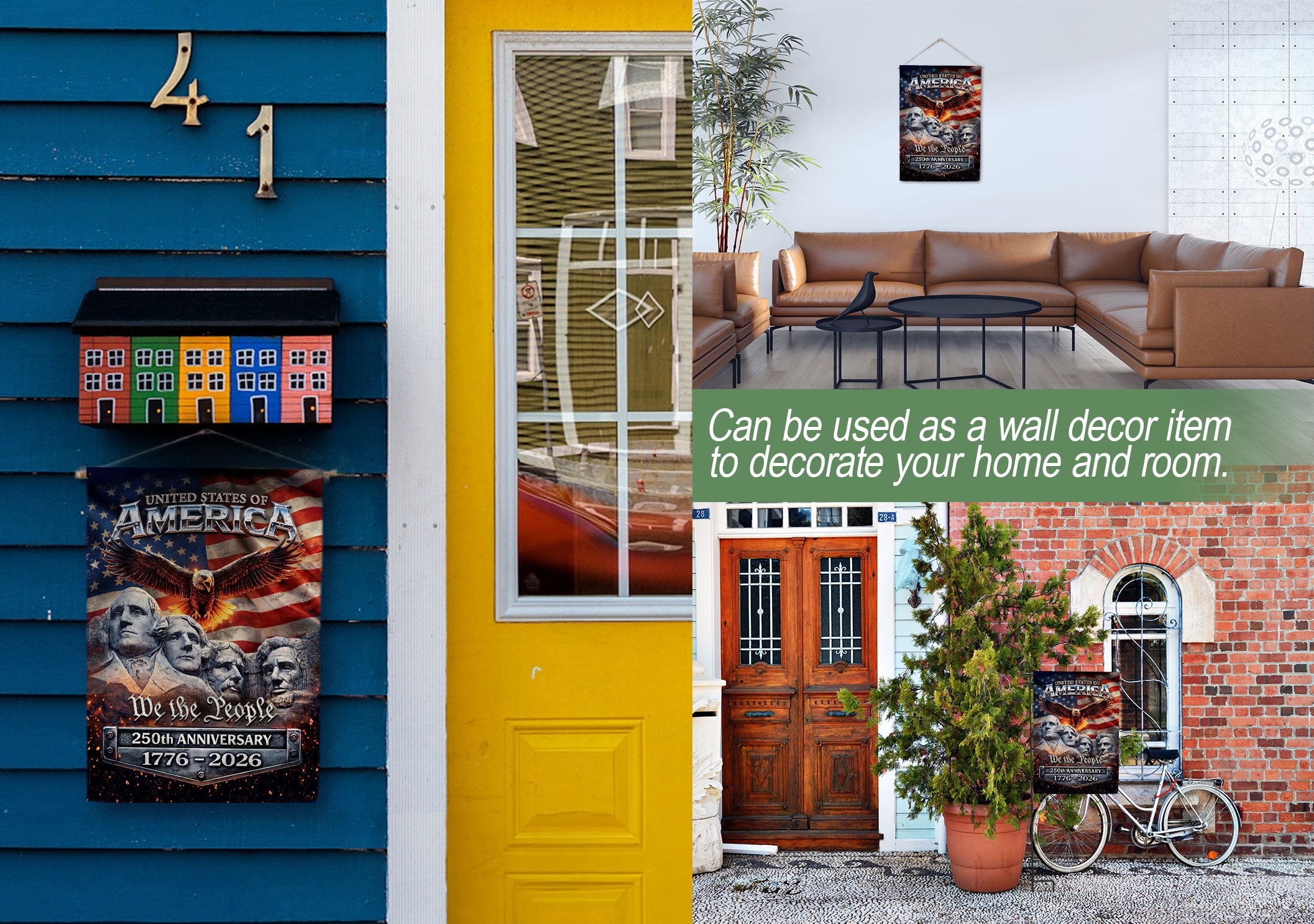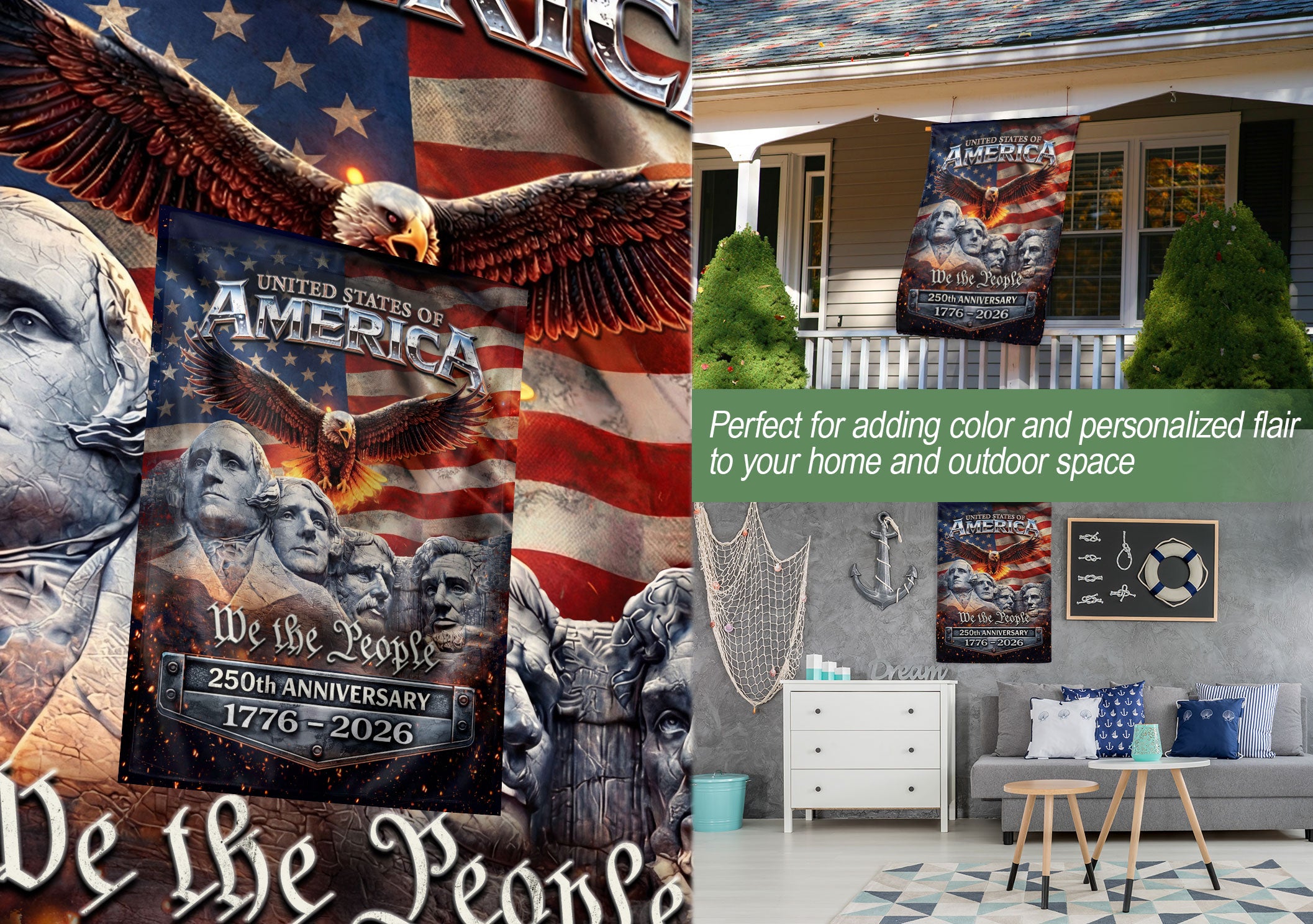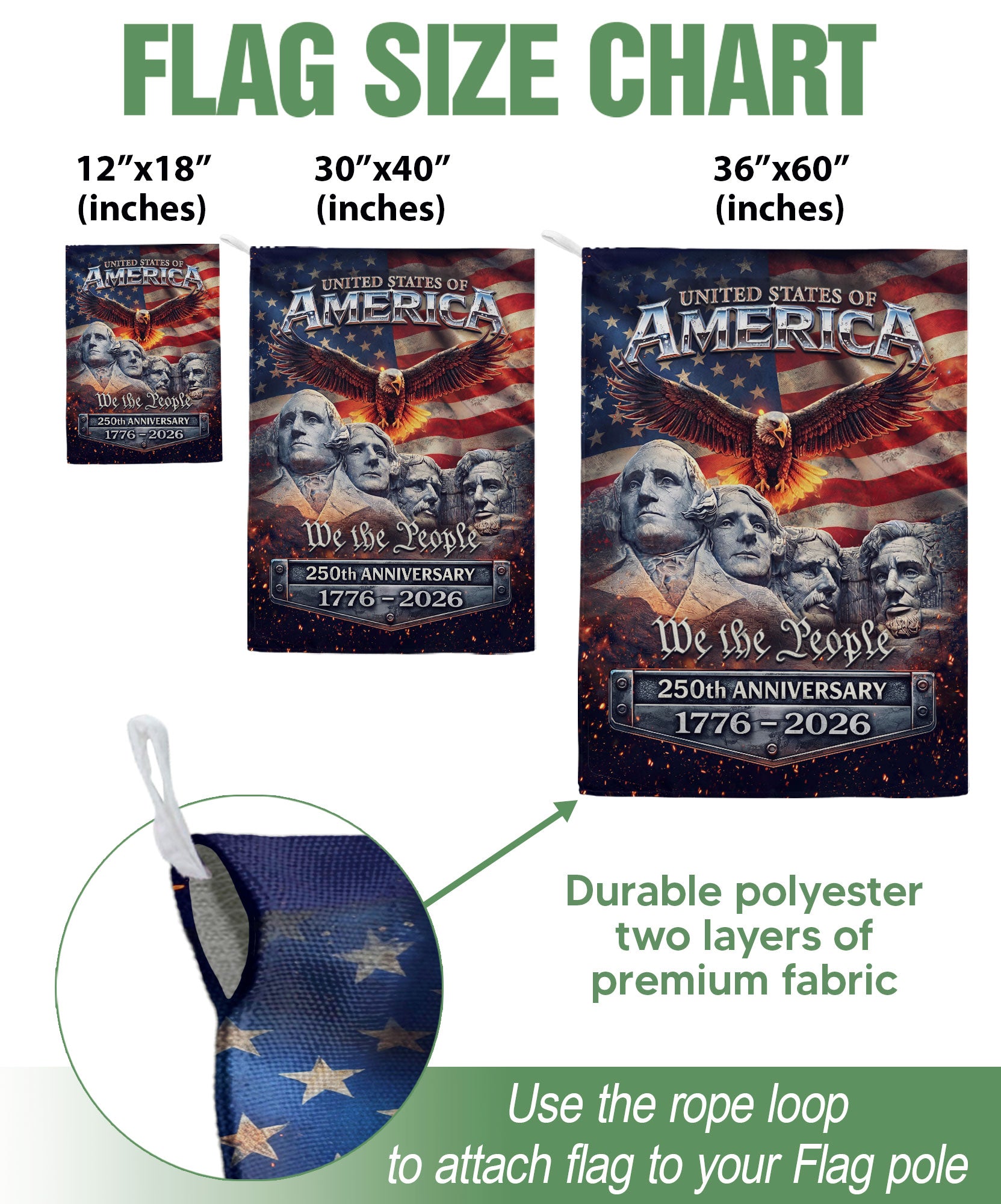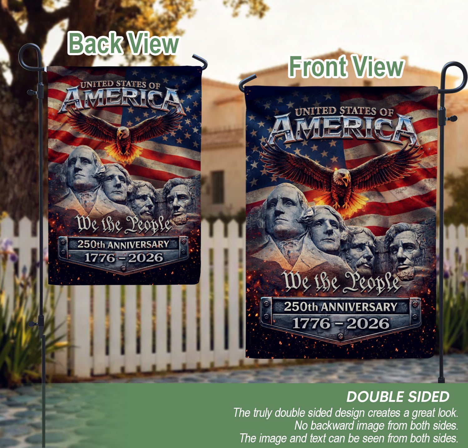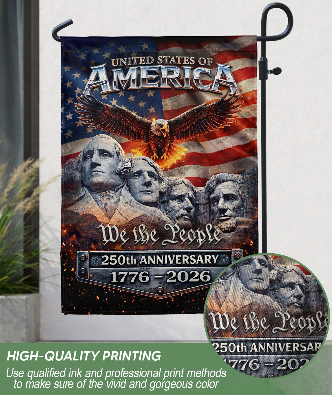 Celebrate 250 years of American independence with this patriotic garden flag spanning 1776-2026. Featuring a striking design with the iconic Mount Rushmore presidents, a majestic soaring eagle, and the bold stars and stripes of the American flag, this double-sided yard flag delivers vibrant, weather-resistant decor for your outdoor space. Perfect for porches, gardens, mailboxes, or patios, it honors the USA’s historic legacy and fosters national pride. Crafted for durability to withstand outdoor elements, ensuring long-lasting display of your patriotism during the semiquincentennial festivities.