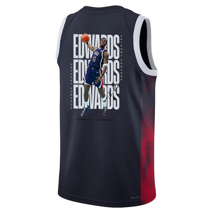 Elevate your basketball style with the Anthony Edwards 5 Key Player USA Basketball 2024 Swingman Player Jersey in navy multicolor. This lightweight, breathable sports jersey is crafted from 100% polyester for optimal comfort and durability during training, games, or casual everyday wear. The classic fit ensures easy layering and pairing with shorts, joggers, or jeans, while the clean design captures fan-inspired vibes without official affiliation.